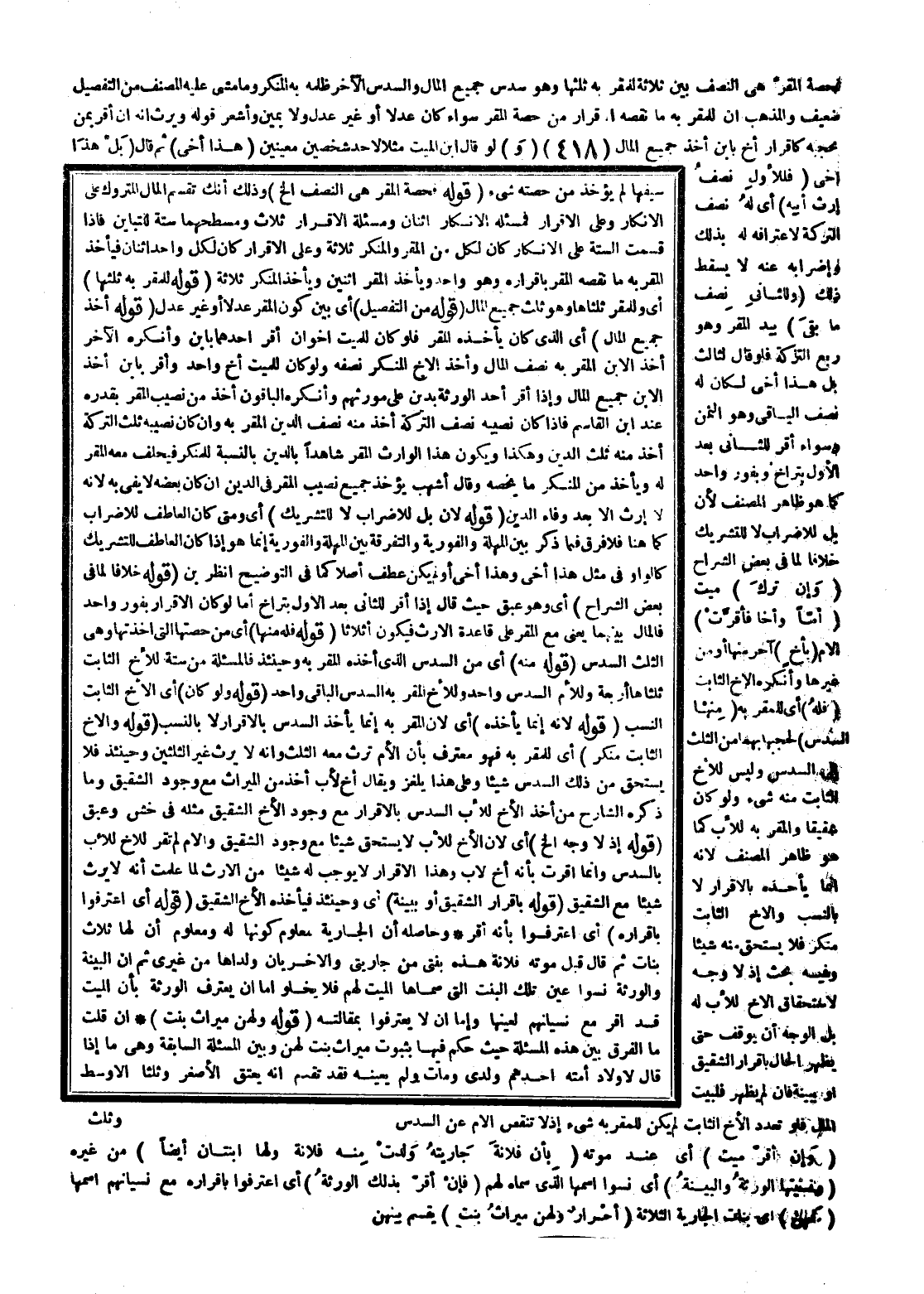 فَحِصَّةُ الْمُقِرِّ هِيَ النِّصْفُ بَيْنَ ثَلَاثَةٍ لِلْمُقَرِّ بِهِ ثُلُثُهَا، وَهُوَ سُدُسُ جَمِيعِ الْمَالِ، وَالسُّدُسُ الْآخَرُ ظَلَمَهُ بِهِ الْمُنْكِرُ وَمَا مَشَى عَلَيْهِ الْمُصَنِّفُ مِنْ التَّفْصِيلِ ضَعِيفٌ، وَالْمَذْهَبُ أَنَّ لِلْمُقَرِّ بِهِ مَا نَقَصَهُ الْإِقْرَارُ مِنْ حِصَّةِ الْمُقِرِّ سَوَاءً كَانَ عَدْلًا، أَوْ غَيْرَ عَدْلٍ وَلَا يَمِينَ، وَأَشْعَرَ قَوْلُهُ وَيَرِثُ أَنَّهُ إنْ أَقَرَّ بِمَنْ يَحْجُبُهُ كَإِقْرَارِ أَخٍ بِابْنٍ أَخَذَ جَمِيعَ الْمَالِ (وَ) لَوْ قَالَ ابْنُ الْمَيِّتِ مَثَلًا لِأَحَدِ شَخْصَيْنِ مُعَيَّنَيْنِ (هَذَا أَخِي) ، ثُمَّ قَالَ (بَلْ) هَذَا أَخِي (فَلِلْأَوَّلِ نِصْفُ إرْثِ أَبِيهِ) أَيْ لَهُ نِصْفُ التَّرِكَةِ لِاعْتِرَافِهِ لَهُ بِذَلِكَ، وَإِضْرَابُهُ عَنْهُ لَا يُسْقِطُ ذَلِكَ (وَلِلثَّانِي نِصْفُ مَا بَقِيَ) بِيَدِ الْمُقِرِّ، وَهُوَ رُبُعُ التَّرِكَةِ فَلَوْ قَالَ لِثَالِثٍ، بَلْ هَذَا أَخِي لَكَانَ لَهُ نِصْفُ الْبَاقِي، وَهُوَ الثُّمُنُ وَسَوَاءً أَقَرَّ لِلثَّانِي بَعْدَ الْأَوَّلِ بِتَرَاخٍ، أَوْ بِفَوْرٍ وَاحِدٍ كَمَا هُوَ ظَاهِرُ الْمُصَنِّفِ؛ لِأَنَّ، بَلْ لِلْإِضْرَابِ لَا لِلتَّشْرِيكِ خِلَافًا لِمَا فِي بَعْضِ الشُّرَّاحِ.
