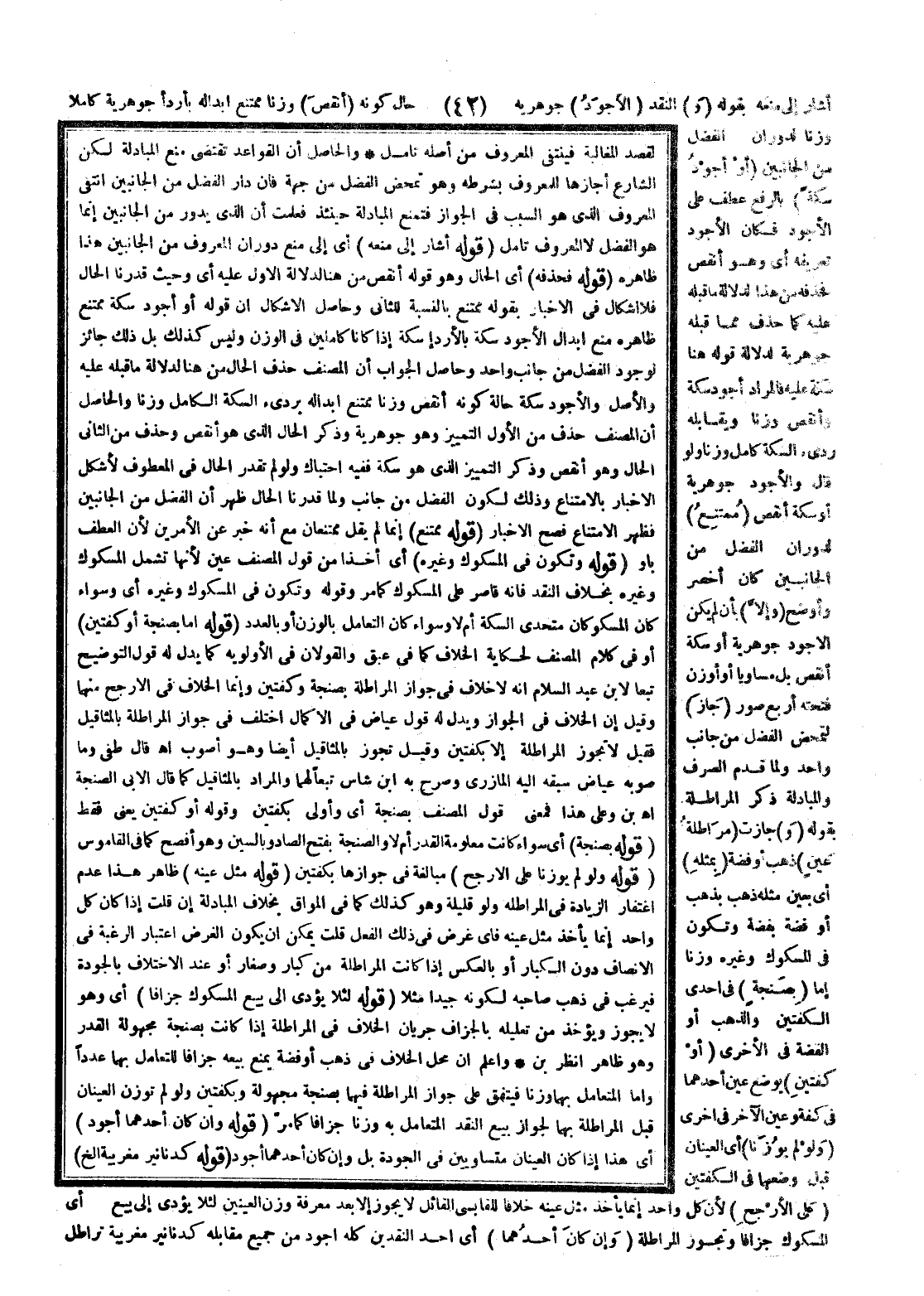 أَشَارَ إلَى مَنْعِهِ بِقَوْلِهِ (و) النَّقْدُ (الْأَجْوَدُ) جَوْهَرِيَّةً حَالَ كَوْنِهِ (أَنْقَصَ) وَزْنًا مُمْتَنِعٌ إبْدَالُهُ بِأَرْدَأَ جَوْهَرِيَّةٍ كَامِلًا وَزْنًا لِدَوَرَانِ الْفَضْلِ مِنْ الْجَانِبَيْنِ (أَوْ أَجْوَدُ سِكَّةً) بِالرَّفْعِ عُطِفَ عَلَى الْأَجْوَدِ فَكَانَ الْأَجْوَدُ تَعْرِيفُهُ أَيْ وَهُوَ أَنْقَصُ فَحَذَفَهُ مِنْ هَذَا لِدَلَالَةِ مَا قَبْلَهُ عَلَيْهِ كَمَا حُذِفَ مِمَّا قَبْلَهُ جَوْهَرِيَّةً لِدَلَالَةِ قَوْلِهِ هُنَا سِكَّةً عَلَيْهِ فَالْمُرَادُ: أَجْوَدُ سِكَّةً وَأَنْقَصَ وَزْنًا وَيُقَابِلُهُ رَدِيءُ السِّكَّةِ كَامِلٌ وَزْنًا، وَلَوْ قَالَ وَالْأَجْوَدُ جَوْهَرِيَّةً أَوْ سِكَّةً أَنْقَصَ (مُمْتَنِعٌ) لَدَوْرَانِ الْفَضْلِ مِنْ الْجَانِبَيْنِ كَانَ أَخْصَرَ وَأَوْضَحَ (وَإِلَّا) بِأَنْ لَمْ يَكُنْ الْأَجْوَدُ جَوْهَرِيَّةً أَوْ سِكَّةً أَنْقَصَ بَلْ مُسَاوِيًا أَوْ أَوْزَنَ فَتَحْتُهُ أَرْبَعُ صُوَرٍ (جَازَ) لِتَمَحُّضِ الْفَضْلِ مِنْ جَانِبٍ وَاحِدٍ.