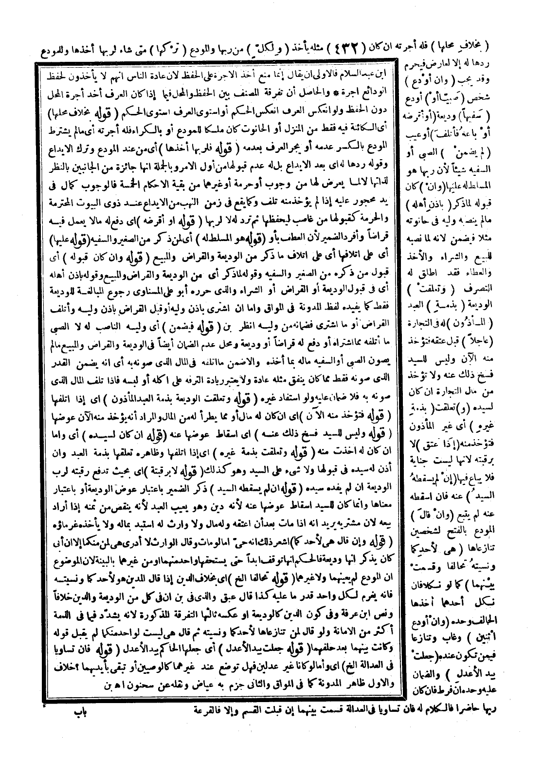 (قَوْلُهُ وَتَعَلَّقَتْ الْوَدِيعَةُ بِذِمَّةِ الْعَبْدِ الْمَأْذُونِ) أَيْ إذَا أَتْلَفَهَا (قَوْلُهُ فَتُؤْخَذُ مِنْهُ الْآنَ) أَيْ إنْ كَانَ لَهُ مَالٌ، أَوْ مِمَّا يَطْرَأُ لَهُ مِنْ الْمَالِ، وَالْمُرَادُ أَنَّهُ يُؤْخَذُ مِنْهُ الْآنَ عِوَضُهَا (قَوْلُهُ وَلَيْسَ لِلسَّيِّدِ فَسْخُ ذَلِكَ عَنْهُ) أَيْ إسْقَاطُ عِوَضِهَا عَنْهُ (قَوْلُهُ إنْ كَانَ لِسَيِّدِهِ) أَيْ وَأَمَّا إنْ كَانَ لَهُ أُخِذَتْ مِنْهُ (قَوْلُهُ وَتَعَلَّقَتْ بِذِمَّةِ غَيْرِهِ) أَيْ إذَا أَتْلَفَهَا وَظَاهِرُهُ تَعَلُّقُهَا بِذِمَّةِ الْعَبْدِ، وَإِنْ أَذِنَ لَهُ سَيِّدُهُ فِي قَبُولِهَا وَلَا شَيْءَ عَلَى السَّيِّدِ، وَهُوَ كَذَلِكَ (قَوْلُهُ لَا بِرَقَبَتِهِ) أَيْ بِحَيْثُ تُدْفَعُ رَقَبَتُهُ لِرَبِّ الْوَدِيعَةِ إنْ لَمْ يَفْدِهِ سَيِّدُهُ (قَوْلُهُ إنْ لَمْ يُسْقِطْهُ السَّيِّدُ) ذَكَرَ الضَّمِيرَ بِاعْتِبَارِ عِوَضِ الْوَدِيعَةِ، أَوْ بِاعْتِبَارِ مَعْنَاهَا، وَإِنَّمَا كَانَ لِلسَّيِّدِ إسْقَاطُ عِوَضِهَا عَنْهُ؛ لِأَنَّهُ دَيْنٌ، وَهُوَ يَعِيبُ الْعَبْدَ؛ لِأَنَّهُ يُنْقِصُ مِنْ ثَمَنِهِ إذَا أَرَادَ بَيْعَهُ؛ لِأَنَّ مُشْتَرِيَهُ يُرِيدُ أَنَّهُ إذَا مَاتَ بَعْدَ أَنْ أَعْتَقَهُ وَلَهُ مَالٌ وَلَا وَارِثَ لَهُ اسْتَبَدَّ بِمَالِهِ وَلَا يَأْخُذُهُ غُرَمَاؤُهُ (قَوْلُهُ، وَإِنْ قَالَ هِيَ لِأَحَدِكُمَا) أَشْعَرَ ذَلِكَ إنَّهُ حَيٌّ أَمَّا لَوْ مَاتَ وَقَالَ الْوَارِثُ لَا أَدْرِي هِيَ لِمَنْ مِنْكُمَا إلَّا أَنَّ أَبِي كَانَ يَذْكُرُ أَنَّهَا وَدِيعَةٌ فَالْحُكْمُ أَنَّهَا تُوقَفُ أَبَدًا حَتَّى يَسْتَحِقَّهَا وَاحِدٌ مِنْهُمَا، أَوْ مِنْ غَيْرِهِمَا بِالْبَيِّنَةِ؛ لِأَنَّ الْمَوْضُوعَ أَنَّ الْمُودَعَ لَمْ يُعَيِّنْهُمَا وَلَا غَيْرَهُمَا (قَوْلُهُ تَحَالَفَا إلَخْ) أَيْ بِخِلَافِ الدَّيْنِ إذَا قَالَ الْمَدِينُ هُوَ لِأَحَدِكُمَا وَنَسِيَتُهُ فَإِنَّهُ يَغْرَمُ لِكُلِّ وَاحِدٍ قَدْرَ مَا عَلَيْهِ كَذَا قَالَ عبق، وَاَلَّذِي فِي بْن أَنَّ فِي كُلٍّ مِنْ الْوَدِيعَةِ، وَالدَّيْنِ خِلَافًا وَنَصَّ ابْنُ عَرَفَةَ وَفِي كَوْنِ الدَّيْنِ كَالْوَدِيعَةِ أَوْ عَكْسِهِ ثَالِثُهَا التَّفْرِقَةُ الْمَذْكُورَةُ؛ لِأَنَّهُ يُشَدَّدُ فِيمَا فِي الذِّمَّةِ أَكْثَرَ مِنْ الْأَمَانَةِ وَلَوْ قَالَ لِمَنْ تَنَازَعَاهَا لِأَحَدِكُمَا وَنَسِيتُهُ، ثُمَّ قَالَ هِيَ لَيْسَتْ لِوَاحِدٍ مِنْكُمَا لَمْ يُقْبَلْ قَوْلُهُ وَكَانَتْ بَيْنَهُمَا بَعْدَ حَلِفِهِمَا (قَوْلُهُ جُعِلَتْ بِيَدِ الْأَعْدَلِ) أَيْ جَعَلَهَا الْحَاكِمُ بِيَدِ الْأَعْدَلِ (قَوْلُهُ فَإِنْ تُسَاوَيَا فِي الْعَدَالَةِ إلَخْ) أَيْ، وَأَمَّا لَوْ كَانَا غَيْرَ عَدْلَيْنِ فَهَلْ تُوضَعُ عِنْدَ غَيْرِهِمَا كَالْوَصِيَّيْنِ، أَوْ تَبْقَى بِأَيْدِيهِمَا؟ خِلَافٌ، وَالْأَوَّلُ ظَاهِرُ الْمُدَوَّنَةِ كَمَا فِي الْمَوَّاقِ، وَالثَّانِي جَزَمَ بِهِ عِيَاضٌ وَنَقَلَهُ عَنْ سَحْنُونٍ اهـ.