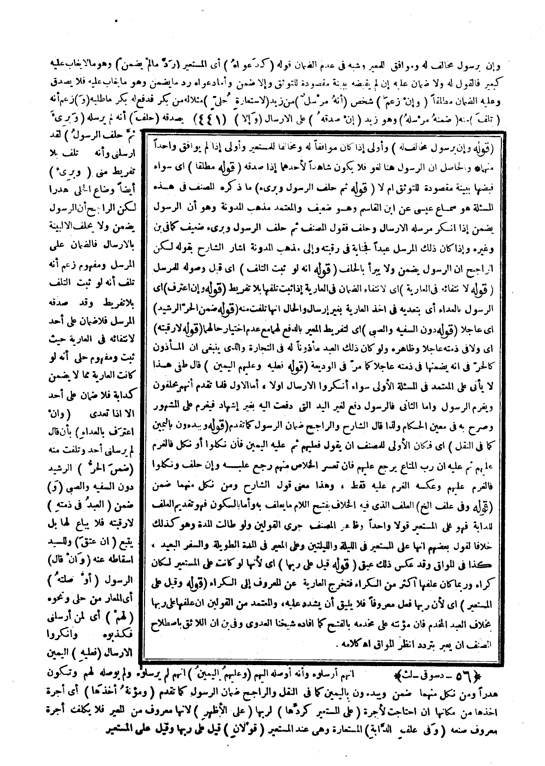 (قَوْلُهُ، ثُمَّ حَلَفَ الرَّسُولُ وَبَرِئَ) مَا ذَكَرَهُ الْمُصَنِّفُ فِي هَذِهِ الْمَسْأَلَةِ هُوَ سَمَاعُ عِيسَى عَنْ ابْنِ الْقَاسِمِ، وَهُوَ ضَعِيفٌ، وَالْمُعْتَمَدُ مَذْهَبُ الْمُدَوَّنَةِ، وَهُوَ أَنَّ الرَّسُولَ يَضْمَنُ إذَا أَنْكَرَ مُرْسِلُهُ الْأَرْسَالَ وَحَلَفَ فَقَوْلُ الْمُصَنِّفِ، ثُمَّ حَلَفَ الرَّسُولُ وَبَرِئَ ضَعِيفٌ كَمَا فِي بْن وَغَيْرِهِ، وَإِذَا كَانَ ذَلِكَ الْمُرْسِلُ عَبْدًا فَجِنَايَةٌ فِي رَقَبَتِهِ، وَإِلَى مَذْهَبِ الْمُدَوَّنَةِ أَشَارَ الشَّارِحُ بِقَوْلِهِ لَكِنَّ الرَّاجِحَ أَنَّ الرَّسُولَ يَضْمَنُ وَلَا يَبْرَأُ بِالْحَلِفِ (قَوْلُهُ إنَّهُ لَوْ ثَبَتَ التَّلَفُ) أَيْ قَبْلَ وُصُولِهِ لِلْمُرْسِلِ (قَوْلُهُ لِانْتِفَائِهِ فِي الْعَارِيَّةِ) أَيْ لِانْتِفَاءِ الضَّمَانِ فِي الْعَارِيَّةِ إذَا ثَبَتَ تَلَفُهَا بِلَا تَفْرِيطٍ.