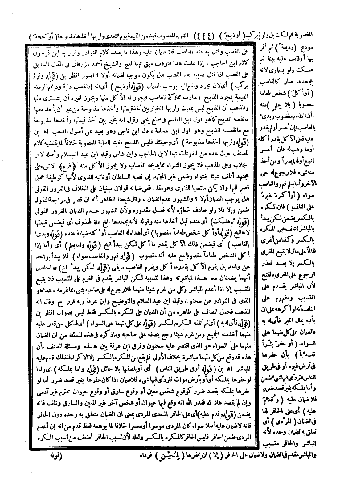 وَقِيلَ إنَّهُ يُخَيَّرُ بَيْنَ أَخْذِ قِيمَتِهَا، وَأَخْذِهَا مَذْبُوحَةً مَعَ مَا نَقَصَهُ الذَّبْحُ، وَهُوَ قَوْلُ ابْنِ مَسْلَمَةَ، قَالَ ابْنُ نَاجِيٍّ، وَهُوَ بَعِيدٌ عَنْ أُصُولِ الْمَذْهَبِ اهـ بْن (قَوْلُهُ وَلِرَبِّهَا أَخْذُهَا مَذْبُوحَةً) أَيْ وَحِينَئِذٍ فَلَيْسَ الذَّبْحُ مُفِيتًا لِلدَّابَّةِ الْمَغْصُوبَةِ خِلَافًا لِمَا يَقْتَضِيهِ كَلَامُ الْمُصَنِّفِ حَيْثُ عَدَّهُ مِنْ الْمُفَوِّتَاتِ تَبَعًا لِابْنِ الْحَاجِبِ وَابْنِ شَاسٍ وَقَبْلَهُ ابْنُ عَبْدِ السَّلَامِ، وَأَصْلُهُ لِابْنِ الْجَلَّابِ وَعَلَى الْمَذْهَبِ فَلَا يَجُوزُ الشِّرَاءُ مِمَّا يَذْبَحُهُ الْقَصَّابُ وَلَا يَجُوزُ الْأَكْلُ مِنْهُ (فَرْعٌ) لَا شَيْءَ عَلَى مُجْتَهِدٍ أَتْلَفَ شَيْئًا بِفَتْوَاهُ وَضَمِنَ غَيْرُ الْمُجْتَهِدِ إنْ نَصَّبَهُ السُّلْطَانُ، أَوْ نَائِبُهُ لِلْفَتْوَى؛ لِأَنَّهَا كَوَظِيفَةِ عَمَلٍ قَصَّرَ فِيهَا، وَإِلَّا يَكُنْ مُنْتَصِبًا لِلْفَتْوَى، وَهُوَ مُقَلِّدٌ فَفِي ضَمَانِهِ قَوْلَانِ مَبْنِيَّانِ عَلَى الْخِلَافِ فِي الْغُرُورِ الْقَوْلِيِّ هَلْ يُوجِبُ الضَّمَانَ أَمْ لَا؟ ، وَالْمَشْهُورُ عَدَمُ الضَّمَانِ، وَقَالَ شَيْخُنَا الظَّاهِرُ أَنَّهُ إنْ قَصَّرَ فِي مُرَاجَعَةِ النُّقُولِ ضَمِنَ، وَإِلَّا فَلَا وَلَوْ صَادَفَ خَطَؤُهُ؛ لِأَنَّهُ فِعْلُ مَقْدُورِهِ؛ وَلِأَنَّ الْمَشْهُورَ عَدَمُ الضَّمَانِ بِالْغُرُورِ الْقَوْلِيِّ.