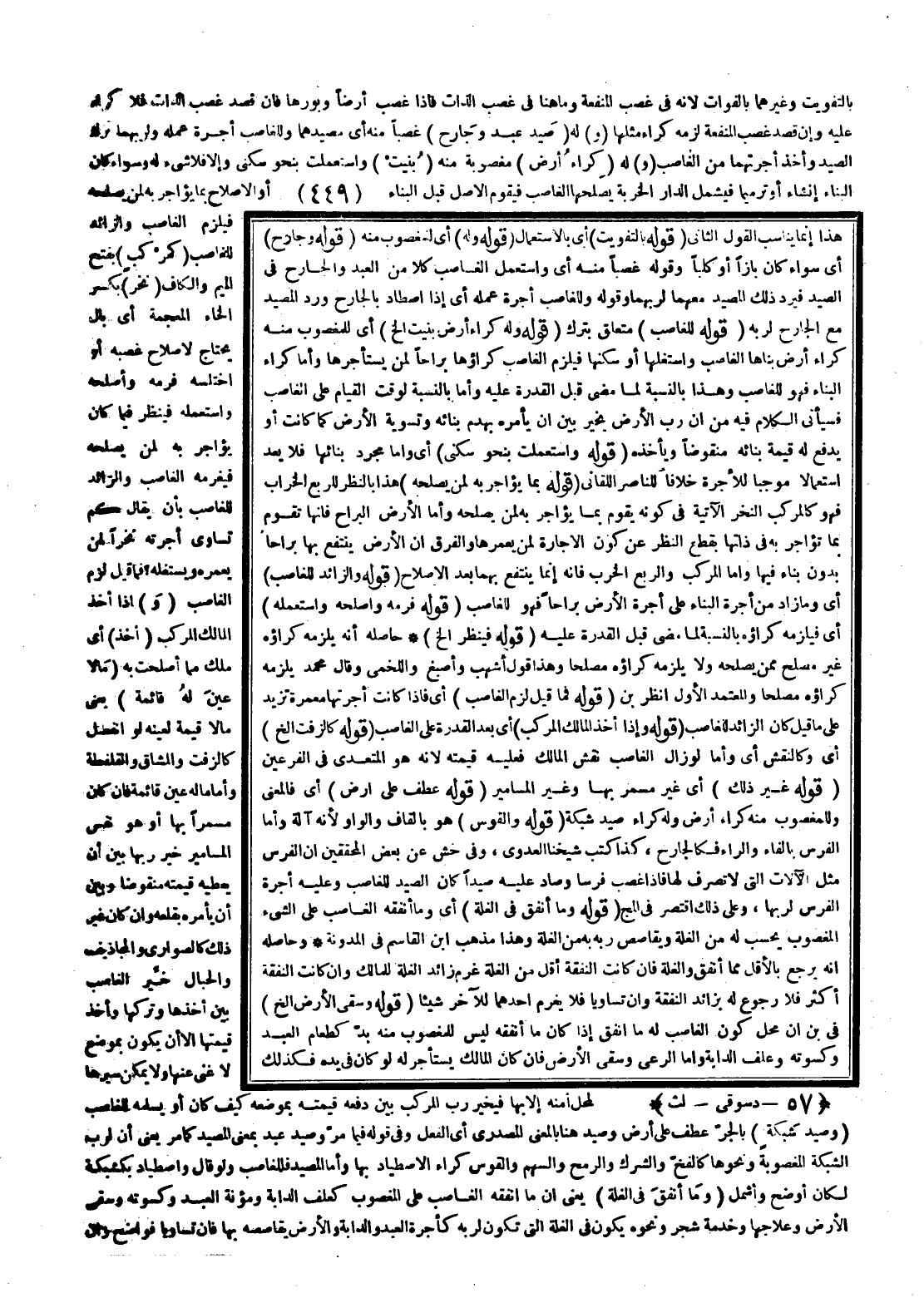 وَأَمَّا كِرَاءُ الْبِنَاءِ فَهُوَ لِلْغَاصِبِ، وَهَذَا بِالنِّسْبَةِ لِمَا مَضَى قَبْلَ الْقُدْرَةِ عَلَيْهِ، وَأَمَّا بِالنِّسْبَةِ لِوَقْتِ الْقِيَامِ عَلَى الْغَاصِبِ فَسَيَأْتِي الْكَلَامُ فِيهِ مِنْ أَنَّ رَبَّ الْأَرْضِ يُخَيَّرُ بَيْنَ أَنْ يَأْمُرَهُ بِهَدْمِ بِنَائِهِ وَتَسْوِيَةِ الْأَرْضِ كَمَا كَانَتْ، أَوْ يَدْفَعَ لَهُ قِيمَةَ بِنَائِهِ مَنْقُوضًا وَيَأْخُذَهُ (قَوْلُهُ وَاسْتُعْمِلَتْ بِنَحْوِ سُكْنَى) أَيْ، وَأَمَّا مُجَرَّدُ بِنَائِهَا فَلَا يُعَدُّ اسْتِعْمَالًا مُوجِبًا لِلْأُجْرَةِ خِلَافًا لِلنَّاصِرِ اللَّقَانِيِّ (قَوْلُهُ بِمَا يُؤَاجَرُ بِهِ لِمَنْ يُصْلِحُهُ) هَذَا بِالنَّظَرِ لِلرَّبْعِ الْخَرَابِ فَهُوَ كَالْمَرْكَبِ النَّخِرِ الْآتِيَةِ فِي كَوْنِهِ يُقَوَّمُ بِمَا يُؤَاجَرُ بِهِ لِمَنْ يُصْلِحُهُ، وَأَمَّا الْأَرْضُ الْبَرَاحُ فَإِنَّهَا تُقَوَّمُ بِمَا تُؤَاجَرُ بِهِ فِي ذَاتِهَا بِقَطْعِ النَّظَرِ عَنْ كَوْنِ الْإِجَارَةِ لِمَنْ يُعَمِّرُهَا، وَالْفَرْقُ أَنَّ الْأَرْضَ يُنْتَفَعُ بِهَا بَرَاحًا بِدُونِ بِنَاءٍ فِيهَا.