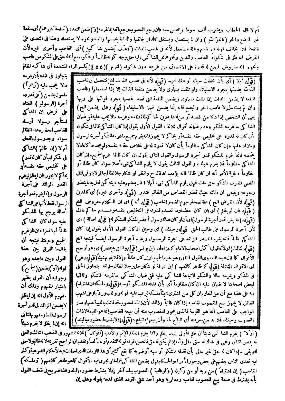قَالَ ح وَانْظُرْ لَوْ شَكَا رَجُلًا لِظَالِمٍ جَائِرٍ لَا يَتَوَقَّى قَتْلَ النَّفْسِ فَضَرَبَ الْمَشْكُوَّ حَتَّى مَاتَ فَهَلْ يَلْزَمُ الشَّاكِيَ شَيْءٌ أَمْ لَا؟ قَالَ بَعْضُهُمْ عَلَيْهِ دِيَتُهُ كَمَنْ فَعَلَ بِهِ مَا يَتَعَذَّرُ رُجُوعُهُ وَيَنْبَغِي أَنَّ ذَلِكَ حَيْثُ تَعَذَّرَ الْقِصَاصُ مِنْ الظَّالِمِ فَتَدَبَّرْ (قَوْلُهُ، وَأَحْرَى غَيْرُهُ) أَيْ كَالْمَدِينِ (قَوْلُهُ؛ لِأَنَّ الْفَرْضَ إلَخْ) عِلَّةٌ لِصِحَّةِ رُجُوعِ الضَّمِيرِ لِلْغَاصِبِ (قَوْلُهُ أَنَّهُ) أَيْ أَنَّ الْكَلَامَ مَفْرُوضٌ إلَخْ (قَوْلُهُ فَإِنْ لَمْ يَظْلِمْ) أَيْ بِأَنْ كَانَ مَظْلُومًا لِعَدَمِ قُدْرَتِهِ عَلَى التَّخْلِيصِ بِنَفْسِهِ وَعَدَمِ حَاكِمٍ عَادِلٍ (قَوْلُهُ، وَإِنَّمَا يَغْرَمُ قَدْرَ أُجْرَةِ الرَّسُولِ) أَيْ أَنْ لَوْ كَانَ هُنَاكَ رَسُولٌ أَحْضَرَ الْمَشْكُوَّ لِلْمَشْكُوِّ لَهُ (قَوْلُهُ أَصَالَةً) أَيْ؛ لِأَنَّ أُجْرَةَ الرَّسُولِ عَلَى طَالِبِ الْحَقِّ (قَوْلُهُ وَحِينَئِذٍ) أَيْ وَحِينَ إذْ كَانَ الْقَوْلُ الْأَوَّلُ يَقُولُ إذَا كَانَ الشَّاكِي ظَالِمًا فَإِنَّهُ يَغْرَمُ الْقَدْرَ الزَّائِدَ عَلَى أُجْرَةِ الرَّسُولِ وَيَغْرَمُ أُجْرَةَ الرَّسُولِ أَيْضًا فَيُتَّجَهُ إلَخْ (قَوْلُهُ الثَّالِثِ) أَيْ؛ لِأَنَّهُ قَوْلُ أَكْثَرِ أَصْحَابِ الْإِمَامِ كَمَا عَزَاهُ لَهُمْ ابْنُ يُونُسَ (قَوْلُهُ، وَالْمُفْتَى بِهِ بِمِصْرَ) أَيْ، وَهُوَ أَرْجَحُ الْأَقْوَالِ كَمَا قَالَ شَيْخُنَا الْعَدَوِيُّ الْقَوْلُ الثَّانِي، وَهُوَ غُرْمُ الْجَمِيعِ إنْ كَانَ ظَالِمًا، وَإِلَّا فَلَا يَغْرَمُ شَيْئًا (قَوْلُهُ، وَهِيَ) أَيْ الْأَقْوَالُ الثَّلَاثَةُ.