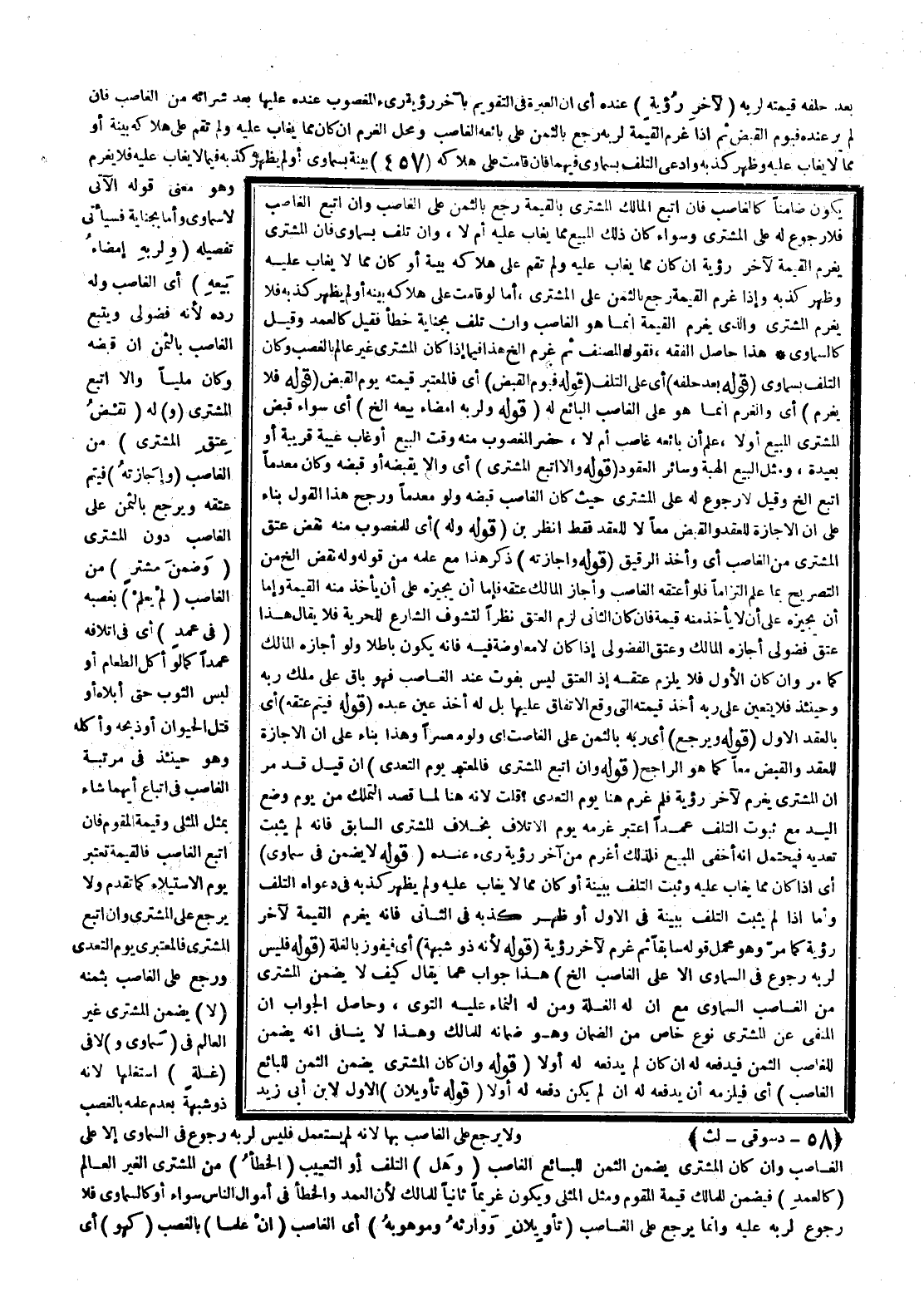 وَأَمَّا إذَا لَمْ يَثْبُتْ التَّلَفُ بِبَيِّنَةٍ فِي الْأَوَّلِ، أَوْ ظَهَرَ كَذِبُهُ فِي الثَّانِي فَإِنَّهُ يَغْرَمُ الْقِيمَةَ لِآخِرِ رُؤْيَةٍ كَمَا مَرَّ، وَهُوَ مَحْمَلُ قَوْلِهِ سَابِقًا، ثُمَّ غَرِمَ لِآخِرِ رُؤْيَةٍ (قَوْلُهُ؛ لِأَنَّهُ ذُو شُبْهَةٍ) أَيْ فَيَفُوزُ بِالْغَلَّةِ (قَوْلُهُ فَلَيْسَ لِرَبِّهِ رُجُوعٌ فِي السَّمَاوِيِّ إلَّا عَلَى الْغَاصِبِ إلَخْ) هَذَا جَوَابٌ عَمَّا يُقَالُ كَيْفَ لَا يَضْمَنُ الْمُشْتَرِي مِنْ الْغَاصِبِ السَّمَاوِيَّ مَعَ أَنَّهُ لَهُ الْغَلَّةُ وَمَنْ لَهُ النَّمَاءُ عَلَيْهِ التَّوَى، وَحَاصِلُ الْجَوَابِ أَنَّ الْمَنْفِيَّ عَنْ الْمُشْتَرِي نَوْعٌ خَاصٌّ مِنْ الضَّمَانِ، وَهُوَ ضَمَانُهُ لِلْمَالِكِ، وَهَذَا لَا يُنَافِي أَنَّهُ يَضْمَنُ لِلْغَاصِبِ الثَّمَنَ فَيَدْفَعُهُ لَهُ إنْ كَانَ لَمْ يَدْفَعْهُ لَهُ أَوَّلًا (قَوْلُهُ، وَإِنْ كَانَ الْمُشْتَرِي يَضْمَنُ الثَّمَنَ لِلْبَائِعِ الْغَاصِبِ) أَيْ فَيَلْزَمُهُ أَنْ يَدْفَعَهُ لَهُ إنْ لَمْ يَكُنْ دَفَعَهُ لَهُ أَوَّلًا (قَوْلُهُ تَأْوِيلَانِ) الْأَوَّلُ لِابْنِ أَبِي زَيْدٍ