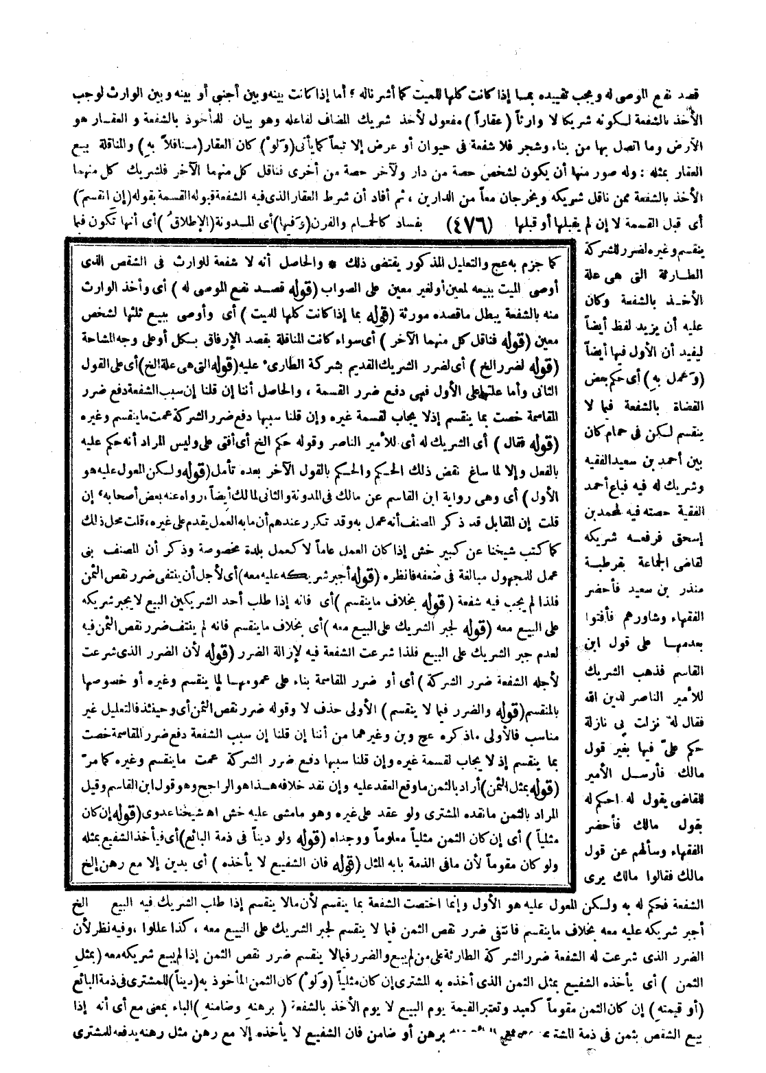 (قَوْلُهُ لِضَرَرٍ إلَخْ) أَيْ لِضَرَرِ الشَّرِيكِ الْقَدِيمِ بِشَرِكَةِ الطَّارِئِ عَلَيْهِ (قَوْلُهُ الَّتِي هِيَ عِلَّةٌ إلَخْ) أَيْ عَلَى الْقَوْلِ الثَّانِي، وَأَمَّا عِلَّتُهَا عَلَى الْأَوَّلِ فَهِيَ دَفْعُ ضَرَرِ الْقِسْمَةِ، وَالْحَاصِلُ أَنَّنَا إنْ قُلْنَا إنَّ سَبَبَ الشُّفْعَةِ دَفْعُ ضَرَرِ الْمُقَاسَمَةِ خُصَّتْ بِمَا يَنْقَسِمُ إذْ لَا يُجَابُ لِقِسْمَةِ غَيْرِهِ، وَإِنْ قُلْنَا سَبَبُهَا دَفْعَ ضَرَرِ الشَّرِكَةِ عَمَّتْ مَا يَنْقَسِمُ وَغَيْرَهُ (قَوْلُهُ فَقَالَ) أَيْ الشَّرِيكُ لَهُ أَيْ لِلْأَمِيرِ النَّاصِرِ وَقَوْلُهُ حُكِمَ إلَخْ أَيْ أُفْتِيَ عَلَيَّ وَلَيْسَ الْمُرَادُ أَنَّهُ حُكِمَ عَلَيْهِ بِالْفِعْلِ، وَإِلَّا لَمَا سَاغَ نَقْضُ ذَلِكَ الْحُكْمِ، وَالْحُكْمُ بِالْقَوْلِ الْآخَرِ بَعْدَهُ تَأَمَّلْ (قَوْلُهُ وَلَكِنَّ الْمُعَوَّلَ عَلَيْهِ) هُوَ (الْأَوَّلُ) أَيْ، وَهِيَ رِوَايَةُ ابْنِ الْقَاسِمِ عَنْ مَالِكٍ فِي الْمُدَوَّنَةِ، وَالثَّانِي لِمَالِكٍ أَيْضًا، رَوَاهُ عَنْهُ بَعْضُ أَصْحَابِهِ، إنْ قُلْت إنَّ الْمُقَابِلَ قَدْ ذَكَرَ الْمُصَنِّفُ أَنَّهُ عُمِلَ بِهِ وَقَدْ تَكَرَّرَ عِنْدَهُمْ أَنَّ مَا بِهِ الْعَمَلُ يُقَدَّمُ عَلَى غَيْرِهِ، قُلْتُ مَحَلُّ ذَلِكَ كَمَا كَتَبَ شَيْخُنَا عَنْ كَبِيرِ خش إذَا كَانَ الْعَمَلُ عَامًّا لَا كَعَمَلِ بَلْدَةٍ مَخْصُوصَةٍ، وَذُكِرَ أَنَّ الْمُصَنِّفَ بَنَى عُمِلَ لِلْمَجْهُولِ مُبَالَغَةً فِي ضَعْفِهِ فَانْظُرْهُ (قَوْلُهُ أُجْبِرَ شَرِيكُهُ عَلَيْهِ مَعَهُ) أَيْ لِأَجْلِ أَنْ يَنْتَفِيَ ضَرَرَ نَقْصِ الثَّمَنِ فَلِذَا لَمْ يَجِبْ فِيهِ شُفْعَةٌ (قَوْلُهُ بِخِلَافِ مَا يَنْقَسِمُ) أَيْ فَإِنَّهُ إذَا طَلَبَ أَحَدُ الشَّرِيكَيْنِ الْبَيْعَ لَا يُجْبَرُ شَرِيكُهُ عَلَى الْبَيْعِ مَعَهُ (قَوْلُهُ لِجَبْرِ الشَّرِيكِ عَلَى الْبَيْعِ مَعَهُ) أَيْ بِخِلَافِ مَا يَنْقَسِمُ فَإِنَّهُ لَمْ يَنْتِفْ ضَرَرُ نَقْصِ الثَّمَنِ فِيهِ لِعَدَمِ جَبْرِ الشَّرِيكِ عَلَى الْبَيْعِ فَلِذَا شُرِعَتْ الشُّفْعَةُ فِيهِ لِإِزَالَةِ الضَّرَرِ (قَوْلُهُ؛ لِأَنَّ الضَّرَرَ الَّذِي شُرِعَتْ لِأَجْلِهِ الشُّفْعَةُ ضَرَرُ الشَّرِكَةِ) أَيْ، أَوْ ضَرَرُ الْمُقَاسَمَةِ بِنَاءً عَلَى عُمُومِهَا لِمَا يَنْقَسِمُ وَغَيْرِهِ، أَوْ خُصُوصِهَا بِالْمُنْقَسِمِ (قَوْلُهُ، وَالضَّرَرُ فِيمَا لَا يَنْقَسِمُ) الْأَوْلَى حَذْفُ لَا وَقَوْلُهُ ضَرَرُ نَقْصِ الثَّمَنِ أَيْ وَحِينَئِذٍ فَالتَّعْلِيلُ غَيْرُ مُنَاسِبٍ فَالْأَوْلَى مَا ذَكَرَهُ عج وبن وَغَيْرُهُمَا مِنْ أَنَّنَا إنْ قُلْنَا إنَّ سَبَبَ الشُّفْعَةِ دَفْعُ ضَرَرِ الْمُقَاسَمَةِ خُصَّتْ بِمَا يَنْقَسِمُ إذْ لَا يُجَابُ لِقِسْمَةِ غَيْرِهِ، وَإِنْ قُلْنَا سَبَبُهَا دَفْعُ ضَرَرِ الشَّرِكَةِ عَمَّتْ مَا يَنْقَسِمُ وَغَيْرَهُ كَمَا مَرَّ (قَوْلُهُ بِمِثْلِ الثَّمَنِ) أَرَادَ بِالثَّمَنِ مَا وَقَعَ الْعَقْدُ عَلَيْهِ، وَإِنْ نُقِدَ خِلَافُهُ هَذَا هُوَ الرَّاجِحُ، وَهُوَ قَوْلُ ابْنِ الْقَاسِمِ وَقِيلَ الْمُرَادُ بِالثَّمَنِ مَا نَقَدَهُ الْمُشْتَرِي وَلَوْ عَقَدَ عَلَى غَيْرِهِ، وَهُوَ مَا مَشَى عَلَيْهِ خش اهـ.