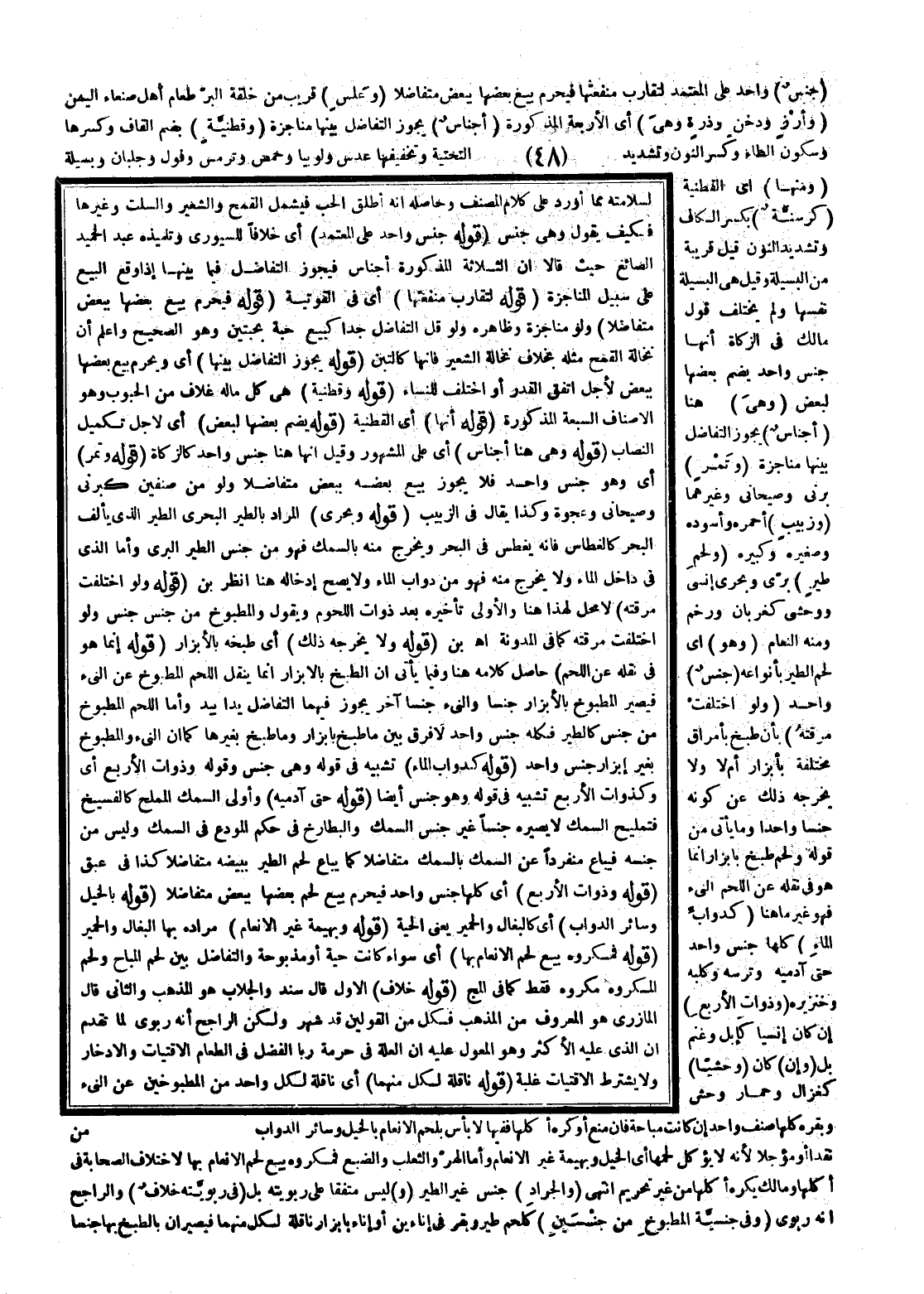 (وَتَمْرٍ) بِرْنِيٍّ وَصَيْحَانِيٌّ وَغَيْرِهِمَا (وَزَبِيبٍ) أَحْمَرِهِ وَأَسْوَدُهُ وَصَغِيرُهُ وَكَبِيرُهُ (وَلَحْمِ طَيْرٍ) بَرِّيٍّ وَبَحْرِيٍّ إنْسِيٍّ وَوَحْشِيٍّ كَغِرْبَانٍ وَرَخْمٍ وَمِنْهُ النَّعَامُ (وَهُوَ) أَيْ لَحْمُ الطَّيْرِ بِأَنْوَاعِهِ (جِنْسٌ) وَاحِدٌ (وَلَوْ اخْتَلَفَتْ مَرَقَتُهُ) بِأَنْ طُبِخَ بِأَمْرَاقٍ مُخْتَلِفَةٍ بِأَبْزَارٍ أَمْ لَا وَلَا يُخْرِجُهُ ذَلِكَ عَنْ كَوْنِهِ جِنْسًا وَاحِدًا وَمَا يَأْتِي مِنْ قَوْلِهِ وَلَحْمٌ طُبِخَ بِأَبْزَارٍ إنَّمَا هُوَ فِي نَقْلِهِ عَنْ اللَّحْمِ النِّيءِ فَهُوَ غَيْرُ مَا هُنَا (كَدَوَابِّ الْمَاءِ) كُلُّهَا جِنْسٌ وَاحِدٌ حَتَّى آدَمَيْهِ وَتُرْسِهِ وَكَلْبِهِ وَخِنْزِيرِهِ