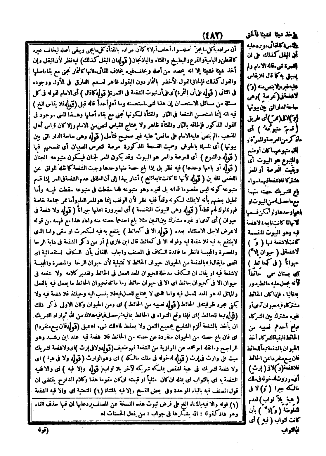 وَأَمَّا مَمَرُّ جَمَاعَةٍ خَاصَّةٍ فَهُوَ مَمْلُوكٌ لَهُمْ قَطْعًا (قَوْلُهُ، وَهِيَ الْبُيُوتُ الْمُنْقَسِمَةُ) أَيْ لِصَيْرُورَةِ أَهْلِهَا جِيرَانًا (قَوْلُهُ وَلَا شُفْعَةَ فِي حَيَوَانٍ) أَيْ آدَمِيٍّ وَغَيْرِهِ مُشْتَرَكٍ بَيْنَ اثْنَيْنِ مَثَلًا بَاعَ أَحَدُهُمَا حِصَّتَهُ مِنْهُ، وَأَعَادَ هَذَا مَعَ فَهْمِهِ مِنْ قَوْلِهِ لَا عُرِضَ لِأَجْلِ الِاسْتِثْنَاءِ بَعْدَهُ (قَوْلُهُ إلَّا فِي كَحَائِطٍ) يُنْتَفَعُ بِهِ فِيهِ كَحَرْثٍ، أَوْ سَقْيٍ.