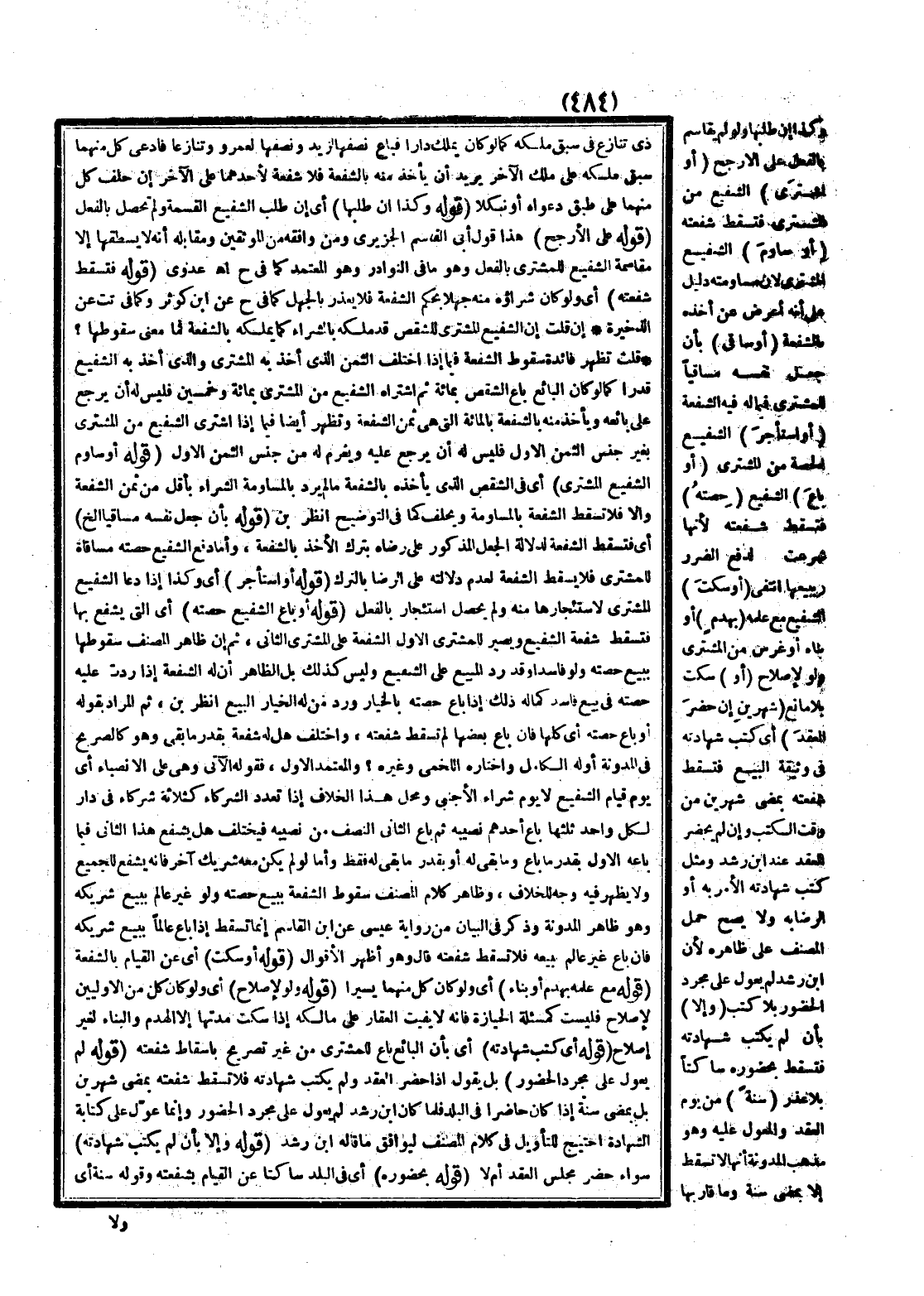 وَأَمَّا لَوْ لَمْ يَكُنْ مَعَهُ شَرِيكٌ آخَرُ فَإِنَّهُ يُشَفَّعُ لِلْجَمِيعِ وَلَا يَظْهَرُ فِيهِ وَجْهٌ لِلْخِلَافِ، وَظَاهِرُ كَلَامِ الْمُصَنِّفِ سُقُوطُ الشُّفْعَةِ بِبَيْعِ حِصَّتِهِ وَلَوْ غَيْرَ عَالِمٍ بِبَيْعِ شَرِيكِهِ، وَهُوَ ظَاهِرُ الْمُدَوَّنَةِ وَذُكِرَ فِي الْبَيَانِ مِنْ رِوَايَةِ عِيسَى عَنْ ابْنِ الْقَاسِمِ إنَّمَا تَسْقُطُ إذَا بَاعَ عَالِمًا بِبَيْعِ شَرِيكِهِ فَإِنْ بَاعَ غَيْرَ عَالِمٍ بِبَيْعِهِ فَلَا تَسْقُطُ شُفْعَتُهُ قَالَ، وَهُوَ أَظْهَرُ الْأَقْوَالِ (قَوْلُهُ، أَوْ سَكَتَ) أَيْ عَنْ الْقِيَامِ بِالشُّفْعَةِ (قَوْلُهُ مَعَ عِلْمِهِ بِهَدْمٍ، أَوْ بِنَاءٍ) أَيْ وَلَوْ كَانَ كُلٌّ مِنْهُمَا يَسِيرًا (قَوْلُهُ وَلَوْ لِإِصْلَاحٍ) أَيْ وَلَوْ كَانَ كُلٌّ مِنْ الْأُولَيَيْنِ لِإِصْلَاحٍ فَلَيْسَتْ كَمَسْأَلَةِ الْحِيَازَةِ فَإِنَّهُ لَا يُفِيتُ الْعَقَارَ عَلَى مَالِكِهِ إذَا سَكَتَ مُدَّتَهَا إلَّا الْهَدْمُ، وَالْبِنَاءُ لِغَيْرِ إصْلَاحٍ (قَوْلُهُ أَيْ كَتَبَ شَهَادَتَهُ) أَيْ بِأَنَّ الْبَائِعَ بَاعَ لِلْمُشْتَرِي مِنْ غَيْرِ تَصْرِيحٍ بِإِسْقَاطِ شُفْعَتِهِ (قَوْلُهُ لَمْ يُعَوَّلْ عَلَى مُجَرَّدِ الْحُضُورِ) ، بَلْ يَقُولُ إذَا حَضَرَ الْعَقْدَ وَلَمْ يَكْتُبْ شَهَادَتَهُ فَلَا تَسْقُطُ شُفْعَتُهُ بِمُضِيِّ شَهْرَيْنِ، بَلْ بِمُضِيِّ سَنَةٍ إذَا كَانَ حَاضِرًا فِي الْبَلَدِ فَلَمَّا كَانَ ابْنُ رُشْدٍ لَمْ يُعَوِّلْ عَلَى مُجَرَّدِ الْحُضُورِ، وَإِنَّمَا عَوَّلَ عَلَى كِتَابَةِ الشَّهَادَةِ اُحْتِيجَ لِلتَّأْوِيلِ فِي كَلَامِ الْمُصَنِّفِ لِيُوَافِقَ مَا قَالَهُ ابْنُ رُشْدٍ (قَوْلُهُ، وَإِلَّا بِأَنْ لَمْ يَكْتُبْ شَهَادَتَهُ) سَوَاءٌ حَضَرَ مَجْلِسَ الْعَقْدِ أَمْ لَا (قَوْلُهُ بِحُضُورِهِ) أَيْ فِي الْبَلَدِ سَاكِتًا عَنْ الْقِيَامِ بِشُفْعَتِهِ وَقَوْلُهُ سَنَةً أَيْ