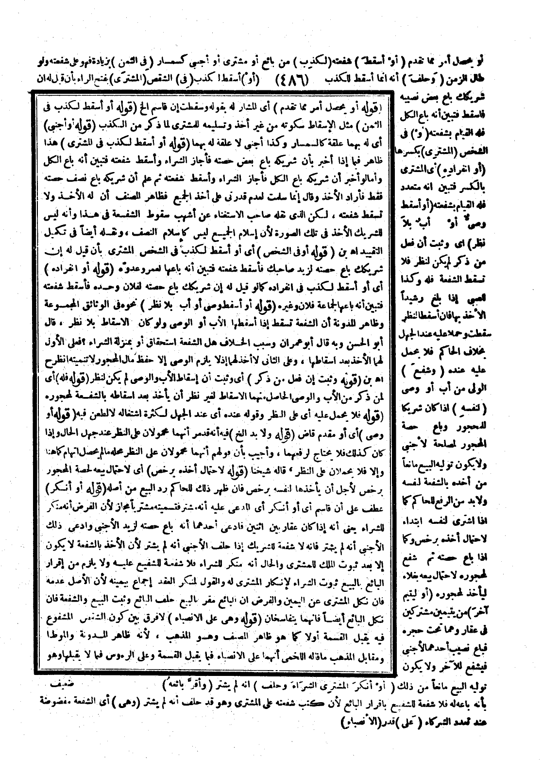 (قَوْلُهُ، أَوْ وَصِيٍّ) أَيْ، أَوْ مَقْدِمِ قَاضٍ (قَوْلُهُ وَلَا بُدَّ إلَخْ) فِيهِ أَنَّهُ قَدْ مَرَّ أَنَّهُمَا مَحْمُولَانِ عَلَى النَّظَرِ عِنْدَ جَهْلِ الْحَالِ، وَإِذَا كَانَ كَذَلِكَ فَلَا يُحْتَاجُ لِرَفْعِهِمَا، وَأُجِيبَ بِأَنَّ قَوْلَهُمْ إنَّهُمَا مَحْمُولَانِ عَلَى النَّظَرِ مَحَلُّهُ مَا لَمْ يَحْصُلْ إتْهَامٌ كَمَا هُنَا، وَإِلَّا فَلَا يُحْمَلَانِ عَلَى النَّظَرِ، قَالَهُ شَيْخُنَا (قَوْلُهُ لِاحْتِمَالِ أَخْذِهِ بِرُخْصٍ) أَيْ لِاحْتِمَالِ بَيْعِهِ لِحِصَّةِ الْمَحْجُورِ بِرُخْصٍ لِأَجْلِ أَنْ يَأْخُذَهَا لِنَفْسِهِ بِرُخْصٍ فَإِنْ ظَهَرَ ذَلِكَ لِلْحَاكِمِ رُدَّ الْبَيْعُ مِنْ أَصْلِهِ (قَوْلُهُ، أَوْ أَنْكَرَ) عَطْفٌ عَلَى أَنَّ قَاسَمَ أَيْ، أَوْ أَنْكَرَ أَيْ الْمُدَّعَى عَلَيْهِ أَنَّهُ مُشْتَرٍ فَتَسْمِيَتُهُ مُشْتَرِيًا مَجَازٌ؛ لِأَنَّ الْفَرْضَ أَنَّهُ مُنْكِرٌ لِلشِّرَاءِ يَعْنِي أَنَّهُ إذَا كَانَ عَقَارٌ بَيْنَ اثْنَيْنِ فَادَّعَى أَحَدُهُمَا أَنَّهُ بَاعَ حِصَّتَهُ لِزَيْدٍ الْأَجْنَبِيِّ وَادَّعَى ذَلِكَ الْأَجْنَبِيُّ أَنَّهُ لَمْ يَشْتَرِ فَإِنَّهُ لَا شُفْعَةَ لَلشَّرِيك إذَا حَلَفَ الْأَجْنَبِيُّ أَنَّهُ لَمْ يَشْتَرِ؛ لِأَنَّ الْأَخْذَ بِالشُّفْعَةِ لَا يَكُونُ إلَّا بَعْدَ ثُبُوتِ الْمِلْكِ لِلْمُشْتَرِي، وَالْحَالُ أَنَّهُ مُنْكِرٌ لِلشِّرَاءِ فَلَا شُفْعَةَ لِلشَّفِيعِ عَلَيْهِ وَلَا يَلْزَمُ مِنْ إقْرَارِ الْبَائِعِ بِالْبَيْعِ ثُبُوتُ الشِّرَاءِ لِإِنْكَارِ الْمُشْتَرِي لَهُ، وَالْقَوْلُ لِمُنْكِرِ الْعَقْدِ إجْمَاعٌ بِيَمِينِهِ؛ لِأَنَّ الْأَصْلَ عَدَمُهُ فَإِنْ نَكَلَ الْمُشْتَرِي عَنْ الْيَمِينِ، وَالْفَرْضُ أَنَّ الْبَائِعَ مُقِرٌّ بِالْبَيْعِ حَلَفَ الْبَائِعُ وَثَبَتَ الْبَيْعُ، وَالشُّفْعَةُ فَإِنْ نَكَلَ الْبَائِعُ أَيْضًا فَإِنَّهُمَا يَتَفَاسَخَانِ.