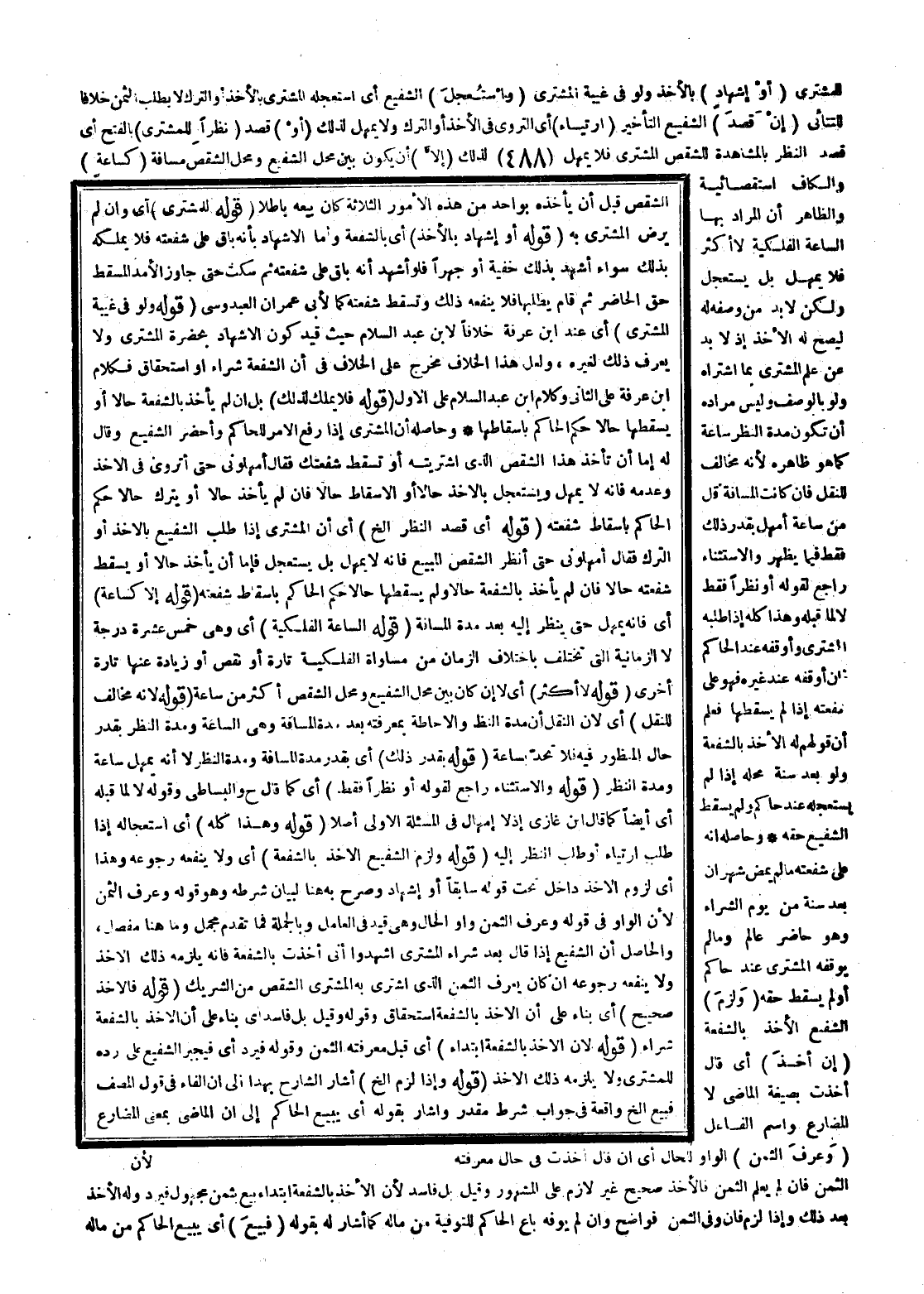 وَحَاصِلُهُ أَنَّهُ عَلَى شُفْعَتِهِ مَا لَمْ يَمْضِ شَهْرَانِ بَعْدَ سَنَةٍ مِنْ يَوْمِ الشِّرَاءِ، وَهُوَ حَاضِرٌ عَالِمٌ وَمَا لَمْ يُوقِفْهُ الْمُشْتَرِي عِنْدَ حَاكِمٍ، أَوْ لَمْ يَسْقُطْ حَقُّهُ.