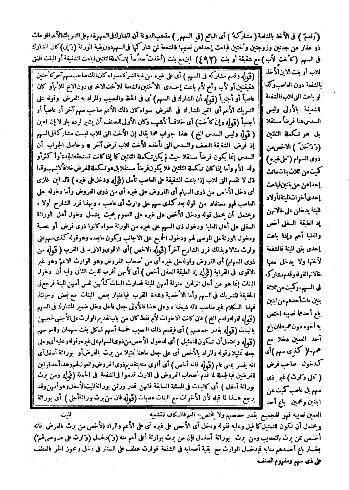 وَأَمَّا الْأَخَصِّيَّةُ وَشِدَّةُ الْقُرْبِ فَبِاعْتِبَارِ بَعْضِ الْبَنَاتِ مَعَ بَعْضٍ وَحِينَئِذٍ فَهَذَا الْكَلَامُ غَيْرُ مُنَاسِبٍ قَالَهُ شَيْخُنَا، وَعَلَى هَذَا فَالْأَوْلَى جَعْلُ فَاعِلِ دَخَلَ ضَمِيرَ الْمُشَارِكِ فِي السَّهْمِ (قَوْلُهُ لِقَوْلِهِ وَقُدِّمَ إلَخْ) فَإِنْ كَانَتْ الْأَخَوَاتُ لِأُمٍّ فَقَطْ كَانَ مِنْ بَابِ تَقْدِيمِ الْوَارِثِ عَلَى الْأَجْنَبِيِّ لِحَجْبِهِنَّ بِالْبَنَاتِ (قَوْلُهُ بِقَدْرِ حِصَصِهِمْ) أَيْ فَيُقْسَمُ ذَلِكَ النَّصِيبُ خَمْسَةَ أَسْهُمٍ لِكُلِّ بِنْتٍ سَهْمَانِ وَلِلْعَمِّ سَهْمٌ (قَوْلُهُ وَيُحْتَمَلُ أَنْ تَكُونَ لِلتَّمْثِيلِ) أَيْ لِدُخُولِ الْأَخَصِّ مِنْ ذَوِي السِّهَامِ عَلَى غَيْرِهِ وَقَوْلُهُ وَعَلَيْهِ أَيْ وَعَلَى جَعْلِهِ تَمْثِيلًا وَقَوْلُهُ الْمُرَادُ بِالْأَخَصِّ أَيْ عَلَى جَعْلِ مَا هُنَا تَمْثِيلًا مَنْ يَرِثُ بِالْفَرْضِ، أَوْ بِوَارِثٍ أَسْفَلَ أَيْ أَنَّهُ يُفَسَّرُ بِمَعْنًى عَامٍّ (قَوْلُهُ فَإِنَّهُ أَخَصُّ) أَيْ أَقْوَى مِنْهُ بِتَقْدِيمِ ذَوِي الْفُرُوضِ، وَالْعَوْلِ لَهُمْ وَهَذَا أَحَدُ قَوْلَيْنِ لِلْفَرْضَيْنِ فَبِالْجُمْلَةِ لَمَّا قُدِّمَ أَصْحَابُ الْفُرُوضِ فِي الْإِرْثِ قُدِّمُوا فِي الشُّفْعَةِ فِي الْجُمْلَةِ (قَوْلُهُ وَمَنْ يَرِثُ بِوَارِثٍ أَسْفَلَ) أَيْ كَالْبَنَاتِ فِي الْمَسْأَلَةِ السَّابِقَةِ فَإِنَّهُنَّ قَدْ وَرِثْنَ بِوِرَاثَةِ الْمَيِّتِ الْأَسْفَلِ، وَهُوَ أُمُّهُنَّ وَقَدْ يَرْجِعُ هَذَا لِمَا قَبْلَهُ؛ لِأَنَّ الْأَخَوَاتِ مَعَ الْبَنَاتِ عَصَبَاتٌ (قَوْلُهُ فَإِنَّ مَنْ يَرِثُ بِوِرَاثَةِ أَعْلَى) أَيْ بِوِرَاثَةِ