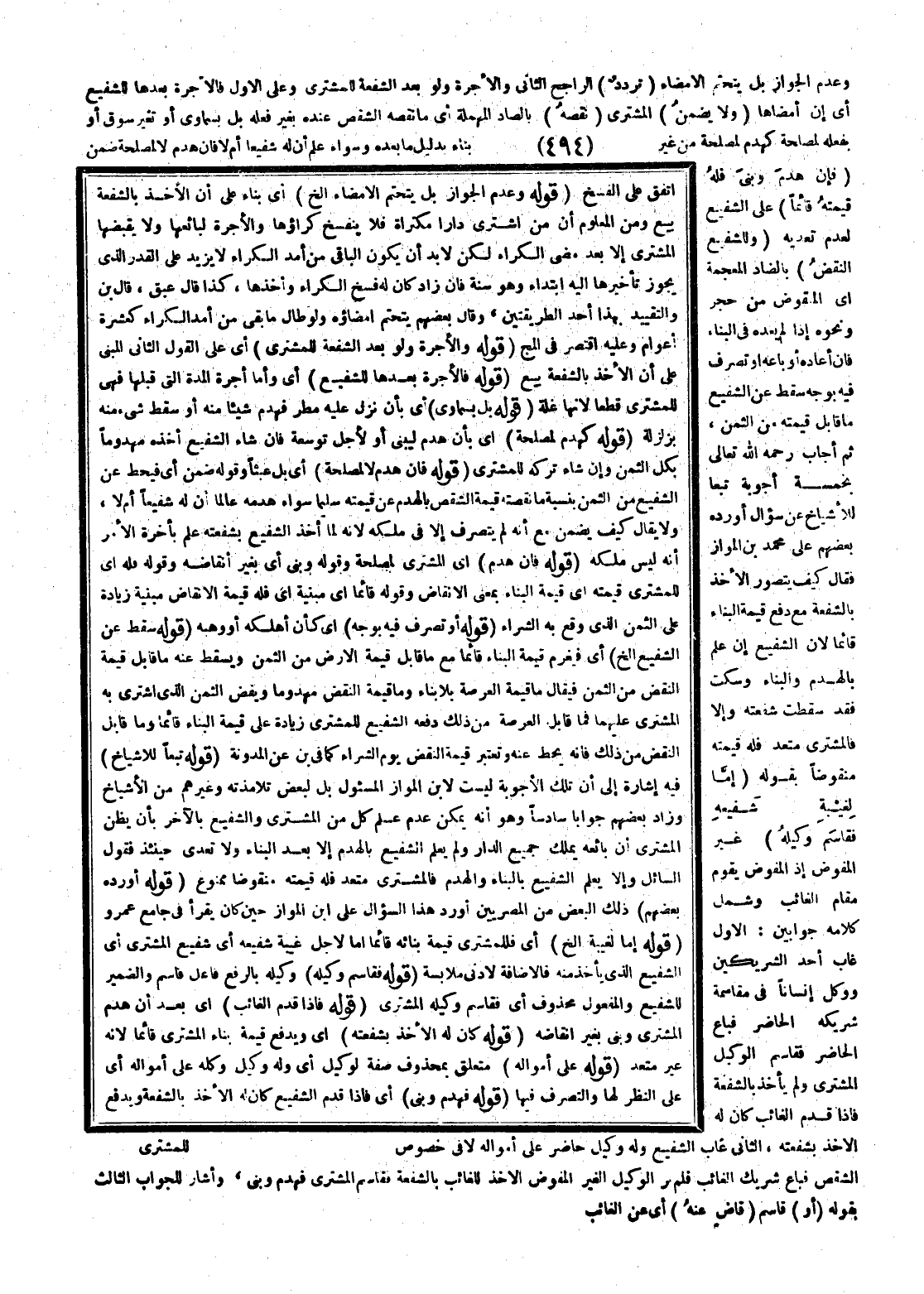 وَعَدَمِ الْجَوَازِ، بَلْ يَتَحَتَّمُ الْإِمْضَاءُ (تَرَدُّدٌ) الرَّاجِحُ الثَّانِي، وَالْأُجْرَةُ وَلَوْ بَعْدَ الشُّفْعَةِ لِلْمُشْتَرِي وَعَلَى الْأَوَّلِ فَالْأُجْرَةُ بَعْدَهَا لِلشَّفِيعِ أَيْ إنْ أَمْضَاهَا (وَلَا يَضْمَنُ) الْمُشْتَرِي (نَقْصَهُ) بِالصَّادِ الْمُهْمَلَةِ أَيْ مَا نَقَصَهُ الشِّقْصُ عِنْدَهُ بِغَيْرِ فِعْلِهِ، بَلْ بِسَمَاوِيٍّ، أَوْ تَغَيُّرِ سُوقٍ، أَوْ بِفِعْلِهِ لِمَصْلَحَةٍ كَهَدْمٍ لِمَصْلَحَةٍ مِنْ غَيْرِ بِنَاءٍ بِدَلِيلِ مَا بَعْدَهُ وَسَوَاءٌ عُلِمَ أَنَّ لَهُ شَفِيعًا أَمْ لَا فَإِنْ هُدِمَ لَا لِمَصْلَحَةٍ ضَمِنَ (فَإِنْ هُدِمَ وَبُنِيَ فَلَهُ قِيمَتُهُ قَائِمًا) عَلَى الشَّفِيعِ لِعَدَمِ تَعَدِّيهِ (وَلِلشَّفِيعِ النَّقْضُ) بِالضَّادِ الْمُعْجَمَةِ أَيْ الْمَنْقُوضُ مِنْ حَجَرٍ وَنَحْوِهِ إذَا لَمْ يُعِدْهُ فِي الْبِنَاءِ فَإِنْ أَعَادَهُ، أَوْ بَاعَهُ، أَوْ تَصَرَّفَ فِيهِ بِوَجْهٍ سَقَطَ عَنْ الشَّفِيعِ مَا قَابَلَ قِيمَتُهُ مِنْ الثَّمَنِ،، ثُمَّ أَجَابَ - رَحِمَهُ اللَّهُ تَعَالَى - بِخَمْسَةِ أَجْوِبَةٍ تَبَعًا لِلْأَشْيَاخِ عَنْ سُؤَالٍ، أَوْرَدَهُ بَعْضُهُمْ عَلَى مُحَمَّدِ بْنِ الْمَوَّازِ فَقَالَ كَيْفَ يُتَصَوَّرُ الْأَخْذُ بِالشُّفْعَةِ مَعَ دَفْعِ قِيمَةِ الْبِنَاءِ قَائِمًا؛ لِأَنَّ الشَّفِيعَ إنْ عَلِمَ بِالْهَدْمِ، وَالْبِنَاءِ وَسَكَتَ فَقَدْ سَقَطَتْ شُفْعَتُهُ، وَإِلَّا فَالْمُشْتَرِي مُعْتَدٍ فَلَهُ قِيمَتُهُ مَنْقُوضًا بِقَوْلِهِ (إمَّا لِغَيْبَةِ شَفِيعِهِ فَقَاسَمَ وَكِيلُهُ) غَيْرُ الْمُفَوَّضِ إذْ الْمُفَوَّضُ يَقُومُ مَقَامَ الْغَائِبِ وَشَمِلَ كَلَامُهُ جَوَابَيْنِ الْأَوَّلُ: غَابَ أَحَدُ الشَّرِيكَيْنِ وَوَكَّلَ إنْسَانًا فِي مُقَاسَمَةِ شَرِيكِهِ الْحَاضِرِ فَبَاعَ الْحَاضِرُ فَقَاسَمَ الْوَكِيلُ الْمُشْتَرِيَ وَلَمْ يَأْخُذْ بِالشُّفْعَةِ، وَإِذَا قَدِمَ الْغَائِبُ كَانَ لَهُ الْأَخْذُ بِشُفْعَتِهِ، الثَّانِي غَابَ الشَّفِيعُ وَلَهُ وَكِيلٌ حَاضِرٌ عَلَى أَمْوَالِهِ لَا فِي خُصُوصِ الشِّقْصِ فَبَاعَ شَرِيكُ الْغَائِبِ فَلَمْ يَرَ الْوَكِيلُ الْغَيْرُ الْمُفَوَّضِ الْأَخْذَ لِلْغَائِبِ بِالشُّفْعَةِ فَقَاسَمَ الْمُشْتَرِيَ فَهَدَمَ وَبَنَى، وَأَشَارَ لِلْجَوَابِ الثَّالِثِ بِقَوْلِهِ (أَوْ) قَاسَمَ (قَاضٍ عَنْهُ) أَيْ عَنْ الْغَائِبِ