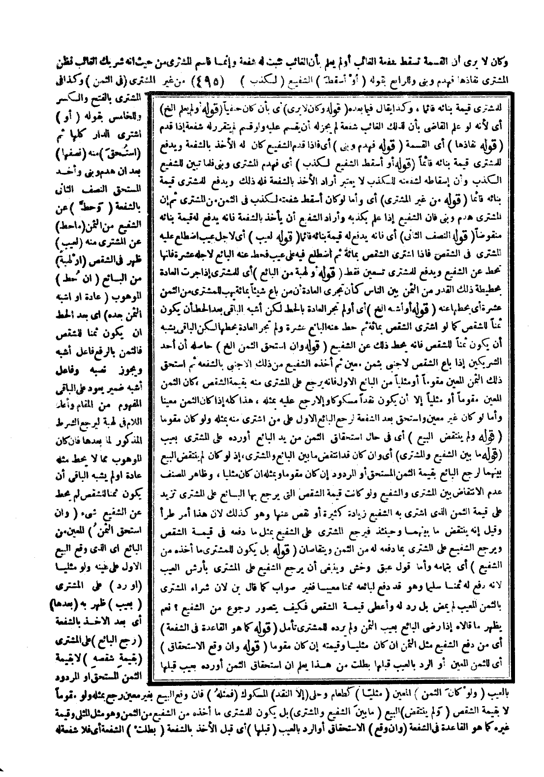وَأَمَّا قَوْلُ عبق وخش وَيَنْبَغِي أَنْ يَرْجِعَ الشَّفِيعُ عَلَى الْمُشْتَرِي بِأَرْشِ الْعَيْبِ لِأَنَّهُ دَفَعَ لَهُ ثَمَنًا سَلِيمًا، وَهُوَ قَدْ دَفَعَ لِبَائِعِهِ ثَمَنًا مَعِيبًا فَغَيْرُ صَوَابٍ كَمَا قَالَ بْن؛ لِأَنَّ شِرَاءَ الْمُشْتَرِي بِالثَّمَنِ الْمَعِيبِ لَمْ يَمْضِ بَلْ رُدَّ لَهُ وَأُعْطِيَ قِيمَةُ الشِّقْصِ فَكَيْفَ يُتَصَوَّرُ رُجُوعٌ مِنْ الشَّفِيعِ؟ نَعَمْ يَظْهَرُ مَا قَالَاهُ إذَا رَضِيَ الْبَائِعُ بِعَيْبِ الثَّمَنِ وَلَمْ يَرُدَّهُ لِلْمُشْتَرِي تَأَمَّلْ.