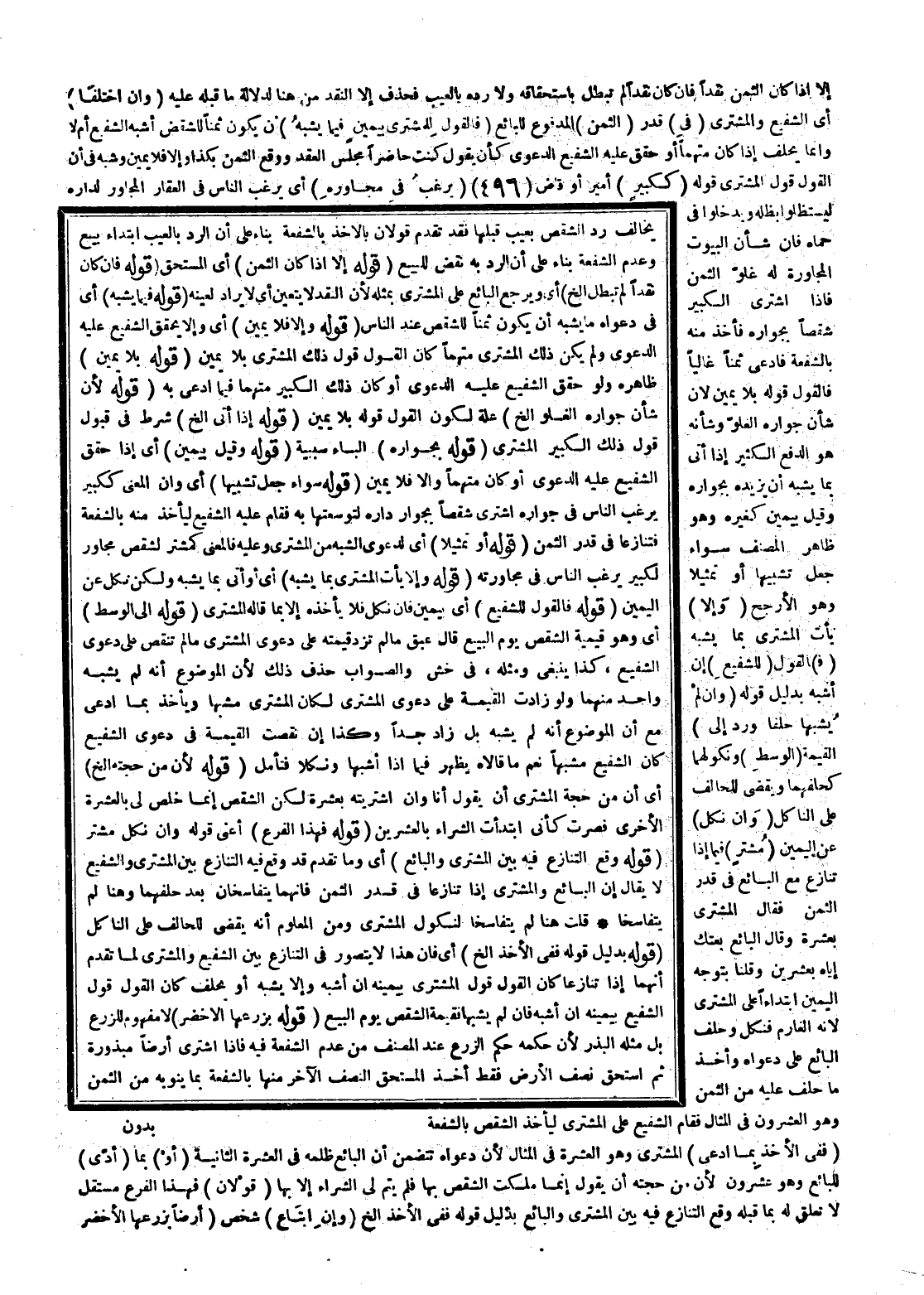(وَإِنْ اخْتَلَفَا) أَيْ الشَّفِيعُ، وَالْمُشْتَرِي (فِي) قَدْرِ (الثَّمَنِ) الْمَدْفُوعِ لِلْبَائِعِ (فَالْقَوْلُ لِلْمُشْتَرِي بِيَمِينٍ فِيمَا يُشْبِهُ) أَنْ يَكُونَ ثَمَنًا لِلشِّقْصِ أَشْبَهَ الشَّفِيعَ أَمْ لَا، وَإِنَّمَا يَحْلِفُ إذَا كَانَ مُتَّهَمًا، أَوْ حَقَّقَ عَلَيْهِ الشَّفِيعُ الدَّعْوَى كَأَنْ يَقُولَ كُنْتُ حَاضِرًا مَجْلِسَ الْعَقْدِ وَوَقَعَ الثَّمَنُ بِكَذَا، وَإِلَّا فَلَا يَمِينَ وَشُبِّهَ فِي أَنَّ الْقَوْلَ قَوْلُ الْمُشْتَرِي قَوْلُهُ (كَكَبِيرٍ) أَمِيرٍ، أَوْ قَاضٍ (يَرْغَبُ فِي مُجَاوِرِهِ) أَيْ يَرْغَبُ النَّاسُ فِي الْعَقَارِ الْمُجَاوِرِ لِدَارِهِ لِيَسْتَظِلُّوا بِظِلِّهِ وَيَدْخُلُوا فِي حِمَاهُ فَإِنَّ شَأْنَ الْبُيُوتِ الْمُجَاوِرَةِ لَهُ غُلُوُّ الثَّمَنِ فَإِذَا اشْتَرَى الْكَبِيرُ شِقْصًا بِجِوَارِهِ فَأُخِذَ مِنْهُ بِالشُّفْعَةِ فَادَّعَى ثَمَنًا غَالِيًا فَالْقَوْلُ قَوْلُهُ بِلَا يَمِينٍ؛ لِأَنَّ شَأْنَ جِوَارِهِ الْغُلُوُّ وَشَأْنَهُ هُوَ الدَّفْعُ الْكَثِيرُ إذَا أَتَى بِمَا يُشْبِهُ أَنْ يَزِيدَهُ بِجِوَارِهِ وَقِيلَ بِيَمِينٍ كَغَيْرِهِ، وَهُوَ ظَاهِرُ الْمُصَنِّفِ سَوَاءٌ جُعِلَ تَشْبِيهًا، أَوْ تَمْثِيلًا، وَهُوَ الْأَرْجَحُ (وَإِلَّا) يَأْتِ الْمُشْتَرِي بِمَا يُشْبِهُ (فَ) الْقَوْلُ (لِلشَّفِيعِ) إنْ أَشْبَهَ بِدَلِيلِ قَوْلِهِ (وَإِنْ لَمْ يُشَبِّهَا حَلَفَا وَرُدَّ إلَى) الْقِيمَةِ (الْوَسَطِ) وَنُكُولُهُمَا كَحَلِفِهِمَا وَيُقْضَى لِلْحَالِفِ عَلَى النَّاكِلِ.