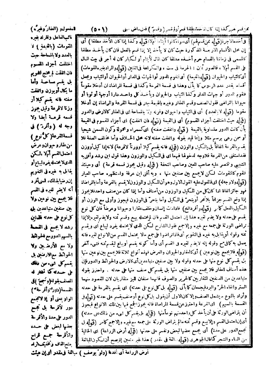 وَأَمَّا كَوْنُهُ يُقَسَّمُ أَوْ يُبَاعُ لِيُقَسَّمَ ثَمَنُهُ فَشَيْءٌ آخَرُ (قَوْلُهُ فَلَا يُجْمَعُ بَيْنَ نَوْعَيْنِ) أَيْ كَالْعَقَارِ أَوْ الْحَيَوَانِ وَالْعَرْضِ فَهَذِهِ أَنْوَاعٌ ثَلَاثَةٌ فَلَا يُجْمَعُ بَيْنَ نَوْعَيْنِ مِنْهَا بَلْ يُقَسَّمُ كُلُّ نَوْعٍ مِنْهَا عَلَى حِدَتِهِ وَقَوْلُهُ وَلَا بَيْنَ صِنْفَيْنِ مُتَبَاعِدَيْنِ أَيْ كَالْأَرْضِ وَالْحَوَائِطِ وَالدُّورِ فَإِنَّ هَذِهِ أَصْنَافٌ لِلْعَقَارِ فَلَا يُجْمَعُ بَيْنَ صِنْفَيْنِ مِنْهَا بَلْ يُقَسَّمُ كُلُّ صِنْفٍ مِنْهَا عَلَى حِدَتِهِ وَاحْتَرَزَ بِقَوْلِهِ مُتَبَاعِدِينَ مِنْ الصِّنْفَيْنِ الْمُتَقَارِبَيْنِ كَالْحَرِيرِ وَالصُّوفِ فَإِنَّهُمَا صِنْفَانِ لِلْبَزِّ مُتَقَارِبَانِ؛ لِأَنَّ الْمَقْصُودَ مِنْهُمَا السِّتْرُ وَاتِّقَاءُ الْحُرِّ وَالْبُرْدِ فَيُجْمَعَانِ كَمَا يَأْتِي (قَوْلُهُ بَلْ كُلُّ نَوْعٍ عَلَى حِدَتِهِ) أَيْ يُقَسَّمُ بِالْقُرْعَةِ عَلَى حِدَتِهِ وَأَرَادَ بِالنَّوْعِ مَا يَشْمَلُ الصِّنْفَ وَإِلَّا كَانَ الْأَوْلَى أَنْ يَقُولَ بَلْ كُلُّ نَوْعٍ أَوْ صِنْفٍ يُقَسَّمُ عَلَى حِدَتِهِ (قَوْلُهُ فِي الْقِسْمَةِ بِالسَّهْمِ) أَيْ الْقُرْعَةِ وَاحْتَرَزَ عَنْ قِسْمَةِ الْمُرَاضَاةِ فَإِنَّهُ يَجُوزُ الْجَمْعُ فِيهَا بَيْنَ تِلْكَ الْأَنْوَاعِ فَيَجُوزُ أَنْ يَتَرَاضَى الْوَرَثَةُ عَلَى أَنْ يَأْخُذَ كُلُّ وَاحِدٍ مِنْهُمْ نَوْعًا مِنْهَا (قَوْلُهُ بَلْ يُقَسَّمُ كُلُّ شَيْءٍ مِنْ ذَلِكَ عَلَى حِدَتِهِ) أَيْ إنْ احْتَمَلَ الْقَسْمَ وَإِلَّا بِيعَ وَقُسِّمَ ثَمَنُهُ مَا لَمْ يَتَرَاضَ الْوَرَثَةُ عَلَى جَمْعِهِ مَعَ غَيْرِهِ وَإِلَّا جُمِعَ كَمَا مَرَّ (قَوْلُهُ بَلْ تُجْمَعُ الدُّورُ عَلَى حِدَةٍ) أَيْ يُجْمَعُ بَعْضُهَا لِبَعْضٍ وَتُقَسَّمُ عَلَى حِدَتِهَا (قَوْلُهُ أَرْضُ الزِّرَاعَةِ) أَيْ الْخَالِيَةُ مِنْ الْبِنَاءِ وَالشَّجَرِ كَمَا قَالَ الْجَوْهَرِيُّ (قَوْلُهُ مُبَالَغَةٌ فِي مُقَدَّرٍ) هَذَا غَيْرُ مُتَعَيِّنٍ إذْ يَصِحُّ أَنْ تَكُونَ الْمُبَالَغَةُ