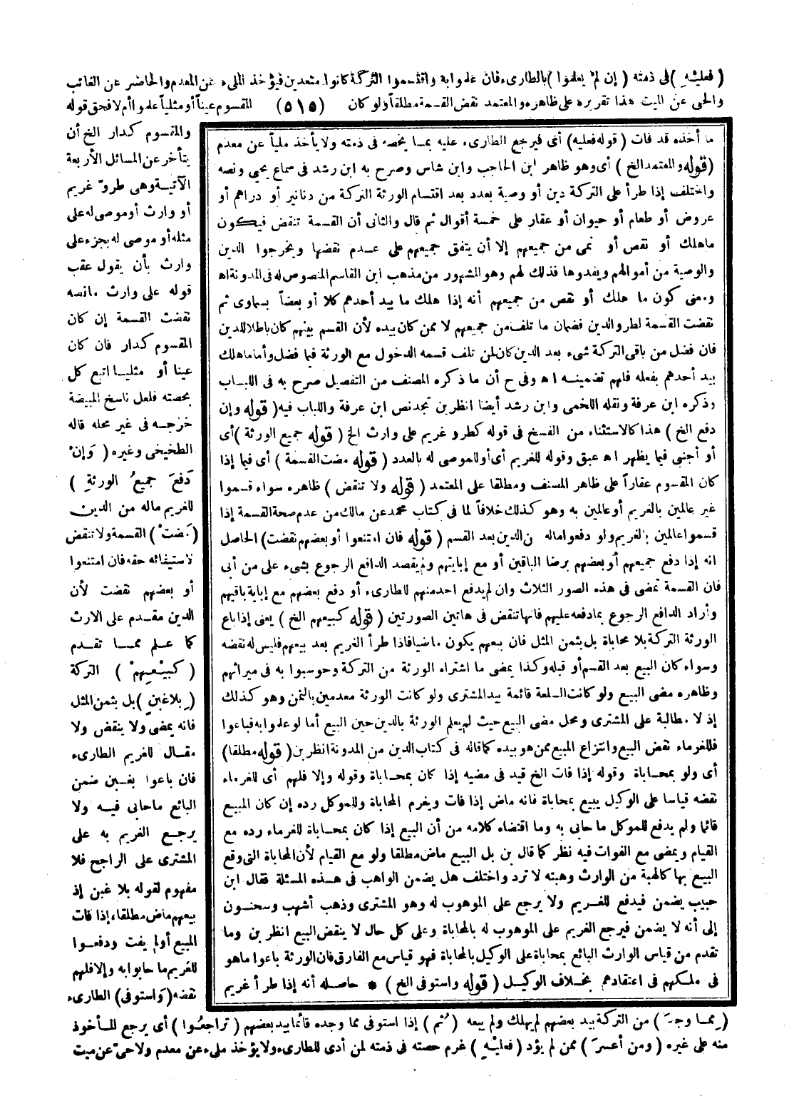 (فَعَلَيْهِ) فِي ذِمَّتِهِ (إنْ لَمْ يَعْلَمُوا) بِالطَّارِئِ فَإِنْ عَلِمُوا بِهِ وَاقْتَسَمُوا التَّرِكَةَ كَانُوا مُتَعَدِّينَ فَيُؤْخَذُ الْمَلِيءُ عَنْ الْمُعْدَمِ وَالْحَاضِرُ عَنْ الْغَائِبِ وَالْحَيُّ عَنْ الْمَيِّتِ هَذَا تَقْرِيرُهُ عَلَى ظَاهِرِهِ وَالْمُعْتَمَدُ نَقْضُ الْقِسْمَةِ مُطْلَقًا وَلَوْ كَانَ الْمَقْسُومُ عَيْنًا أَوْ مِثْلِيًّا عَلِمُوا أَمْ لَا فَحَقُّ قَوْلِهِ وَالْمَقْسُومُ كَدَارٍ إلَخْ أَنْ يَتَأَخَّرَ عَنْ الْمَسَائِلِ الْأَرْبَعَةِ الْآتِيَةِ، وَهِيَ طُرُوُّ غَرِيمٍ أَوْ وَارِثٍ أَوْ مُوصًى لَهُ عَلَى مِثْلِهِ أَوْ مُوصًى لَهُ بِجُزْءٍ عَلَى وَارِثٍ بِأَنْ يَقُولَ عَقِبَ قَوْلِهِ عَلَى وَارِثٍ مَا نَصُّهُ نُقِضَتْ الْقِسْمَةُ إنْ كَانَ الْمَقْسُومُ كَدَارٍ فَإِنْ كَانَ عَيْنًا أَوْ مِثْلِيًّا اُتُّبِعَ كُلٌّ بِحِصَّتِهِ فَلَعَلَّ نَاسِخَ الْمُبَيَّضَةِ خَرَّجَهُ فِي غَيْرِ مَحَلِّهِ قَالَهُ الطِّخِّيخِيُّ وَغَيْرُهُ (وَإِنْ دَفَعَ جَمِيعُ الْوَرَثَةِ) لِلْغَرِيمِ مَالَهُ مِنْ الدَّيْنِ (مَضَتْ) الْقِسْمَةُ وَلَا تُنْقَضُ لِاسْتِيفَائِهِ حَقَّهُ فَإِنْ امْتَنَعُوا أَوْ بَعْضُهُمْ نُقِضَتْ؛ لِأَنَّ الدَّيْنَ مُقَدَّمٌ عَلَى الْإِرْثِ كَمَا عُلِمَ مِمَّا تَقَدَّمَ (كَبَيْعِهِمْ) التَّرِكَةَ (بِلَا غَبَنٍ) بَلْ بِثَمَنِ الْمِثْلِ فَإِنَّهُ يَمْضِي وَلَا يُنْقَضُ وَلَا مَقَالَ لِلْغَرِيمِ الطَّارِئِ فَإِنْ بَاعُوا بِغَبَنٍ ضَمِنَ الْبَائِعُ مَا حَابَى فِيهِ وَلَا يَرْجِعُ الْغَرِيمُ بِهِ عَلَى الْمُشْتَرِي الرَّاجِحِ فَلَا مَفْهُومَ لِقَوْلِهِ بِلَا غَبَنٍ إذْ بَيْعُهُمْ مَاضٍ مُطْلَقًا، إذَا فَاتَ الْمَبِيعُ أَوْ لَمْ يَفُتْ وَدَفَعُوا لِلْغَرِيمِ مَا حَابَوْا بِهِ وَإِلَّا فَلَهُمْ نَقْضُهُ (وَاسْتَوْفَى) الطَّارِئُ (مِمَّا وَجَدَ) مِنْ التَّرِكَةِ بِيَدِ بَعْضِهِمْ لَمْ يَهْلَكْ وَلَمْ يَبِعْهُ (ثُمَّ) إذَا اسْتَوْفَى مِمَّا وَجَدَهُ قَائِمًا بِيَدِ بَعْضِهِمْ (تَرَاجَعُوا) أَيْ يَرْجِعُ الْمَأْخُوذُ مِنْهُ عَلَى غَيْرِهِ (وَمَنْ أَعْسَرَ) مِمَّنْ لَمْ يُؤَدِّ (فَعَلَيْهِ) غُرْمُ حِصَّتِهِ فِي ذِمَّتِهِ لِمَنْ أَدَّى لِلطَّارِئِ وَلَا يُؤْخَذُ مَلِيءٌ عَنْ مُعْدَمٍ وَلَا حَيٍّ عَنْ مَيِّتٍ