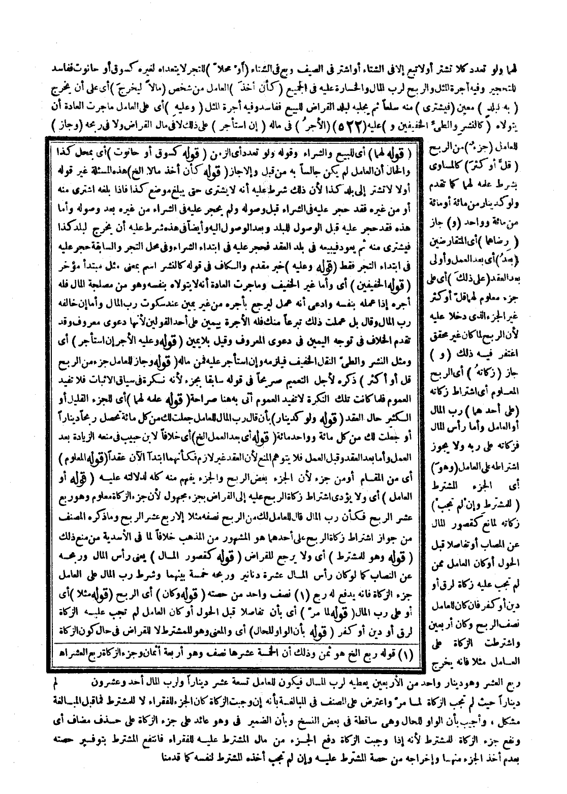 (وَ) جَازَ (زَكَاتُهُ) أَيْ الرِّبْحِ الْمَعْلُومِ أَيْ اشْتِرَاطُ زَكَاتِهِ (عَلَى أَحَدِهِمَا) رَبِّ الْمَالِ أَوْ الْعَامِلِ، وَأَمَّا رَأْسُ الْمَالِ فَزَكَاتُهُ عَلَى رَبِّهِ وَلَا يَجُوزُ اشْتِرَاطُهُ عَلَى الْعَامِلِ (وَهُوَ) أَيْ الْجُزْءُ الْمُشْتَرَطُ (لِلْمُشْتَرِطِ، وَإِنْ لَمْ تَجِبْ) زَكَاتُهُ لِمَانِعٍ كَقُصُورِ الْمَالِ عَنْ النِّصَابِ أَوْ تَفَاصَلَا قَبْلَ الْحَوْلِ أَوْ كَانَ الْعَامِلُ مِمَّنْ لَمْ تَجِبْ عَلَيْهِ زَكَاةٌ لِرِقٍّ أَوْ دَيْنٍ أَوْ كُفْرٍ فَإِنْ كَانَ لِلْعَامِلِ نِصْفُ الرِّبْحِ وَكَانَ أَرْبَعِينَ وَاشْتُرِطَتْ الزَّكَاةُ عَلَى الْعَامِلِ مَثَلًا فَإِنَّهُ يُخْرِجُ رُبُعَ الْعُشْرِ، وَهُوَ دِينَارٌ وَاحِدٌ مِنْ الْأَرْبَعِينَ يُعْطِيه لِرَبِّ الْمَالِ فَيَكُونُ لِلْعَامِلِ تِسْعَةَ عَشَرَ دِينَارًا وَلِرَبِّ الْمَالِ أَحَدٌ وَعِشْرُونَ دِينَارًا حَيْثُ لَمْ تَجِبْ الزَّكَاةُ لِمَا مَرَّ وَاعْتُرِضَ عَلَى الْمُصَنِّفِ فِي الْمُبَالَغَةِ بِأَنَّهُ إنْ وَجَبَتْ الزَّكَاةُ كَانَ الْجُزْءُ لِلْفُقَرَاءِ لَا لِلْمُشْتَرِطِ فَمَا قَبْلَ الْمُبَالَغَةِ مُشْكِلٌ، وَأُجِيبَ بِأَنَّ الْوَاوَ لِلْحَالِ وَهِيَ سَاقِطَةٌ فِي بَعْضِ النُّسَخِ وَبِأَنَّ الضَّمِيرَ فِي، وَهُوَ عَائِدٌ عَلَى جُزْءِ الزَّكَاةِ عَلَى حَذْفِ مُضَافٍ أَيْ وَنَفْعُ جُزْءِ الزَّكَاةِ لِلْمُشْتَرِطِ؛ لِأَنَّهُ إذَا وَجَبَتْ الزَّكَاةُ دُفِعَ الْجُزْءُ مِنْ مَالِ الْمُشْتَرَطِ عَلَيْهِ لِلْفُقَرَاءِ فَانْتَفَعَ الْمُشْتَرِطُ بِتَوْفِيرِ حِصَّتِهِ بِعَدَمِ أَخْذِ الْجُزْءِ مِنْهَا وَإِخْرَاجِهِ مِنْ حِصَّةِ الْمُشْتَرَطِ عَلَيْهِ، وَإِنْ لَمْ تَجِبْ أَخَذَهُ الْمُشْتَرِطُ لِنَفْسِهِ كَمَا قَدَّمْنَا