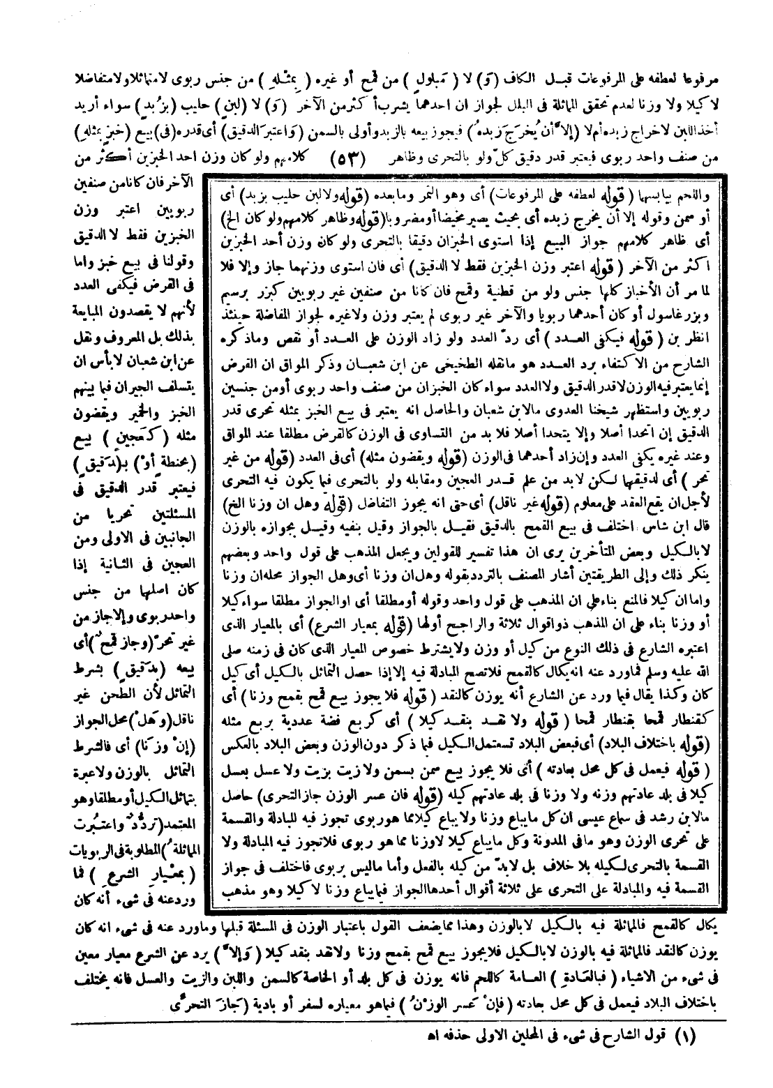 (وَاعْتُبِرَتْ الْمُمَاثَلَةُ) الْمَطْلُوبَةُ فِي الرِّبَوِيَّاتِ (بِمِعْيَارِ الشَّرْعِ) فَمَا وَرَدَ عَنْهُ فِي شَيْءٍ أَنَّهُ كَانَ يُكَالُ كَالْقَمْحِ فَالْمُمَاثَلَةُ فِيهِ بِالْكَيْلِ لَا بِالْوَزْنِ وَهَذَا مِمَّا يُضْعِفُ الْقَوْلَ بِاعْتِبَارِ الْوَزْنِ فِي الْمَسْأَلَةِ قَبْلَهَا وَمَا وَرَدَ عَنْهُ فِي شَيْءٍ أَنَّهُ يُوزَنُ كَالنَّقْدِ فَالْمُمَاثَلَةُ فِيهِ بِالْوَزْنِ لَا بِالْكَيْلِ فَلَا يَجُوزُ بَيْعُ قَمْحٍ بِقَمْحٍ وَزْنًا وَلَا نَقْدٍ بِنَقْدٍ كَيْلًا (وَإِلَّا) يَرِدُ عَنْ الشَّرْعِ مِعْيَارٌ مُعَيَّنٌ فِي شَيْءٍ مِنْ الْأَشْيَاءِ (فَبِالْعَادَةِ) الْعَامَّةِ كَاللَّحْمِ، فَإِنَّهُ يُوزَنُ فِي كُلِّ بَلَدٍ أَوْ الْخَاصَّةُ كَالسَّمْنِ وَاللَّبَنِ وَالزَّيْتِ وَالْعَسَلِ، فَإِنَّهُ يَخْتَلِفُ بِاخْتِلَافِ الْبِلَادِ فَيُعْمَلُ فِي كُلِّ مَحَلٍّ بِعَادَتِهِ (فَإِنْ عَسُرَ الْوَزْنُ) فِيمَا هُوَ مِعْيَارُهُ لِسَفَرٍ أَوْ بَادِيَةٍ (جَازَ التَّحَرِّي)