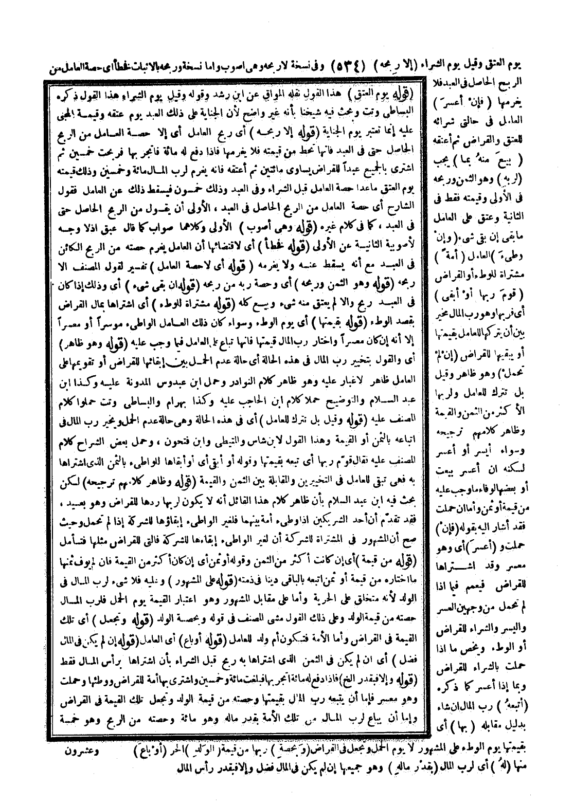 ـــــــــــــــــــــــــــــQقَوْلُهُ يَوْمَ الْعِتْقِ) هَذَا الْقَوْلُ نَقَلَهُ الْمَوَّاقُ عَنْ ابْنِ رُشْدٍ وَقَوْلُهُ وَقِيلَ يَوْمَ الشِّرَاءِ هَذَا الْقَوْلُ ذَكَرَهُ الْبِسَاطِيُّ وتت وَبَحَثَ فِيهِ شَيْخُنَا بِأَنَّهُ غَيْرُ وَاضِحٍ؛ لِأَنَّ الْجِنَايَةَ عَلَى ذَلِكَ الْعَبْدِ يَوْمَ عِتْقِهِ وَقِيمَةَ الْمَجْنِيِّ عَلَيْهِ إنَّمَا تُعْتَبَرُ يَوْمَ الْجِنَايَةِ (قَوْلُهُ إلَّا رِبْحَهُ) أَيْ رِبْحَ الْعَامِلِ أَيْ إلَّا حِصَّةَ الْعَامِلِ مِنْ الرِّبْحِ الْحَاصِلِ حَتَّى فِي الْعَبْدِ فَإِنَّهَا تَحُطُّ مِنْ قِيمَتِهِ فَلَا يَغْرَمُهَا فَإِذَا دَفَعَ لَهُ مِائَةً فَاتَّجَرَ بِهَا فَرَبِحَتْ خَمْسِينَ ثُمَّ اشْتَرَى بِالْجَمِيعِ عَبْدًا لِلْقِرَاضِ يُسَاوِي مِائَتَيْنِ ثُمَّ أَعْتَقَهُ فَإِنَّهُ يَغْرَمُ لِرَبِّ الْمَالِ مِائَةً وَخَمْسِينَ، وَذَلِكَ قِيمَتُهُ يَوْمَ الْعِتْقِ مَا عَدَا حِصَّةِ الْعَامِلِ قَبْلَ الشِّرَاءِ، وَفِي الْعَبْدِ وَذَلِكَ خَمْسُونَ فَيَسْقُطُ ذَلِكَ عَنْ الْعَامِلِ فَقَوْلُ الشَّارِحِ أَيْ حِصَّةُ الْعَامِلِ مِنْ الرِّبْحِ الْحَاصِلِ فِي الْعَبْدِ، الْأَوْلَى أَنْ يَقُولَ مِنْ الرِّبْحِ الْحَاصِلِ حَتَّى فِي الْعَبْدِ، كَمَا فِي كَلَامِ غَيْرِهِ.