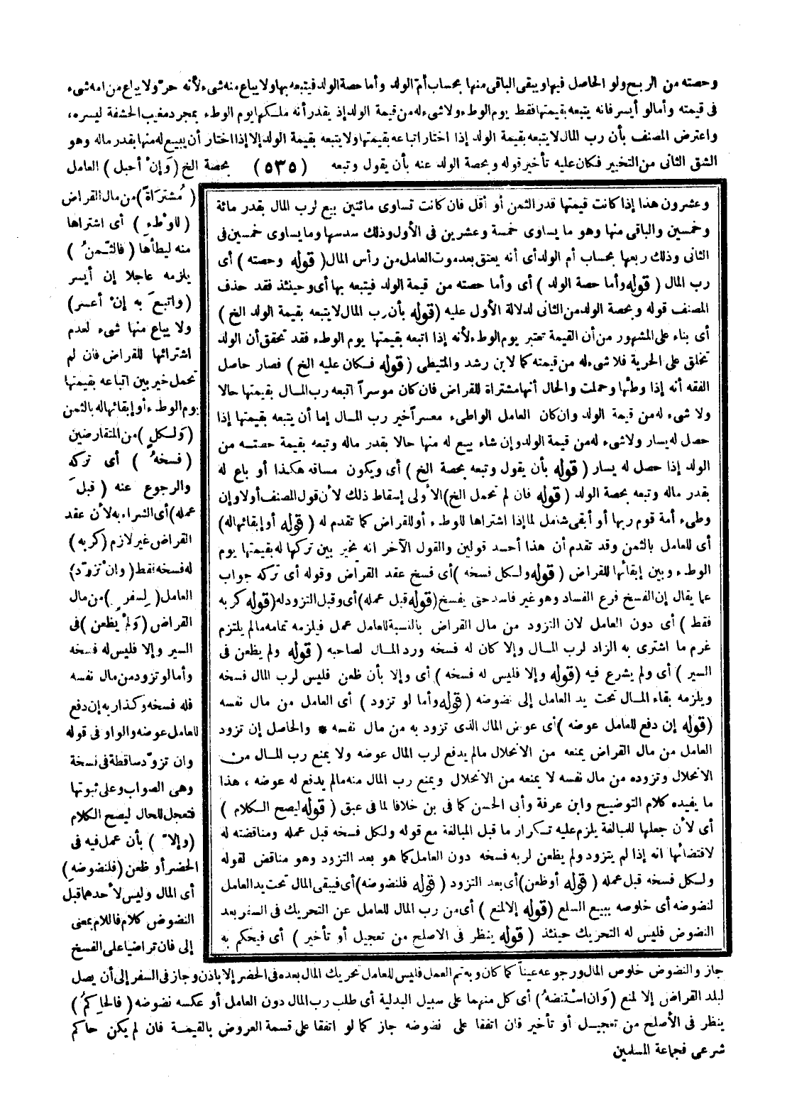 (قَوْلُهُ وَحِصَّتِهِ) أَيْ رَبِّ الْمَالِ (قَوْلُهُ، وَأَمَّا حِصَّةُ الْوَلَدِ) أَيْ، وَأَمَّا حِصَّتُهُ مِنْ قِيمَةِ الْوَلَدِ فَيَتْبَعُهُ بِهَا أَيْ وَحِينَئِذٍ فَقَدْ حَذَفَ الْمُصَنِّفُ قَوْلَهُ وَبِحِصَّةِ الْوَلَدِ مِنْ الثَّانِي لِدَلَالَةِ الْأَوَّلِ عَلَيْهِ (قَوْلُهُ بِأَنَّ رَبَّ الْمَالِ لَا يَتْبَعُهُ بِقِيمَةِ الْوَلَدِ إلَخْ) أَيْ بِنَاءً عَلَى الْمَشْهُورِ مِنْ أَنَّ الْقِيمَةَ تُعْتَبَرُ يَوْمَ الْوَطْءِ؛ لِأَنَّهُ إذَا اتَّبَعَهُ بِقِيمَتِهَا يَوْمَ الْوَطْءِ فَقَدْ تَحَقَّقَ أَنَّ الْوَلَدَ تَخَلَّقَ عَلَى الْحُرِّيَّةِ فَلَا شَيْءَ لَهُ مِنْ قِيمَتِهِ كَمَا لِابْنِ رُشْدٍ وَالْمُتَيْطِيِّ (قَوْلُهُ فَكَانَ عَلَيْهِ إلَخْ) فَصَارَ حَاصِلُ الْفِقْهِ أَنَّهُ إذَا وَطِئَهَا وَحَمَلَتْ الْحَالَ أَنَّهَا مُشْتَرَاةٌ لِلْقِرَاضِ فَإِنْ كَانَ مُوسِرًا اتَّبَعَهُ رَبُّ الْمَالِ بِقِيمَتِهَا حَالًّا وَلَا شَيْءَ لَهُ مِنْ قِيمَةِ الْوَلَدِ وإنْ كَانَ الْعَامِلُ الْوَاطِئُ مُعْسِرًا خُيِّرَ رَبُّ الْمَالِ إمَّا أَنْ يَتْبَعَهُ بِقِيمَتِهَا إذَا حَصَلَ لَهُ يَسَارٌ وَلَا شَيْءَ لَهُ مِنْ قِيمَةِ الْوَلَدِ، وَإِنْ شَاءَ بِيعَ لَهُ مِنْهَا حَالًّا بِقَدْرِ مَالِهِ وَتَبِعَهُ بِقِيمَةِ حِصَّتِهِ مِنْ الْوَلَدِ إذَا حَصَلَ لَهُ يَسَارٌ (قَوْلُهُ بِأَنْ يَقُولَ وَتَبِعَهُ بِحِصَّةِ إلَخْ) أَيْ وَيَكُونُ مَسَاقُهُ هَكَذَا أَوْ بَاعَ لَهُ بِقَدْرِ مَالِهِ وَتَبِعَهُ بِحِصَّةِ الْوَلَدِ (قَوْلُهُ فَإِنْ لَمْ تَحْمِلْ إلَخْ) الْأَوْلَى إسْقَاطُ ذَلِكَ؛ لِأَنَّ قَوْلَ الْمُصَنِّفِ أَوَّلًا، وَإِنْ وَطِئَ أَمَةً قَوَّمَ رَبُّهَا أَوْ أَبْقَى شَامِلٌ لِمَا إذَا اشْتَرَاهَا لِلْوَطْءِ أَوْ لِلْقِرَاضِ كَمَا تَقَدَّمَ لَهُ (قَوْلُهُ أَوْ إبْقَائِهَا لَهُ) أَيْ لِلْعَامِلِ بِالثَّمَنِ وَقَدْ تَقَدَّمَ أَنَّ هَذَا أَحَدُ قَوْلَيْنِ وَالْقَوْلُ الْآخَرُ أَنَّهُ يُخَيَّرُ بَيْنَ تَرْكِهَا لَهُ بِقِيمَتِهَا يَوْمَ الْوَطْءِ وَبَيْنَ إبْقَائِهَا لِلْقِرَاضِ (قَوْلُهُ وَلِكُلٍّ فَسْخُهُ) أَيْ فَسْخُ عَقْدِ الْقِرَاضِ وَقَوْلُهُ أَيْ تَرْكُهُ جَوَابٌ عَمَّا يُقَالُ أَنَّ الْفَسْخَ فَرْعُ الْفَسَادِ، وَهُوَ غَيْرُ فَاسِدٍ حَتَّى يُفْسَخَ (قَوْلُهُ قَبْلَ عَمَلِهِ) أَيْ وَقَبْلَ التَّزَوُّدِ لَهُ (قَوْلُهُ كَرَبِّهِ فَقَطْ) أَيْ دُونَ الْعَامِلِ؛ لِأَنَّ التَّزَوُّدَ مِنْ مَالِ الْقِرَاضِ بِالنِّسْبَةِ لِلْعَامِلِ عَمَلٌ فَيَلْزَمُهُ تَمَامُهُ مَا لَمْ يَلْتَزِمْ غُرْمَ مَا اشْتَرَى بِهِ الزَّادَ لِرَبِّ الْمَالِ وَإِلَّا كَانَ لَهُ فَسْخُهُ وَرَدُّ الْمَالِ لِصَاحِبِهِ