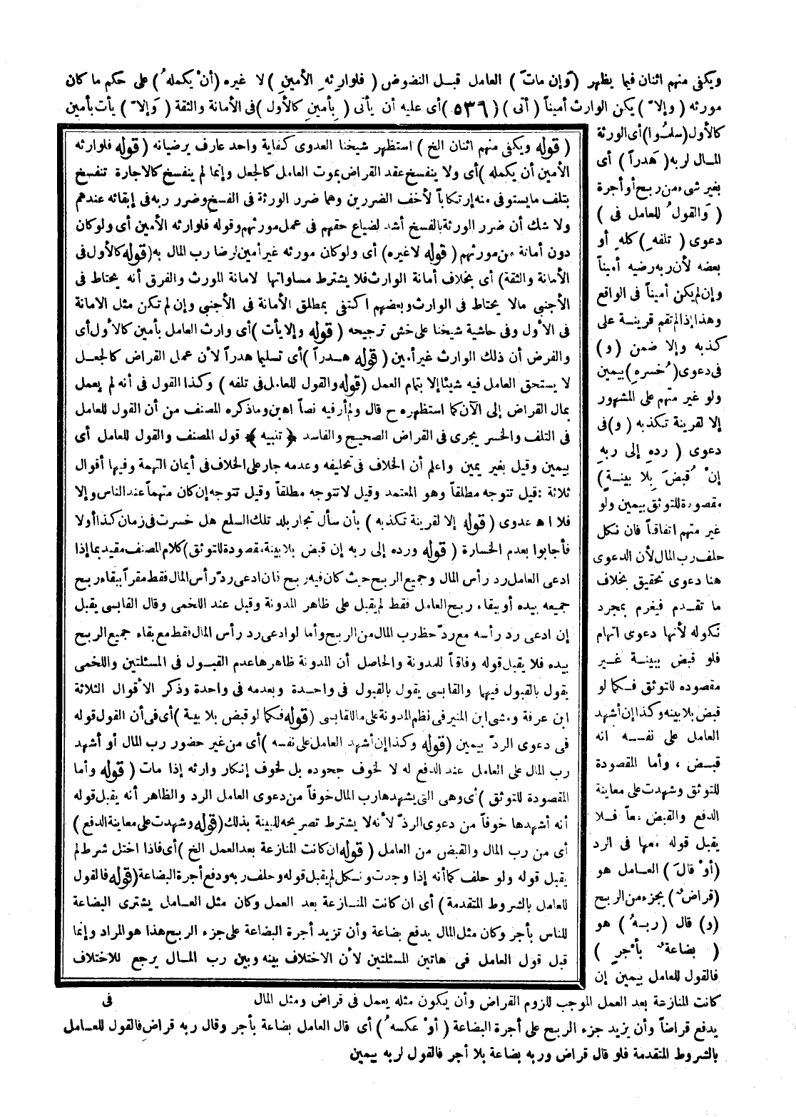 وَيَكْفِي مِنْهُمْ اثْنَانِ فِيمَا يَظْهَرُ (وَإِنْ مَاتَ) الْعَامِلُ قَبْلَ النُّضُوضِ (فَلِوَارِثِهِ الْأَمِينِ) لَا غَيْرِهِ (أَنْ يُكْمِلَهُ) عَلَى حُكْمِ مَا كَانَ مُوَرِّثُهُ (وَإِلَّا) يَكُنْ الْوَارِثُ أَمِينًا (أَتَى) أَيْ عَلَيْهِ أَنْ يَأْتِيَ (بِأَمِينٍ كَالْأَوَّلِ) فِي الْأَمَانَةِ وَالثِّقَةِ (وَإِلَّا) يَأْتِ بِأَمِينٍ كَالْأَوَّلِ (سَلَّمُوا) أَيْ الْوَرَثَةُ الْمَالَ لِرَبِّهِ (هَدَرًا) أَيْ بِغَيْرِ شَيْءٍ مِنْ رِبْحٍ أَوْ أُجْرَةٍ (وَالْقَوْلُ لِلْعَامِلِ فِي) دَعْوَى (تَلَفِهِ) كُلِّهِ أَوْ بَعْضِهِ؛ لِأَنَّ رَبَّهُ رَضِيَهُ أَمِينًا، وَإِنْ لَمْ يَكُنْ أَمِينًا فِي الْوَاقِعِ، وَهَذَا إذَا لَمْ تَقُمْ قَرِينَةٌ عَلَى كَذِبِهِ وَإِلَّا ضَمِنَ (وَ) فِي دَعْوَى (خُسْرِهِ) بِيَمِينٍ وَلَوْ غَيْرَ مُتَّهَمٍ عَلَى الْمَشْهُورِ إلَّا لِقَرِينَةٍ تُكَذِّبُهُ.