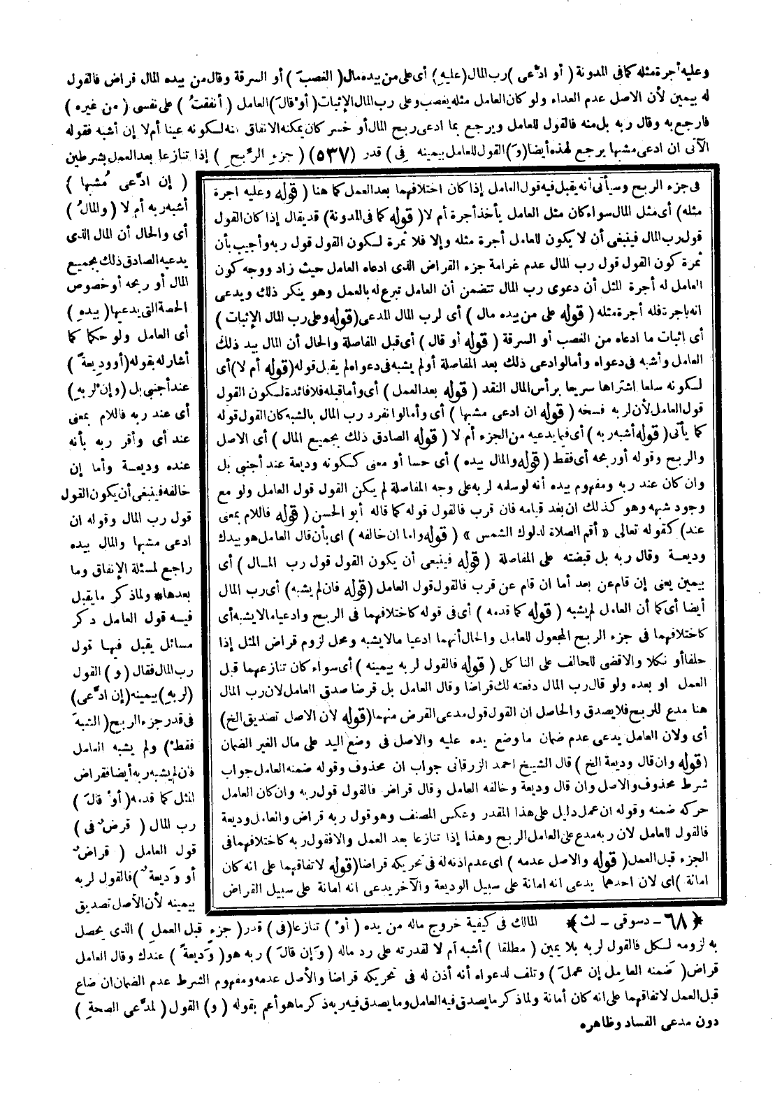 ـــــــــــــــــــــــــــــQفِي جُزْءِ الرِّبْحِ وَسَيَأْتِي أَنَّهُ يُقْبَلُ فِيهِ قَوْلُ الْعَامِلِ إذَا كَانَ اخْتِلَافُهُمَا بَعْدَ الْعَمَلِ كَمَا هُنَا (قَوْلُهُ: وَعَلَيْهِ أُجْرَةُ مِثْلِهِ) أَيْ مِثْلِ الْمَالِ سَوَاءٌ كَانَ مِثْلُ الْعَامِلِ يَأْخُذُ أُجْرَةً أَمْ لَا (قَوْلُهُ كَمَا فِي الْمُدَوَّنَةِ) قَدْ يُقَالُ إذَا كَانَ الْقَوْلُ قَوْلَ رَبِّ الْمَالِ فَيَنْبَغِي أَنْ لَا يَكُونَ لِلْعَامِلِ أُجْرَةُ مِثْلِهِ وَإِلَّا فَلَا ثَمَرَةَ لِكَوْنِ الْقَوْلِ قَوْلَ رَبِّهِ وَأُجِيبَ بِأَنَّ ثَمَرَةَ كَوْنِ الْقَوْلِ قَوْلَ رَبِّ الْمَالِ عَدَمُ غَرَامَةِ جُزْءِ الْقِرَاضِ الَّذِي ادَّعَاهُ الْعَامِلُ حَيْثُ زَادَ وَوَجْهُ كَوْنِ الْعَامِلِ لَهُ أُجْرَةُ الْمِثْلِ أَنَّ دَعْوَى رَبِّ الْمَالِ تَتَضَمَّنُ أَنَّ الْعَامِلَ تَبَرَّعَ لَهُ بِالْعَمَلِ، وَهُوَ يُنْكِرُ ذَلِكَ، وَيَدَّعِي أَنَّهُ بِأُجْرَةٍ فَلَهُ أُجْرَةُ مِثْلِهِ (قَوْلُهُ عَلَى مَنْ بِيَدِهِ مَالٌ) أَيْ لِرَبِّ الْمَالِ الْمُدَّعَى (قَوْلُهُ وَعَلَى رَبِّ الْمَالِ الْإِثْبَاتُ) أَيْ إثْبَاتُ مَا ادَّعَاهُ مِنْ الْغَصْبِ أَوْ السَّرِقَةِ (قَوْلُهُ أَوْ قَالَ) أَيْ قَبْلَ الْمُفَاصَلَةِ وَالْحَالُ أَنَّ الْمَالَ بِيَدِ ذَلِكَ الْعَامِلِ وَأَشْبَهَ فِي دَعْوَاهُ، وَأَمَّا لَوْ ادَّعَى ذَلِكَ بَعْدَ الْمُفَاصَلَةِ أَوْ لَمْ يُشَبِّهْ فِي دَعْوَاهُ لَمْ يُقْبَلْ قَوْلُهُ (قَوْلُهُ: أَمْ لَا) أَيْ لِكَوْنِهِ سِلَعًا اشْتَرَاهَا سَرِيعًا بِرَأْسِ الْمَالِ النَّقْدِ
