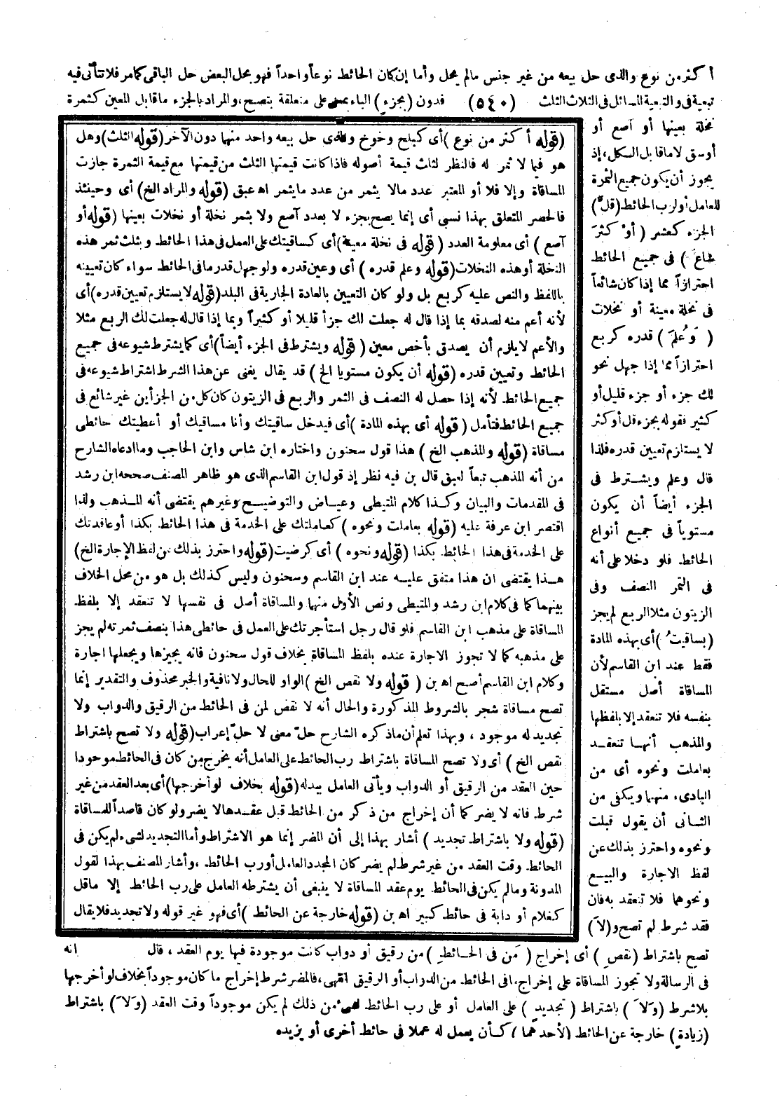 وَأَمَّا إنْ كَانَ الْحَائِطُ نَوْعًا وَاحِدًا فَهُوَ بِحِلِّ الْبَعْضِ حَلَّ الْبَاقِي كَمَا مَرَّ فَلَا تَتَأَتَّى فِيهِ تَبَعِيَّةٌ فِي وَالتَّبَعِيَّةُ الْمَسَائِلُ فِي الثَّلَاثِ الثُّلُثُ فَدُونَ (بِجُزْءٍ) الْبَاءُ بِمَعْنَى عَلَى مُتَعَلِّقَةٌ بِ تَصِحَّ، وَالْمُرَادُ بِالْجُزْءِ مَا قَابَلَ الْمُعَيَّنَ كَثَمَرَةِ نَخْلَةٍ بِعَيْنِهَا أَوْ آصُعٍ أَوْ أَوْسُقٍ لَا مَا قَابَلَ الْكُلَّ، إذْ يَجُوزُ أَنْ يَكُونَ جَمِيعُ الثَّمَرَةِ لِلْعَامِلِ أَوْ لِرَبِّ الْحَائِطِ (قَلَّ) الْجُزْءُ كَعَشْرٍ (أَوْ كَثُرَ شَاعَ) فِي جَمِيعِ الْحَائِطِ احْتِرَازًا مِمَّا إذَا كَانَ شَائِعًا فِي نَخْلَةٍ مُعَيَّنَةٍ أَوْ نَخَلَاتٍ (وَعُلِمَ) قَدْرُهُ كَرُبْعٍ احْتِرَازًا مِمَّا إذَا جُهِلَ نَحْوُ لَك جُزْءٌ أَوْ جُزْءٌ قَلِيلٌ أَوْ كَثِيرٌ فَقَوْلُهُ بِجُزْءٍ قَلَّ أَوْ كَثُرَ لَا يَسْتَلْزِمُ تَعْيِينَ قَدْرِهِ فَلِذَا قَالَ وَعُلِمَ وَيُشْتَرَطُ فِي الْجُزْءِ أَيْضًا أَنْ يَكُونَ مُسْتَوِيًا فِي جَمِيعِ أَنْوَاعِ الْحَائِطِ فَلَوْ دَخَلَا عَلَى أَنَّهُ فِي التَّمْرِ النِّصْفُ وَفِي الزَّيْتُونِ مَثَلًا الرُّبُعُ لَمْ يَجُزْ (بِ سَاقَيْت) أَيْ بِهَذِهِ الْمَادَّةِ فَقَطْ عِنْدَ ابْنِ الْقَاسِمِ؛ لِأَنَّ الْمُسَاقَاةَ أَصْلٌ مُسْتَقِلٌّ بِنَفْسِهِ فَلَا تَنْعَقِدُ إلَّا بِلَفْظِهَا وَالْمَذْهَبُ أَنَّهَا تَنْعَقِدُ بِ عَامَلْت وَنَحْوِهِ أَيْ مِنْ الْبَادِئِ مِنْهُمَا وَيَكْفِي مِنْ الثَّانِي أَنْ يَقُولَ قَبِلْت وَنَحْوَهُ وَاحْتَرَزَ بِذَلِكَ عَنْ لَفْظِ الْإِجَارَةِ وَالْبَيْعِ وَنَحْوِهِمَا فَلَا تَنْعَقِدُ بِهِ فَإِنْ فُقِدَ شَرْطٌ لَمْ تَصِحَّ