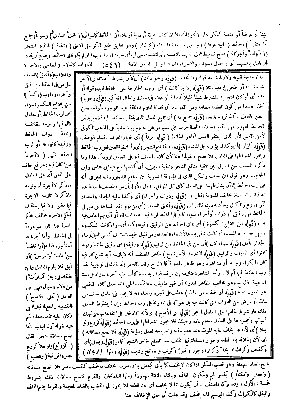 وَأَمَّا أُجْرَةُ مَا اسْتَأْجَرَهُ فَعَلَيْهِ (أَوْ خَلْفُ مَنْ مَاتَ أَوْ مَرِضَ) أَوْ أَبَقَ فَلَا يَلْزَمُ الْعَامِلَ وَإِنَّمَا خَلْفَهُ عَلَى رَبِّهِ (كَمَا رَثَّ) مِنْ دِلَاءٍ وَحِبَالٍ فَهِيَ عَلَى الْعَامِلِ (عَلَى الْأَصَحِّ) فَالتَّشْبِيهُ رَاجِعٌ لِمَا قَبْلَ النَّفْيِ فَكَانَ عَلَيْهِ تَقْدِيمُهُ عَلَيْهِ، ثُمَّ شَبَّهَ بِقَوْلِ أَوَّلِ الْبَابِ إنَّمَا تَصِحُّ مُسَاقَاةُ شَجَرٍ فَقَالَ (كَزَرْعٍ) وَلَوْ بَعْلًا كَزَرْعِ مِصْرَ وَإِفْرِيقِيَّةَ (وَقَصَبٍ) بِفَتْحِ الصَّادِ الْمُهْمَلَةِ وَهُوَ قَصَبُ السُّكَّرِ إذَا كَانَ لَا يُخْلِفُ كَمَا يَأْتِي كَبَعْضِ بِلَادِ الْمَغْرِبِ بِخِلَافِ مَا يُخْلِفُ كَقَصَبِ مِصْرَ فَلَا تَصِحُّ مُسَاقَاتُهُ (وَبَصَلٍ وَمِقْثَأَةٍ) بِكَسْرِ الْمِيمِ وَسُكُونِ الْقَافِ وَبِالثَّاءِ الْمُثَلَّثَةِ مَهْمُوزًا وَمِنْهَا الْبَاذِنْجَانُ وَالْقَرْعُ فَتَصِحُّ مُسَاقَاةُ ذَلِكَ بِشُرُوطٍ خَمْسَةٍ: الْأَوَّلُ، وَقَدْ تَرَكَهُ الْمُصَنِّفُ، أَنْ يَكُونَ مِمَّا لَا يُخْلِفُ أَيْ بَعْدَ قَطْعِهِ فَلَا يَجُوزُ فِي الْقَضْبِ بِالضَّادِ الْمُعْجَمَةِ وَالْقُرْطِ بِضَمِّ الْقَافِ وَالْبَقْلِ كَالْكُرَّاثِ وَكَذَا الْبِرْسِيمُ فَإِنَّهُ يُخْلِفُ وَقَدْ عَلِمْت أَنَّ مَعْنَى الْإِخْلَافِ هُنَا