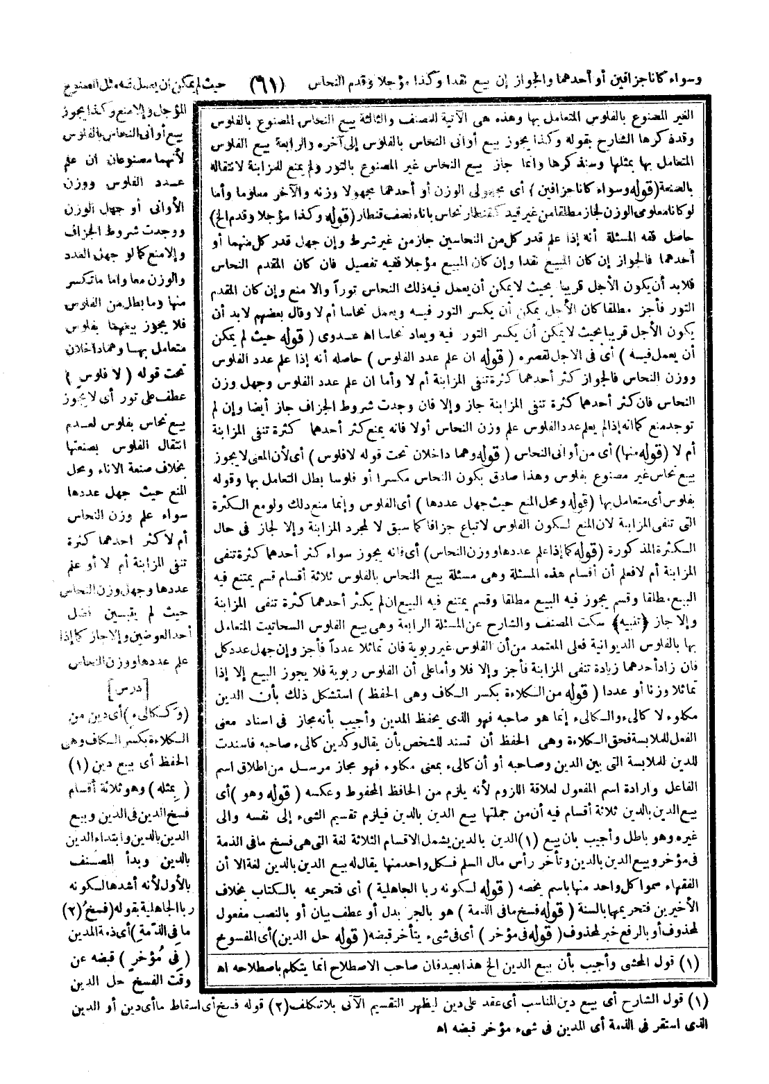 ـــــــــــــــــــــــــــــQالْغَيْرِ الْمَصْنُوعِ بِالْفُلُوسِ الْمُتَعَامَلِ بِهَا وَهَذِهِ هِيَ الْآتِيَةُ لِلْمُصَنِّفِ وَالثَّالِثَةُ بَيْعُ النُّحَاسِ الْمَصْنُوعِ بِالْفُلُوسِ، وَقَدْ ذَكَرَهَا الشَّارِحُ بِقَوْلِهِ، وَكَذَا يَجُوزُ بَيْعُ أَوَانِي النُّحَاسِ بِالْفُلُوسِ إلَى آخِرِهِ وَالرَّابِعَةُ بَيْعُ الْفُلُوسِ الْمُتَعَامَلِ بِهَا بِمِثْلِهَا وَسَنَذْكُرُهَا، وَإِنَّمَا جَازَ بَيْعُ النُّحَاسِ غَيْرَ الْمَصْنُوعِ بِالتَّوْرِ وَلَمْ يُمْنَعْ لِلْمُزَابَنَةِ لِانْتِقَالِهِ بِالصَّنْعَةِ (قَوْلُهُ: وَسَوَاءٌ كَانَا جُزَافَيْنِ) أَيْ مَجْهُولَيْ الْوَزْنِ أَوْ أَحَدُهُمَا مَجْهُولًا وَزْنُهُ وَالْآخَرُ مَعْلُومًا، وَأَمَّا لَوْ كَانَا مَعْلُومَيْ الْوَزْنِ لَجَازَ مُطْلَقًا مِنْ غَيْرِ قَيْدٍ كَقِنْطَارِ نُحَاسٍ بِإِنَاءِ نِصْفِ قِنْطَارٍ (قَوْلُهُ: وَكَذَا مُؤَجَّلًا وَقَدَّمَ إلَخْ) حَاصِلُ فِقْهِ الْمَسْأَلَةِ أَنَّهُ إذَا عَلِمَ قَدْرَ كُلٍّ مِنْ النُّحَاسَيْنِ جَازَ مِنْ غَيْرِ شَرْطٍ، وَإِنْ جَهِلَ قَدْرَ كُلٍّ مِنْهُمَا أَوْ أَحَدِهِمَا فَالْجَوَازُ إنْ كَانَ الْمَبِيعُ نَقْدًا، وَإِنْ كَانَ الْمَبِيعُ مُؤَجَّلًا فَفِيهِ تَفْصِيلٌ، فَإِنْ كَانَ الْمُقَدَّمُ النُّحَاسَ فَلَا بُدَّ أَنْ يَكُونَ الْأَجَلُ قَرِيبًا بِحَيْثُ لَا يُمْكِنُ أَنْ يَعْمَلَ فِيهِ ذَلِكَ النُّحَاسُ تَوْرًا وَإِلَّا مُنِعَ، وَإِنْ كَانَ الْمُقَدَّمُ التَّوْرُ فَأَجِزْ مُطْلَقًا كَانَ الْأَجَلُ يُمْكِنُ أَنْ يُكْسَرَ التَّوْرُ فِيهِ وَيُعْمَلُ نُحَاسًا أَمْ لَا وَقَالَ بَعْضُهُمْ لَا بُدَّ أَنْ يَكُونَ الْأَجَلُ قَرِيبًا بِحَيْثُ لَا يُمْكِنُ أَنْ يُكْسَرَ التَّوْرُ فِيهِ وَيُعَادُ نُحَاسًا اهـ عَدَوِيٌّ (قَوْلُهُ: حَيْثُ لَمْ يُمْكِنْ أَنْ يَعْمَلَ فِيهِ) أَيْ فِي الْأَجَلِ لِقِصَرِهِ (قَوْلُهُ: إنْ عُلِمَ عَدَدُ الْفُلُوسِ) حَاصِلُهُ أَنَّهُ إذَا عُلِمَ عَدَدُ الْفُلُوسِ وَوَزْنُ النُّحَاسِ فَالْجَوَازُ كَثُرَ أَحَدُهُمَا كَثْرَةً تَنْفِي الْمُزَابَنَةَ أَمْ لَا، وَأَمَّا إنْ عُلِمَ عَدَدُ الْفُلُوسِ وَجُهِلَ وَزْنُ النُّحَاسِ، فَإِنْ كَثُرَ أَحَدُهُمَا كَثْرَةً تَنْفِي الْمُزَابَنَةَ جَازَ وَإِلَّا، فَإِنْ وُجِدَتْ شُرُوطُ الْجُزَافِ جَازَ أَيْضًا، وَإِنْ لَمْ تُوجَدْ مُنِعَ كَمَا أَنَّهُ إذَا لَمْ يَعْلَمْ عَدَدَ الْفُلُوسِ عُلِمَ وَزْنُ النُّحَاسِ أَوَّلًا، فَإِنَّهُ يُمْنَعُ كَثُرَ أَحَدُهُمَا كَثْرَةً تَنْفِي الْمُزَابَنَةَ أَمْ لَا (قَوْلُهُ: مِنْهَا) أَيْ مِنْ أَوَانِي النُّحَاسِ (قَوْلُهُ: وَهُمَا دَاخِلَانِ تَحْتَ قَوْلِهِ لَا فُلُوسَ) أَيْ لِأَنَّ الْمَعْنَى لَا يَجُوزُ بَيْعُ نُحَاسٍ غَيْرِ مَصْنُوعٍ بِفُلُوسٍ وَهَذَا صَادِقٌ بِكَوْنِ النُّحَاسِ مُكَسَّرًا أَوْ فُلُوسًا بَطَلَ التَّعَامُلُ بِهَا، وَقَوْلُهُ: بِفُلُوسٍ أَيْ مُتَعَامَلٍ بِهَا (قَوْلُهُ: وَمَحَلُّ الْمَنْعِ حَيْثُ جُهِلَ عَدَدُهَا) أَيْ الْفُلُوسِ وَإِنَّمَا مُنِعَ ذَلِكَ، وَلَوْ مَعَ الْكَثْرَةِ الَّتِي تَنْفِي الْمُزَابَنَةَ؛ لِأَنَّ الْمَنْعَ لِكَوْنِ الْفُلُوسِ لَا تُبَاعُ جُزَافًا كَمَا سَبَقَ لَا لِمُجَرَّدِ الْمُزَابَنَةِ وَإِلَّا لَجَازَ فِي حَالِ الْكَثْرَةِ الْمَذْكُورَةِ (قَوْلُهُ: كَمَا إذَا عُلِمَ عَدَدُهَا وَوَزْنُ النُّحَاسِ) أَيْ فَإِنَّهُ يَجُوزُ سَوَاءٌ كَثُرَ أَحَدُهُمَا كَثْرَةً تَنْفِي الْمُزَابَنَةَ أَمْ لَا، فَعُلِمَ أَنَّ أَقْسَامَ هَذِهِ الْمَسْأَلَةِ وَهِيَ مَسْأَلَةُ بَيْعِ النُّحَاسِ بِالْفُلُوسِ ثَلَاثَةُ أَقْسَامٍ: قِسْمٌ يَمْتَنِعُ فِيهِ الْبَيْعُ مُطْلَقًا، وَقِسْمٌ يَجُوزُ فِيهِ الْبَيْعُ مُطْلَقًا، وَقِسْمٌ يَمْتَنِعُ فِيهِ الْبَيْعُ إنْ ل