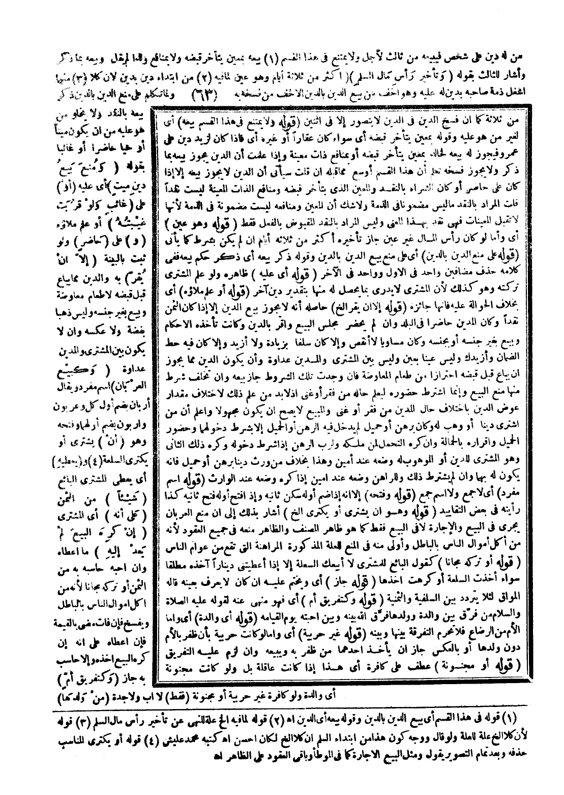 ـــــــــــــــــــــــــــــQمِنْ ثَلَاثَةٍ كَمَا أَنَّ فَسْخَ الدَّيْنِ فِي الدَّيْنِ لَا يُتَصَوَّرُ إلَّا فِي اثْنَيْنِ (قَوْلُهُ: وَلَا يَمْتَنِعُ فِي هَذَا الْقِسْمِ بَيْعُهُ) أَيْ لِغَيْرِ مَنْ هُوَ عَلَيْهِ، وَقَوْلُهُ: بِمُعَيَّنٍ يَتَأَخَّرُ قَبْضُهُ أَيْ سَوَاءٌ كَانَ عَقَارًا أَوْ غَيْرَهُ أَيْ فَإِذَا كَانَ لِزَيْدٍ دَيْنٌ عَلَى عَمْرٍو فَيَجُوزُ لَهُ بَيْعُهُ لِخَالِدٍ بِمُعَيَّنٍ يَتَأَخَّرُ قَبْضُهُ أَوْ بِمَنَافِعَ ذَاتٍ مُعَيَّنَةٍ وَإِذَا عَلِمْت أَنَّ الدَّيْنَ يَجُوزُ بَيْعُهُ بِمَا ذُكِرَ وَلَا يَجُوزُ فَسْخُهُ تَعْلَمُ أَنَّ هَذَا الْقِسْمَ أَوْسَعُ مِمَّا قَبْلَهُ إنْ قُلْت: سَيَأْتِي أَنَّ الدَّيْنَ لَا يَجُوزُ بَيْعُهُ إلَّا إذَا كَانَ عَلَى حَاضِرٍ أَوْ كَانَ الشِّرَاءُ بِالنَّقْدِ وَالْمُعَيَّنُ الَّذِي يَتَأَخَّرُ قَبْضُهُ وَمَنَافِعُ الذَّاتِ الْمُعَيَّنَةِ لَيْسَتْ نَقْدًا قُلْت الْمُرَادُ بِالنَّقْدِ مَا لَيْسَ مَضْمُونًا فِي الذِّمَّةِ وَلَا شَكَّ أَنَّ الْمُعَيَّنَ وَمَنَافِعَهُ لَيْسَتْ مَضْمُونَةً فِي الذِّمَّةِ؛ لِأَنَّهَا لَا تَقْبَلُ الْمُعَيَّنَاتِ فَهِيَ نَقْدٌ بِهَذَا الْمَعْنَى وَلَيْسَ الْمُرَادُ بِالنَّقْدِ الْمَقْبُوضَ بِالْفِعْلِ فَقَطْ