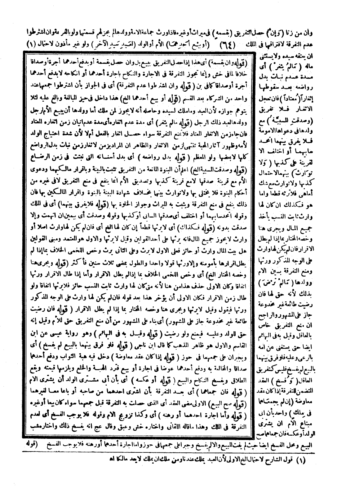 (قَوْلُهُ: وَيَجْرِي هُنَا وَخَصَّهُ الْمُخْتَارُ إلَخْ) أَيْ وَخَصَّ اللَّخْمِيَّ الْخِلَافَ بِمَا إذَا لَمْ يَطُلْ الْإِقْرَارُ، وَأَمَّا إذَا طَالَ الْإِقْرَارُ وَرِثَهَا اتِّفَاقًا وَكَانَ الْأَوْلَى حَذْفُ هَذَا مِنْ هُنَا؛ لِأَنَّهُ مَتَى كَانَ لَهَا وَارِثٌ ثَابِتُ النَّسَبِ حَائِزٌ فَلَا يَرِثُهَا اتِّفَاقًا، وَلَوْ طَالَ زَمَنُ الْإِقْرَارِ فَكَانَ الْأَوْلَى أَنْ يُؤَخِّرَ هَذَا بَعْدَ قَوْلِهِ، فَإِنْ لَمْ يَكُنْ لَهَا وَارِثٌ عَلَى الْوَجْهِ الْمَذْكُورِ وَرِثَهَا فَيَقُولُ وَقِيلَ لَا يَرِثُهَا وَيَجْرِي هُنَا وَخَصَّهُ الْمُخْتَارُ بِمَا إذَا لَمْ يَطُلْ الْإِقْرَارُ (قَوْلُهُ: فَإِنْ رَضِيَتْ طَائِعَةً غَيْرَ مَخْدُوعَةٍ جَازَ عَلَى الْمَشْهُورِ) أَيْ بِنَاءً عَلَى الْمَشْهُورِ مِنْ أَنَّ مَنْعَ التَّفْرِيقِ حَقٌّ لِلْأُمِّ وَقِيلَ: إنَّهُ حَقٌّ لِلْوَلَدِ وَعَلَيْهِ فَيُمْنَعُ، وَلَوْ رَضِيَتْ (قَوْلُهُ: وَقِيلَ بِهِ فِي الْبَهَائِمِ) وَهُوَ رِوَايَةُ عِيسَى عَنْ ابْنِ الْقَاسِمِ وَالْأَوَّلُ هُوَ ظَاهِرُ الْمَذْهَبِ كَمَا قَالَ ابْنُ نَاجِيٍّ (قَوْلُهُ: فَلَوْ فَرَّقَ بَيْنَهُمَا بِالْبَيْعِ لَمْ يُفْسَخْ) أَيْ وَيُجْبَرَانِ عَلَى جَمْعِهِمَا فِي حَوْزٍ (قَوْلُهُ: إذَا كَانَ عَقْدَ مُعَاوَضَةٍ) دَخَلَ فِيهِ هِبَةُ الثَّوَابِ وَدَفَعَ أَحَدُهُمَا صَدَاقًا وَالْمُخَالَعَةُ بِهِ وَدَفَعَ أَحَدُهُمَا عِوَضًا فِي إجَارَةٍ أَوْ بَيْعٍ فَتُرَدُّ الْهِبَةُ وَالْخُلْعُ وَيَلْزَمُهَا قِيمَتُهُ وَيَقَعُ الطَّلَاقُ وَيُفْسَخُ النِّكَاحُ وَالْبَيْعُ (قَوْلُهُ: أَوْ عَكْسُهُ) أَيْ بِأَنْ أَبَى مُشْتَرِي الْوَلَدِ أَنْ يَشْتَرِيَ الْأُمَّ (قَوْلُهُ: فَإِنْ جَمَعَاهُمَا) أَيْ بَعْدَ التَّفْرِقَةِ بِأَنْ اشْتَرَى أَحَدُهُمَا مِنْ صَاحِبِهِ أَوْ بَاعَا مَعًا لِغَيْرِهِمَا (قَوْلُهُ: صَحَّ الْبَيْعُ) الْأَوْلَى مُضِيُّ الْعَقْدِ أَيْ الَّذِي حَصَلَتْ بِهِ التَّفْرِقَةُ قَبْلَ جَمْعِهِمَا سَوَاءٌ كَانَ بَيْعًا أَوْ غَيْرَهُ.