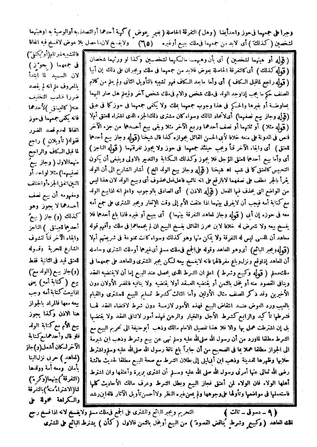 وَجُبِرَا عَلَى جَمْعِهِمَا فِي حَوْزِ وَاحِدٍ أَيْضًا (وَهَلْ) التَّفْرِقَةُ الْحَاصِلَةُ (بِغَيْرِ عِوَضٍ) كَهِبَةِ أَحَدِهِمَا أَوْ التَّصَدُّقُ بِهِ أَوْ الْوَصِيَّةُ بِهِ أَوْ هِبَتُهُمَا لِشَخْصَيْنِ (كَذَلِكَ) أَيْ لَا بُدَّ مِنْ جَمْعِهِمَا فِي مِلْكٍ بِبَيْعٍ أَوْ غَيْرِهِ وَلَا يَفْسَخُ؛ لِأَنَّ مَا حَصَلَ بِلَا عِوَضٍ لَا فَسْخَ فِيهِ اتِّفَاقًا فَالتَّشْبِيهُ غَيْرُ تَامٍّ (أَوْ يَكْتَفِي) فِي جَمْعِهِمَا (بِحَوْزٍ) ؛ لِأَنَّ السَّيِّدَ لَمَّا ابْتَدَأَ بِالْمَعْرُوفِ عَلِمَ أَنَّهُ لَمْ يَقْصِدْ ضَرَرًا فَنَاسَبَ التَّخْفِيفَ عَنْهُ (كَالْعِتْقِ) لِأَحَدِهِمَا، فَإِنَّهُ يَكْفِي جَمْعُهُمَا فِي حَوْزٍ اتِّفَاقًا لِعَدَمِ قَصْدِ الضَّرَرِ فَقَوْلُهُ (تَأْوِيلَانِ) رَاجِعٌ لِمَا قَبْلَ الْكَافِ وَالرَّاجِحُ مِنْهُمَا الْأَوَّلُ