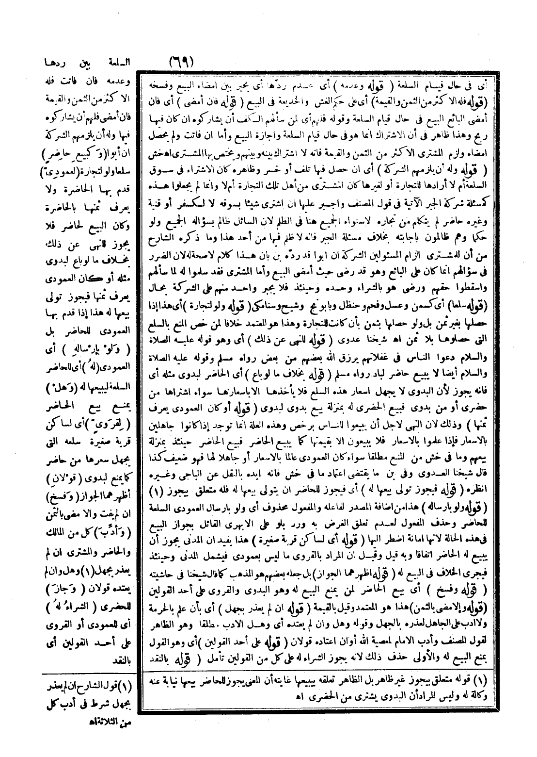 (وَكَبَيْعِ حَاضِرٍ) سِلَعًا، وَلَوْ لِتِجَارَةٍ (لِعَمُودِيٍّ) قَدِمَ بِهَا الْحَاضِرَةَ وَلَا يَعْرِفُ ثَمَنَهَا بِالْحَاضِرَةِ وَكَانَ الْبَيْعُ لِحَاضِرٍ فَلَا يَجُوزُ لِلنَّهْيِ عَنْ ذَلِكَ بِخِلَافِ مَا لَوْ بَاعَ لِبَدْوِيٍّ مِثْلَهُ أَوْ كَانَ الْعَمُودِيُّ يَعْرِفُ ثَمَنَهَا فَيَجُوزُ تَوَلِّي بَيْعِهَا لَهُ هَذَا إذَا قَدِمَ بِهَا الْعَمُودِيُّ لِلْحَاضِرِ بَلْ (وَلَوْ بِإِرْسَالِهِ) أَيْ الْعَمُودِيِّ (لَهُ) أَيْ لِلْحَاضِرِ السِّلْعَةُ لِيَبِيعَهَا لَهُ