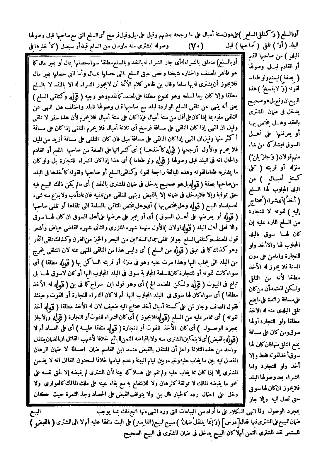 (قَوْلُهُ: بَلْ هُوَ صَحِيحٌ يَدْخُلُ فِي ضَمَانِ الْمُشْتَرِي بِالْعَقْدِ) أَيْ مَا لَمْ يَكُنْ ذَلِكَ الْمَبِيعُ فِيهِ حَقُّ تَوْفِيَةٍ وَإِلَّا فَلَا يَدْخُلُ فِي ضَمَانِهِ إلَّا بِالْقَبْضِ وَيُنْهَى الْمُتَلَقِّي عَنْ تَلَقِّيهِ، فَإِنْ عَادَ أُدِّبَ وَلَا يُنْزَعُ مِنْهُ شَيْءٌ لِعَدَمِ فَسَادِ الْبَيْعِ (قَوْلُهُ: وَهَلْ يَخْتَصُّ بِهَا) أَيْ وَهَلْ يَخْتَصُّ الْمُتَلَقِّي بِالسِّلْعَةِ الَّتِي تَلَقَّاهَا أَوْ تَلَقَّى صَاحِبُهَا (قَوْلُهُ: أَوْ يَعْرِضُهَا عَلَى أَهْلِ السُّوقِ) أَيْ أَوْ يُجْبَرُ عَلَى عَرْضِهَا عَلَى أَهْلِ السُّوقِ إنْ كَانَ لَهَا سُوقٌ وَإِلَّا فَعَلَى أَهْلِ الْبَلَدِ (قَوْلُهُ: قَوْلَانِ) الْأَوَّلُ مِنْهُمَا شَهَرَهُ الْمَازِرِيُّ وَالثَّانِي شَهَرَهُ الْقَاضِي عِيَاضٌ وَأَشْعَرَ قَوْلُ الْمُصَنِّفِ وَكَتَلَقِّي السِّلَعِ جَوَازَ تَلَقِّي جِمَالِ السَّائِقِينَ مِنْ الْبَحْرِ وَالْخُبْزِ مِنْ الْفُرْنِ وَكَذَلِكَ تَلَقِّي الثِّمَارِ وَهُوَ كَذَلِكَ كَمَا فِي عبق
