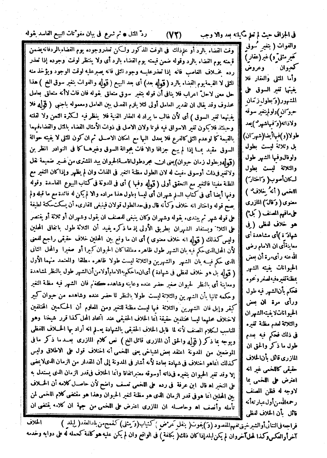 (قَوْلُهُ: بَلْ هُوَ خِلَافٌ لَفْظِيٌّ فِي شَهَادَةٍ) أَيْ أَنَّ مَا حَكَمَ بِهِ الْإِمَامُ أَوَّلًا مِنْ أَنَّ الشَّهْرَ طُولٌ بِالنَّظَرِ لِمُشَاهَدَةٍ وَمُعَايَنَةٍ أَيْ بِالنَّظَرِ لِحَيَوَانٍ صَغِيرٍ حَضَرَ عِنْدَهُ وَعَايَنَهُ وَشَاهَدَهُ كَغَنَمٍ فَإِنَّ الشَّهْرَ فِيهِ مَظِنَّةُ التَّغَيُّرِ وَحُكْمُهُ ثَانِيًا بِأَنَّ الشَّهْرَيْنِ وَالثَّلَاثَةَ لَيْسَتْ طُولًا بِالنَّظَرِ لَمَّا حَضَرَ عِنْدَهُ وَشَاهَدَهُ مِنْ حَيَوَانٍ كَبِيرٍ كَبَقَرٍ وَإِبِلٍ فَإِنَّ الشَّهْرَيْنِ وَالثَّلَاثَةَ فِيهَا لَيْسَتْ مَظِنَّةً لِلتَّغَيُّرِ وَمِنْ الْمَعْلُومِ أَنَّ الْحُكْمَيْنِ الْمُخْتَلِفَيْنِ لِاخْتِلَافِ مَحَلُّهُمَا لَيْسَا مُخْتَلِفَيْنِ حَقِيقَةً إنَّمَا الْخِلَافُ الْحَقِيقِيُّ عِنْدَ اتِّحَادِ الْمَحِلِّ، كَذَا قَرَّرَ شَيْخُنَا وَهُوَ الْمُنَاسِبُ لِكَلَامِ الْمُصَنِّفِ؛ لِأَنَّهُ لَمَّا قَابَلَ الْخِلَافَ الْحَقِيقِيَّ بِالشَّهَادَةِ يَعْلَمُ أَنَّهُ أَرَادَ بِهَا الْخِلَافَ اللَّفْظِيَّ وَيُوَجِّهُ بِمَا ذُكِرَ.
