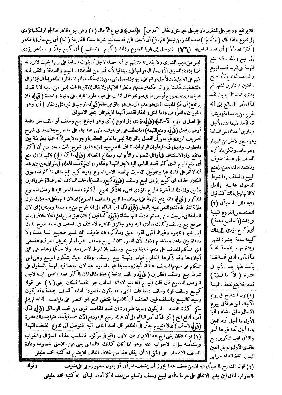 [دَرْسٌ] (فَصْلٌ) فِي بُيُوعِ الْآجَالِ وَهِيَ بُيُوعٌ ظَاهِرُهَا الْجَوَازُ لَكِنَّهَا تُؤَدِّي إلَى مَمْنُوعٍ، وَلِذَا قَالَ (وَمَنَعَ) عِنْدَ مَالِكٍ وَمَنْ تَبِعَهُ (لِلتُّهْمَةِ) أَيْ لِأَجْلِ ظَنِّ قَصْدِ مَا مُنِعَ شَرْعًا سَدًّا لِلذَّرِيعَةِ (مَا) أَيْ بَيْعٌ جَائِزٌ فِي الظَّاهِرِ (كَثُرَ قَصْدُهُ) أَيْ قَصْدُ النَّاسِ لَهُ لِلتَّوَصُّلِ إلَى الرِّبَا الْمَمْنُوعِ وَذَلِكَ (كَبَيْعٍ وَسَلَفٍ) أَيْ كَبَيْعٍ جَائِزٍ فِي الظَّاهِرِ يُؤَدِّي إلَى بَيْعٍ وَسَلَفٍ، فَإِنَّهُ يَمْنَعُ لِلتُّهْمَةِ عَلَى أَنَّهُمَا قَصْدُ الْبَيْعِ وَالسَّلَفِ الْمَمْنُوعِ كَأَنْ يَبِيعَ سِلْعَتَيْنِ بِدِينَارَيْنِ لِشَهْرٍ ثُمَّ يَشْتَرِي إحْدَاهُمَا بِدِينَارٍ نَقْدًا فَآلَ أَمْرُ الْبَائِعِ إلَى أَنَّهُ خَرَجَ مِنْ يَدِهِ سِلْعَةَ وَدِينَارًا نَقْدًا أَخَذَ عَنْهُمَا عِنْدَ الْأَجَلِ دِينَارَيْنِ أَحَدُهُمَا عَنْ السِّلْعَةِ وَهُوَ بَيْعٌ وَالْآخَرُ عَنْ الدِّينَارِ وَهُوَ سَلَفٌ وَلَكِنْ مَا ذَكَرَهُ الْمُصَنِّفُ فِي هَذَا ضَعِيفٌ وَالْمُعْتَمَدُ مَا قَدَّمَهُ مِنْ أَنَّ مَنْعَ الْبَيْعِ وَالسَّلَفِ إذَا شَرَطَ الدُّخُولَ عَلَيْهِ بِالْفِعْلِ لَا الِاتِّهَامِ عَلَى ذَلِكَ، كَذَا قِيلَ وَفِيهِ نَظَرٌ لِمَا سَيَأْتِي لِلْمُصَنِّفِ مِنْ الْفُرُوعِ الْمَبْنِيَّةِ عَلَى ذَلِكَ (وَسَلَفٍ بِمَنْفَعَةٍ) أَيْ وَكَبَيْعٍ يُؤَدِّي إلَى ذَلِكَ كَبَيْعِهِ سِلْعَةً بِعَشَرَةٍ لِشَهْرٍ وَيَشْتَرِيهَا بِخَمْسَةٍ نَقْدًا فَآلَ أَمْرُهُ لِدَفْعِ خَمْسَةٍ نَقْدًا يَأْخُذُ عَنْهَا بَعْدَ الْأَجَلِ عَشَرَةً (لَا مَا قَلَّ) قَصْدُهُ فَلَا يَمْنَعُ لِضَعْفِ التُّهْمَةِ