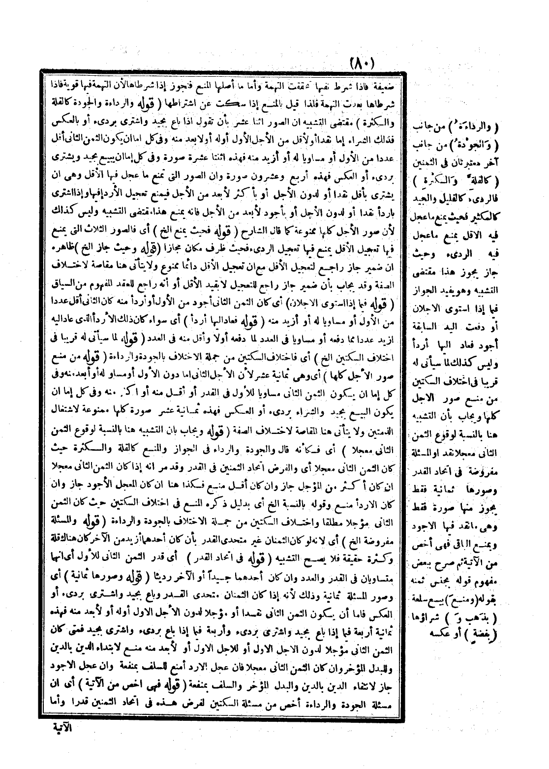 (وَالرَّدَاءَةُ) مِنْ جَانِبٍ (وَالْجَوْدَةُ) مِنْ جَانِبٍ آخَرَ مُعْتَبَرَتَانِ فِي الثَّمَنَيْنِ (كَالْقِلَّةِ وَالْكَثْرَةِ) فَالرَّدِيءُ كَالْقَلِيلِ وَالْجَيِّدُ كَالْكَثِيرِ فَحَيْثُ يُمْنَعُ مَا عُجِّلَ فِيهِ الْأَقَلُّ يُمْنَعُ مَا عُجِّلَ فِيهِ الرَّدِيءُ وَحَيْثُ جَازَ يَجُوزُ هَذَا مُقْتَضَى التَّشْبِيهِ وَهُوَ يُفِيدُ الْجَوَازَ فِيمَا إذَا اسْتَوَى الْأَجَلَانِ أَوْ دَفَعَتْ الْيَدُ السَّابِقَةُ أَجْوَدَ فَعَادَ إلَيْهَا أَرْدَأَ وَلَيْسَ كَذَلِكَ لِمَا سَيَأْتِي لَهُ قَرِيبًا فِي اخْتِلَافِ السِّكَّتَيْنِ مِنْ مَنْعِ صُوَرِ الْأَجَلِ كُلِّهَا وَيُجَابُ بِأَنَّ التَّشْبِيهَ هُنَا بِالنِّسْبَةِ لِوُقُوعِ الثَّمَنِ الثَّانِي مُعَجَّلًا نَقْدًا وَالْمَسْأَلَةُ مَفْرُوضَةٌ فِي اتِّحَادِ الْقَدْرِ وَصُوَرُهَا ثَمَانِيَةٌ فَقَطْ يَجُوزُ مِنْهَا صُورَةٌ فَقَطْ وَهِيَ مَا نُقِدَ فِيهَا الْأَجْوَدُ وَيُمْنَعُ الْبَاقِي فَهِيَ أَخَصُّ مِنْ الْآتِيَةِ.
