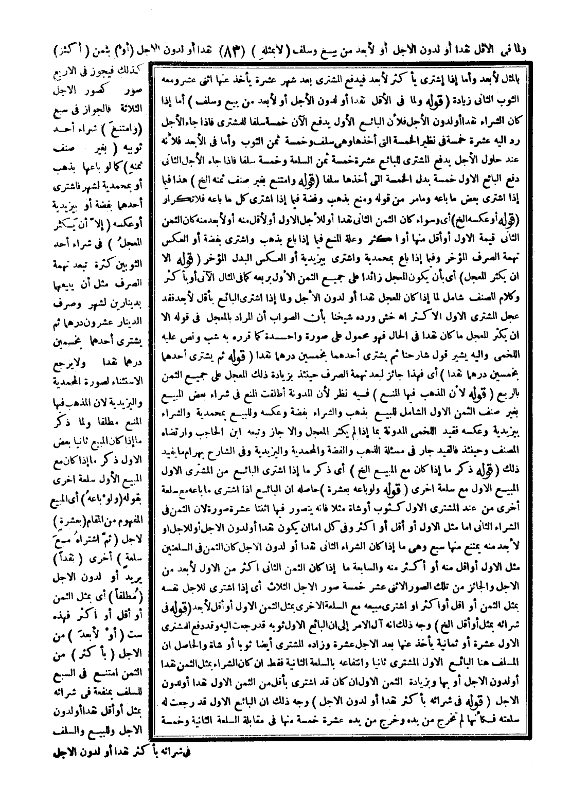 (وَامْتَنَعَ) شِرَاءُ أَحَدِ ثَوْبَيْهِ (بِغَيْرِ صِنْفِ ثَمَنِهِ) كَمَا لَوْ بَاعَهَا بِذَهَبٍ أَوْ بِمُحَمَّدِيَّةٍ لِشَهْرٍ فَاشْتَرَى أَحَدَهُمَا بِفِضَّةٍ أَوْ بِيَزِيدِيَّةٍ أَوْ عَكْسُهُ (إلَّا أَنْ يَكْثُرَ الْمُعَجَّلُ) فِي شِرَاءِ أَحَدِ الثَّوْبَيْنِ كَثْرَةً تُبْعِدُ تُهْمَةَ الصَّرْفِ مِثْلَ أَنْ يَبِيعَهُمَا بِدِينَارَيْنِ لِشَهْرٍ وَصَرْفُ الدِّينَارِ عِشْرُونَ دِرْهَمًا ثُمَّ يَشْتَرِي أَحَدَهُمَا بِخَمْسِينَ دِرْهَمًا نَقْدًا وَلَا يَرْجِعُ الِاسْتِثْنَاءُ لِصُورَةِ الْمُحَمَّدِيَّةِ وَالْيَزِيدِيَّةِ؛ لِأَنَّ الْمَذْهَبَ فِيهَا الْمَنْعُ مُطْلَقًا.