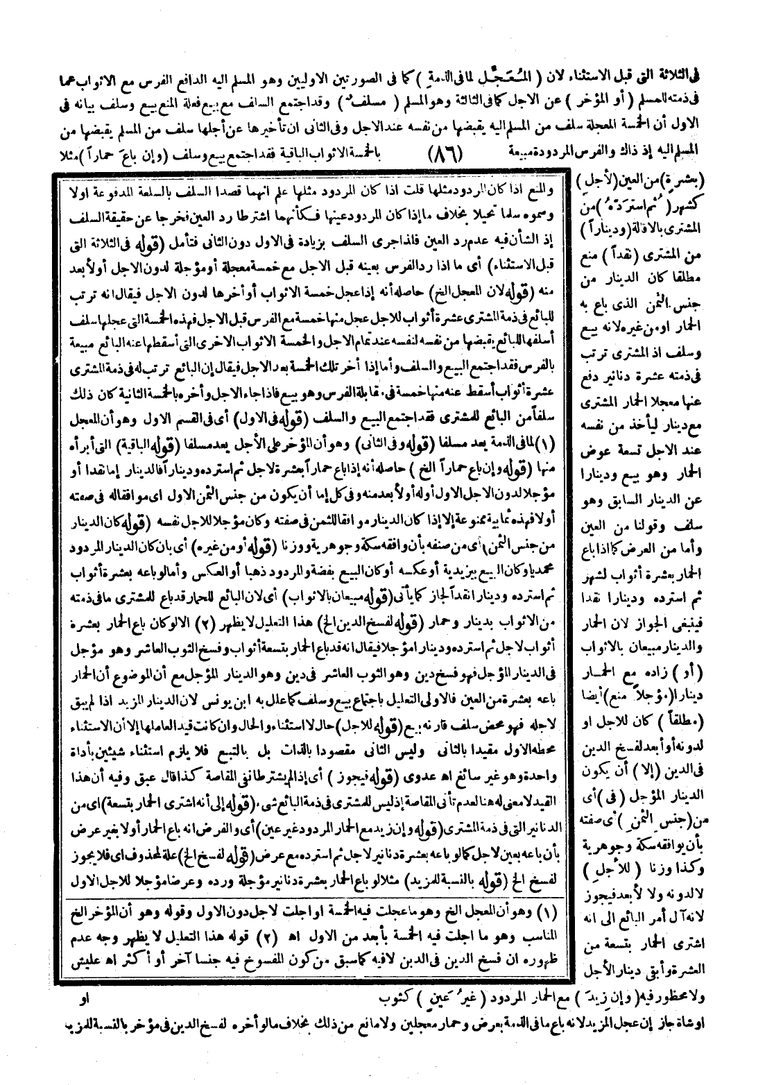 فِي الثَّلَاثَةِ الَّتِي قَبْلَ الِاسْتِثْنَاءِ؛ لِأَنَّ (الْمُعَجَّلُ لِمَا فِي الذِّمَّةِ) كَمَا فِي الصُّورَتَيْنِ الْأَوَّلِيَّيْنِ وَهُوَ الْمُسَلَّمُ إلَيْهِ الدَّافِعُ الْفَرَسَ مِنْ الْأَثْوَابِ عَمَّا فِي ذِمَّتِهِ لِلْمُسَلَّمِ (أَوْ الْمُؤَخَّرِ) عَنْ الْأَجَلِ كَمَا فِي الثَّالِثَةِ وَهُوَ الْمُسْلَمُ (مُسَلِّفٌ) وَقَدْ اجْتَمَعَ السَّلَفُ مَعَ بَيْعٍ فَعِلَّةُ الْمَنْعِ بَيْعٌ وَسَلَفٌ بَيَانُهُ فِي الْأَوَّلِ أَنَّ الْخَمْسَةَ الْمُعَجَّلَةَ سَلَفٌ مِنْ الْمُسَلَّمِ إلَيْهِ يَقْبِضُهَا مِنْ نَفْسِهِ عِنْدَ الْأَجَلِ وَفِي الثَّانِي أَنَّ تَأْخِيرَهَا عَنْ أَجَلِهَا سَلَفٌ مِنْ الْمُسْلِمِ يَقْبِضُهَا مِنْ الْمُسَلَّمِ إلَيْهِ إذْ ذَاكَ وَالْفَرَسُ الْمَرْدُودَةُ مَبِيعَةٌ بِالْخَمْسَةِ الْأَثْوَابِ الْبَاقِيَةِ فَقَدْ اجْتَمَعَ بَيْعٌ وَسَلَفٌ (وَإِنْ بَاعَ حِمَارًا) مَثَلًا (بِعَشْرَةٍ) مِنْ الْعَيْنِ (لِأَجَلٍ) كَشَهْرٍ (ثُمَّ اسْتَرَدَّهُ) مِنْ الْمُشْتَرِي بِالْإِقَالَةِ (وَدِينَارًا) مِنْ الْمُشْتَرِي (نَقْدًا) مُنِعَ مُطْلَقًا كَانَ الدِّينَارُ مِنْ جِنْسِ الثَّمَنِ الَّذِي بَاعَ بِهِ الْحِمَارَ أَوْ مِنْ غَيْرِهِ؛ لِأَنَّهُ بَيْعٌ وَسَلَفٌ إذْ الْمُشْتَرِي تَرَتَّبَ فِي ذِمَّتِهِ عَشَرَةُ دَنَانِيرَ دَفَعَ عَنْهَا مُعَجَّلًا الْحِمَارَ الْمُشْتَرَى مَعَ دِينَارٍ لِيَأْخُذَ مِنْ نَفْسِهِ عِنْدَ الْأَجَلِ تِسْعَةً عِوَضُ الْحِمَارِ وَهُوَ بَيْعٌ وَدِينَارًا عَنْ الدِّينَارِ السَّابِقِ وَهُوَ سَلَفٌ وَقَوْلُنَا مِنْ الْعَيْنِ، وَأَمَّا مِنْ الْعَرَضِ كَمَا إذَا بَاعَ الْحِمَارَ بِعَشَرَةِ أَثْوَابٍ لِشَهْرٍ ثُمَّ اسْتَرَدَّهُ وَدِينَارًا نَقْدًا فَيَنْبَغِي الْجَوَازُ؛ لِأَنَّ الْحِمَارَ وَالدِّينَارَ مَبِيعَانِ بِالْأَثْوَابِ (أَوْ) زَادَهُ مَعَ الْحِمَارِ دِينَارًا (مُؤَجَّلًا) مُنِعَ أَيْضًا (مُطْلَقًا) كَانَ لِلْأَجَلِ أَوْ لِدُونِهِ أَوْ أَبْعَدَ لِفَسْخِ الدَّيْنِ فِي الدَّيْنِ (إلَّا) أَنْ يَكُونَ الدِّينَارُ الْمُؤَجَّلُ (فِي) أَيْ مِنْ (جِنْسِ الثَّمَنِ) أَيْ صِفَتِهِ بِأَنْ يُوَافِقَهُ سِكَّةً وَجَوْهَرِيَّةً، وَكَذَا وَزْنًا (لِلْأَجَلِ) لَا لِدُونِهِ وَلَا لِأَبْعَدَ فَيَجُوزُ؛ لِأَنَّهُ آلَ أَمْرُ الْبَائِعِ إلَى أَنَّهُ اشْتَرَى الْحِمَارَ بِتِسْعَةٍ مِنْ الْعَشَرَةِ وَأَبْقَى دِينَارَ الْأَجَلِ وَلَا مَحْظُورَ فِيهِ (وَإِنْ زِيدَ) مَعَ الْحِمَارِ الْمَرْدُودِ (غَيْرُ مُعَيَّنٍ) كَثَوْبٍ أَوْ شَاةٍ جَازَ إنْ عُجِّلَ الْمَزِيدُ؛ لِأَنَّهُ بَاعَ مَا فِي الذِّمَّةِ بِعَرَضٍ وَحِمَارٍ مُعَجَّلَيْنِ وَلَا مَانِعَ مِنْ ذَلِكَ بِخِلَافِ مَا لَوْ أَخَّرَهُ لِفَسْخِ الدَّيْنِ فِي مُؤَخَّرٍ بِالنِّسْبَةِ لِلْمَزِيدِ.