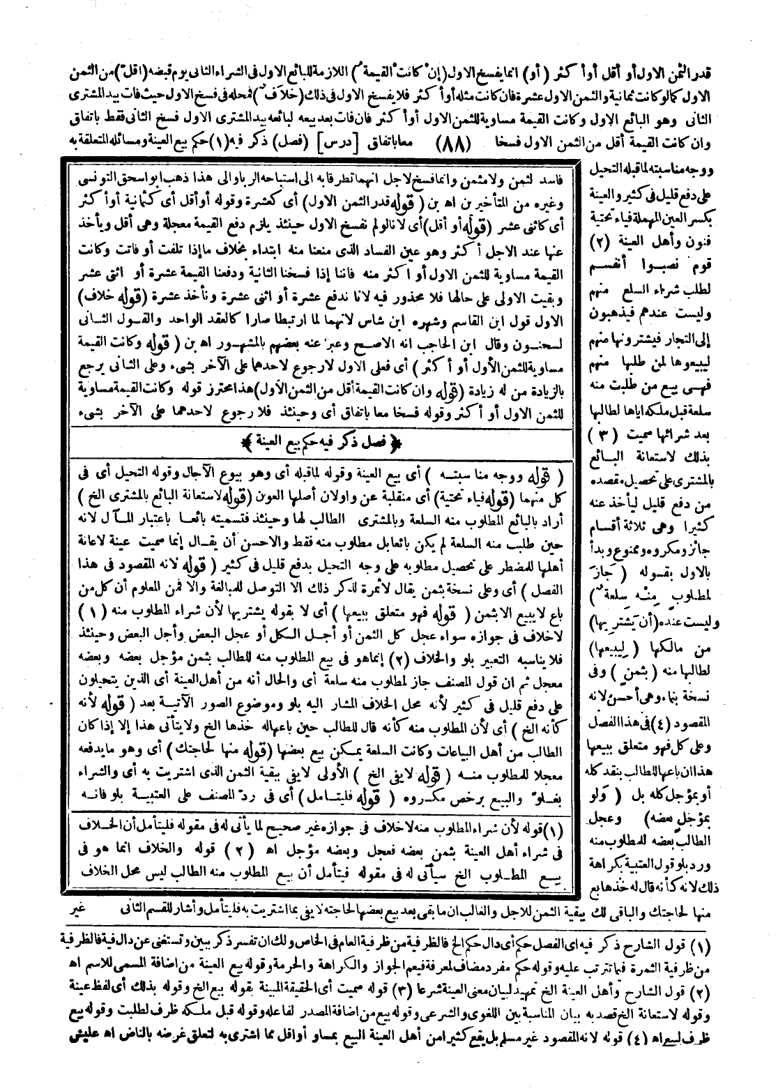 [دَرْسٌ] (فَصْلٌ) ذَكَرَ فِيهِ حُكْمَ بَيْعِ الْعِينَةِ وَمَسَائِلَهُ الْمُتَعَلِّقَةَ بِهِ، وَوَجْهُ مُنَاسَبَتِهِ لِمَا قَبْلَهُ التَّحَيُّلُ عَلَى دَفْعِ قَلِيلٍ فِي كَثِيرٍ وَالْعِينَةُ بِكَسْرِ الْعَيْنِ الْمُهْمَلَةِ فَيَاءٌ تَحْتِيَّةٌ فَنُونٌ، وَأَهْلُ الْعِينَةِ قَوْمٌ نَصَبُوا أَنْفُسَهُمْ لِطَلَبِ شِرَاءِ السِّلَعِ مِنْهُمْ وَلَيْسَتْ عِنْدَهُمْ فَيَذْهَبُونَ إلَى التُّجَّارِ فَيَشْتَرُونَهَا مِنْهُمْ لِيَبِيعُوهَا لِمَنْ طَلَبَهَا مِنْهُمْ فَهِيَ بَيْعُ مَنْ طُلِبَتْ مِنْهُ سِلْعَةً قَبْلَ مِلْكِهِ إيَّاهَا لِطَالِبِهَا بَعْدَ شِرَائِهَا؛ سُمِّيَتْ بِذَلِكَ لِاسْتِعَانَةِ الْبَائِعِ بِالْمُشْتَرِي عَلَى تَحْصِيلِ مَقْصِدِهِ مِنْ دَفْعِ قَلِيلٍ لِيَأْخُذَ عَنْهُ كَثِيرًا، وَهِيَ ثَلَاثَةُ أَقْسَامٍ: جَائِزٌ وَمَكْرُوهٌ وَمَمْنُوعٌ وَبَدَأَ بِالْأَوَّلِ بِقَوْلِهِ (جَازَ لِمَطْلُوبٍ مِنْهُ سِلْعَةً) وَلَيْسَتْ عِنْدَهُ (أَنْ يَشْتَرِيَهَا) مِنْ مَالِكِهَا (لِيَبِيعَهَا) لِطَالِبِهَا مِنْهُ (بِثَمَنٍ) وَفِي نُسْخَةٍ بِنَمَاءٍ، وَهِيَ أَحْسَنُ؛ لِأَنَّهُ الْمَقْصُودُ فِي هَذَا الْفَصْلِ وَعَلَى كُلٍّ فَهُوَ مُتَعَلِّقٌ بِبَيْعِهَا هَذَا إنْ بَاعَهَا لِلطَّالِبِ بِنَقْدٍ كُلِّهِ، أَوْ بِمُؤَجَّلٍ كُلِّهِ بَلْ (وَلَوْ بِمُؤَجَّلٍ بَعْضُهُ) وَعَجَّلَ الطَّالِبُ بَعْضَهُ لِلْمَطْلُوبِ مِنْهُ وَرَدَ بِلَوْ قَوْلُ الْعُتْبِيَّةِ بِكَرَاهَةِ ذَلِكَ؛ لِأَنَّهُ كَأَنَّهُ قَالَ لَهُ خُذْهَا بِعْ مِنْهَا لِحَاجَتِك، وَالْبَاقِي لَك بِبَقِيَّةِ الثَّمَنِ لِلْأَجَلِ، وَالْغَالِبُ أَنَّ مَا بَقِيَ بَعْدَ بَيْعِ بَعْضِهَا لِحَاجَتِهِ لَا يَفِي بِمَا اُشْتُرِيَتْ بِهِ فَلْيُتَأَمَّلْ. وَأَشَارَ لِلْقَسَمِ الثَّانِي