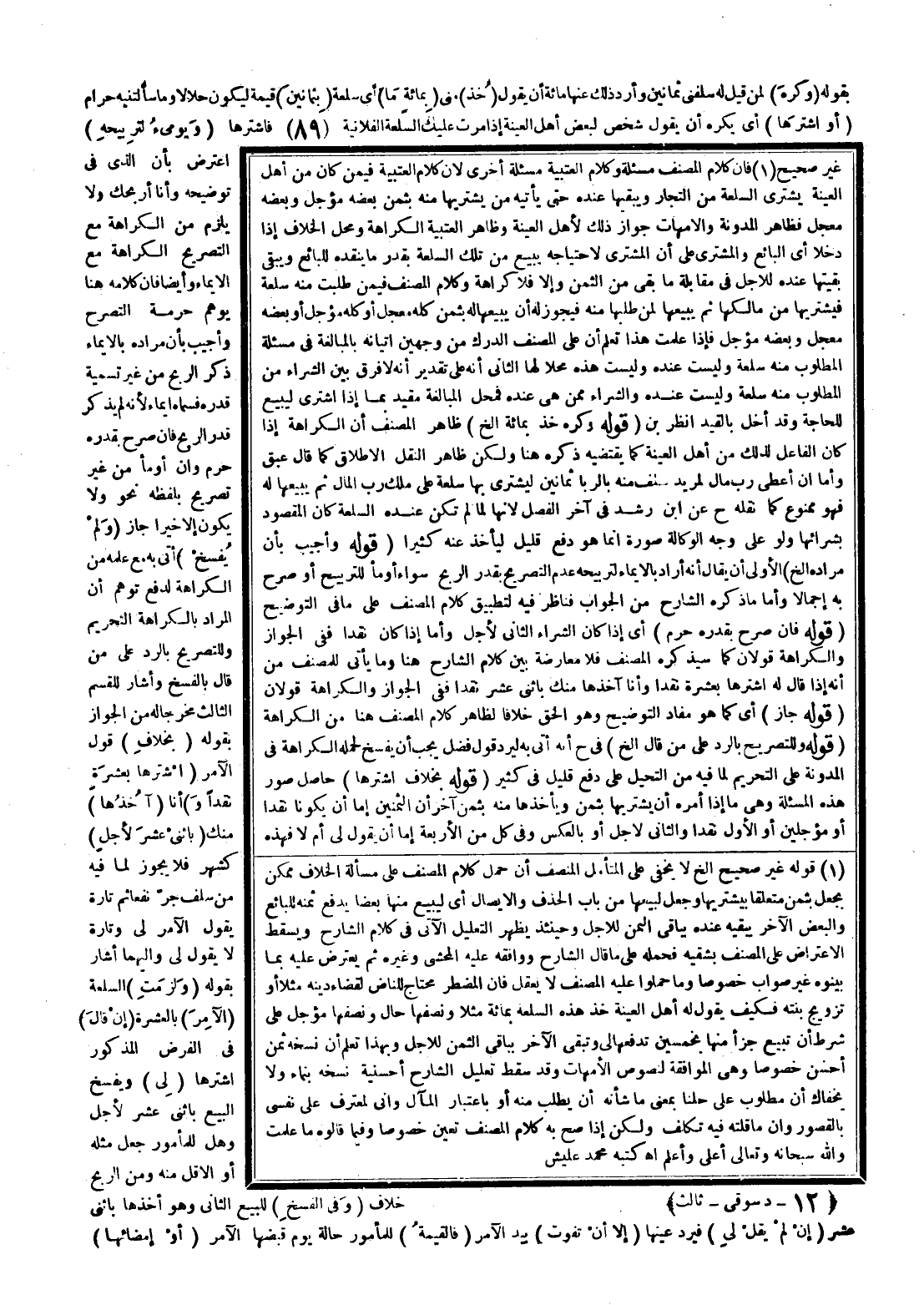 ـــــــــــــــــــــــــــــQغَيْرُ صَحِيحٍ فَإِنَّ كَلَامَ الْمُصَنِّفِ مَسْأَلَةٌ وَكَلَام الْعُتْبِيَّةِ مَسْأَلَةٌ أُخْرَى؛ لِأَنَّ كَلَامَ الْعُتْبِيَّةِ فِيمَنْ كَانَ مِنْ أَهْلِ الْعِينَةِ يَشْتَرِي السِّلْعَةَ مِنْ التُّجَّارِ وَيُبْقِيهَا عِنْدَهُ حَتَّى يَأْتِيَهُ مَنْ يَشْتَرِيهَا مِنْهُ بِثَمَنٍ بَعْضُهُ مُؤَجَّلٌ وَبَعْضُهُ مُعَجَّلٌ فَظَاهِرُ الْمُدَوَّنَةِ وَالْأُمَّهَاتِ جَوَازُ ذَلِكَ لِأَهْلِ الْعِينَةِ وَظَاهِرُ الْعُتْبِيَّةِ الْكَرَاهَةُ وَمَحَلُّ الْخِلَافِ إذَا دَخَلَا أَيْ الْبَائِعُ وَالْمُشْتَرِي عَلَى أَنَّ الْمُشْتَرِيَ لِاحْتِيَاجِهِ يَبِيعُ مِنْ تِلْكَ السِّلْعَةِ بِقَدْرِ مَا يَنْقُدُهُ لِلْبَائِعِ وَيُبْقِي بَقِيَّتَهَا عِنْدَهُ لِلْأَجَلِ فِي مُقَابَلَةِ مَا بَقِيَ مِنْ الثَّمَنِ، وَإِلَّا فَلَا كَرَاهَةَ وَكَلَامُ الْمُصَنِّفِ فِيمَنْ طُلِبَتْ مِنْهُ سِلْعَةٌ فَيَشْتَرِيهَا مِنْ مَالِكِهَا، ثُمَّ يَبِيعُهَا لِمَنْ طَلَبَهَا مِنْهُ فَيَجُوزُ لَهُ أَنْ يَبِيعَهَا لَهُ بِثَمَنٍ كُلِّهِ مُعَجَّلٍ، أَوْ كُلِّهِ مُؤَجَّلٍ، أَوْ بَعْضِهِ مُعَجَّلٍ وَبَعْضِهِ مُؤَجَّلٍ، فَإِذَا عَلِمْت هَذَا تَعْلَمْ أَنَّ عَلَى الْمُصَنِّفِ الدَّرْكُ مِنْ وَجْهَيْنِ: إتْيَانُهُ بِالْمُبَالَغَةِ فِي مَسْأَلَةِ الْمَطْلُوبِ مِنْهُ سِلْعَةٌ وَلَيْسَتْ عِنْدَهُ وَلَيْسَتْ هَذِهِ مَحَلًّا لَهَا الثَّانِي أَنَّهُ عَلَى تَقْدِيرِ أَنَّهُ لَا فَرْقَ بَيْنَ الشِّرَاءِ مِنْ الْمَطْلُوبِ مِنْهُ سِلْعَةٌ وَلَيْسَتْ عِنْدَهُ وَالشِّرَاءُ مِمَّنْ هِيَ عِنْدَهُ فَمَحَلُّ الْمُبَالَغَةِ مُقَيَّدٌ بِمَا إذَا اشْتَرَى لِيَبِيعَ لِلْحَاجَةِ، وَقَدْ أَخَلَّ بِالْقَيْدِ اُنْظُرْ بْن.