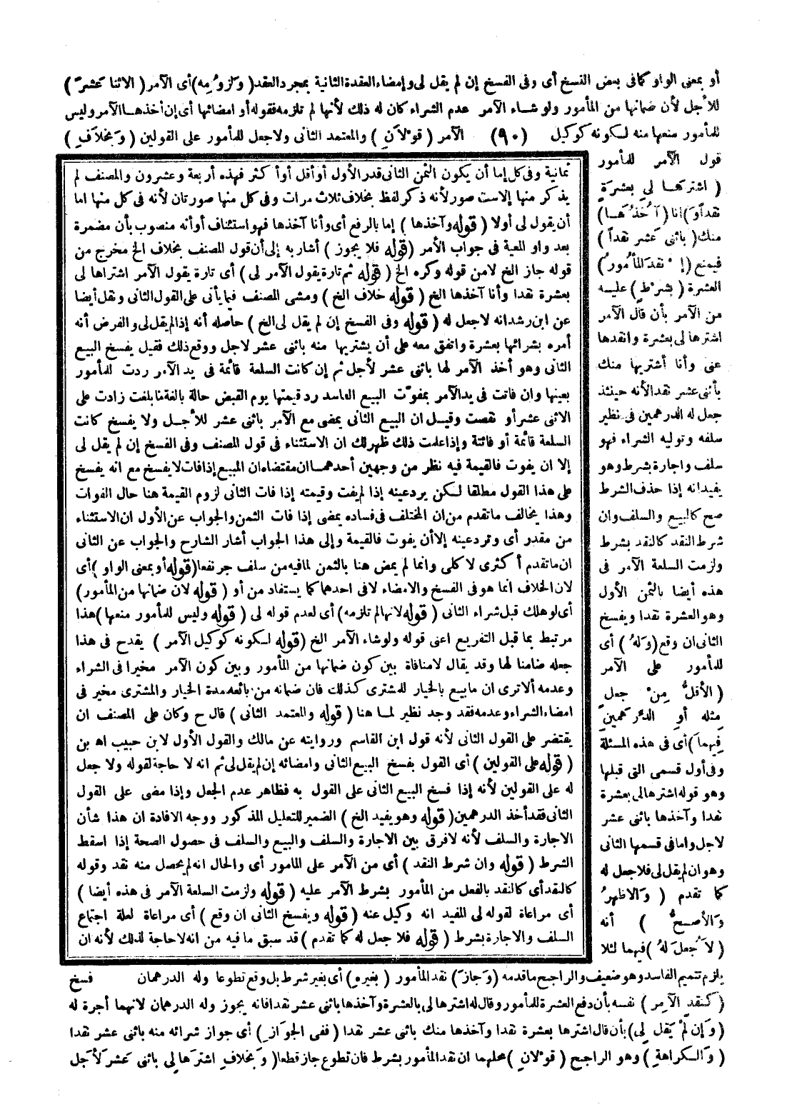 ـــــــــــــــــــــــــــــQثَمَانِيَةٌ وَفِي كُلٍّ إمَّا أَنْ يَكُونَ الثَّمَنُ الثَّانِي قَدْرَ الْأَوَّلِ، أَوْ أَقَلَّ، أَوْ أَكْثَرَ فَهَذِهِ أَرْبَعَةٌ وَعِشْرُونَ وَالْمُصَنِّفُ لَمْ يَذْكُرْ مِنْهَا إلَّا سِتَّ صُوَرٍ؛ لِأَنَّهُ ذَكَرَ لَفْظَ بِخِلَافٍ ثَلَاثَ مَرَّاتٍ وَفِي كُلٍّ مِنْهَا صُورَتَانِ؛ لِأَنَّهُ فِي كُلٍّ مِنْهَا إمَّا أَنْ يَقُولَ لِي أَوْ لَا (قَوْلُهُ وَآخُذُهَا) إمَّا بِالرَّفْعِ أَيْ وَأَنَا آخُذُهَا فَهُوَ اسْتِئْنَافٌ، أَوْ أَنَّهُ مَنْصُوبٌ بِأَنْ مُضْمَرَةً بَعْدَ وَاوِ الْمَعِيَّةِ فِي جَوَابِ الْأَمْرِ (قَوْلُهُ فَلَا يَجُوزُ) أَشَارَ بِهِ إلَى أَنَّ قَوْلَ الْمُصَنِّفِ بِخِلَافِ إلَخْ مُخَرَّجٌ مِنْ قَوْلِهِ جَازَ إلَخْ لَا مِنْ قَوْلِهِ وَكُرِهَ إلَخْ (قَوْلُهُ ثُمَّ تَارَةً يَقُولُ الْآمِرُ لِي) أَيْ تَارَةً يَقُولُ الْآمِرُ اشْتَرَاهَا لِي بِعَشْرَةٍ نَقْدًا، وَأَنَا آخُذُهَا إلَخْ (قَوْلُهُ خِلَافٌ إلَخْ) وَمَشَى الْمُصَنِّفُ فِيمَا يَأْتِي عَلَى الْقَوْلِ الثَّانِي وَنَقَلَ أَيْضًا عَنْ ابْنِ رُشْدٍ أَنَّهُ لَا جُعْلَ لَهُ (قَوْلُهُ وَفِي الْفَسْخِ إنْ لَمْ يَقُلْ لِي إلَخْ) حَاصِلُهُ أَنَّهُ إذَا لَمْ يَقُلْ لِي وَالْفَرْضُ أَنَّهُ أَمَرَهُ بِشِرَائِهَا بِعَشْرَةٍ وَاتَّفَقَ مَعَهُ عَلَى أَنْ يَشْتَرِيَهَا مِنْهُ بِاثْنَيْ عَشَرَ لِأَجَلٍ وَوَقَعَ ذَلِكَ فَقِيلَ يُفْسَخُ الْبَيْعُ الثَّانِي، وَهُوَ أَخْذُ الْآمِرِ لَهَا بِاثْنَيْ عَشَرَ لِأَجَلٍ، ثُمَّ إنْ كَانَتْ السِّلْعَةُ قَائِمَةً فِي يَدِ الْآمِرِ رُدَّتْ لِلْمَأْمُورِ بِعَيْنِهَا، وَإِنْ فَاتَتْ فِي يَدِ الْآمِرِ بِمُفَوِّتِ الْبَيْعِ الْفَاسِدِ رَدَّ قِيمَتَهَا يَوْمَ الْقَبْضِ حَالَّةً بَالِغَةً مَا بَلَغَتْ زَادَتْ عَلَى الِاثْنَيْ عَشَرَ، أَوْ نَقَصَتْ وَقِيلَ إنَّ الْبَيْعَ الثَّانِيَ يَمْضِي مَعَ الْآمِرِ بِاثْنَيْ عَشَرَ لِلْأَجَلِ وَلَا يُفْسَخُ كَانَتْ السِّلْعَةُ قَائِمَةً، أَوْ فَائِتَةً، وَإِذَا عَلِمْت ذَلِكَ ظَهَرَ لَك أَنَّ الِاسْتِثْنَاءَ فِي قَوْلِ الْمُصَنِّفِ وَفِي الْفَسْخِ إنْ لَمْ يَقُلْ لِي إلَّا أَنْ يَفُوتَ فَالْقِيمَةُ فِيهِ نَظَرٌ مِنْ وَجْهَيْنِ: أَحَدِهِمَا أَنَّ مُقْتَضَاهُ أَنَّ الْمَبِيعَ إذَا فَاتَ لَا يُفْسَخُ مَعَ أَنَّهُ يُفْسَخُ عَلَى هَذَا الْقَوْلِ مُطْلَقًا لَكِنْ يُرَدُّ عَيْنُهُ إذَا لَمْ يَفُتْ وَقِيمَتُهُ إذَا فَاتَ الثَّانِي لَزِمَ الْقِيمَةُ هُنَا حَالَ الْفَوَاتِ وَهَذَا يُخَالِفُ مَا تَقَدَّمَ مِنْ أَنَّ الْمُخْتَلَفَ فِي فَسَادِهِ يَمْضِي إذَا فَاتَ الثَّمَنُ وَالْجَوَابُ عَنْ الْأَوَّلِ أَنَّ الِاسْتِثْنَاءَ مِنْ مُقَدَّرٍ أَيْ وَتُرَدُّ عَيْنُهُ إلَّا أَنْ يَفُوتَ فَالْقِيمَةُ وَإِلَى هَذَا الْجَوَابِ أَشَارَ الشَّارِحُ وَالْجَوَابُ عَنْ الثَّانِي أَنَّ مَا تَقَدَّمَ أَكْثَرِيٌّ لَا كُلِّيٌّ وَإِنَّمَا لَمْ يَمْضِ هُنَا بِالثَّمَنِ لِمَا فِيهِ مِنْ سَلَفٍ جَرَّ نَفْعًا.
