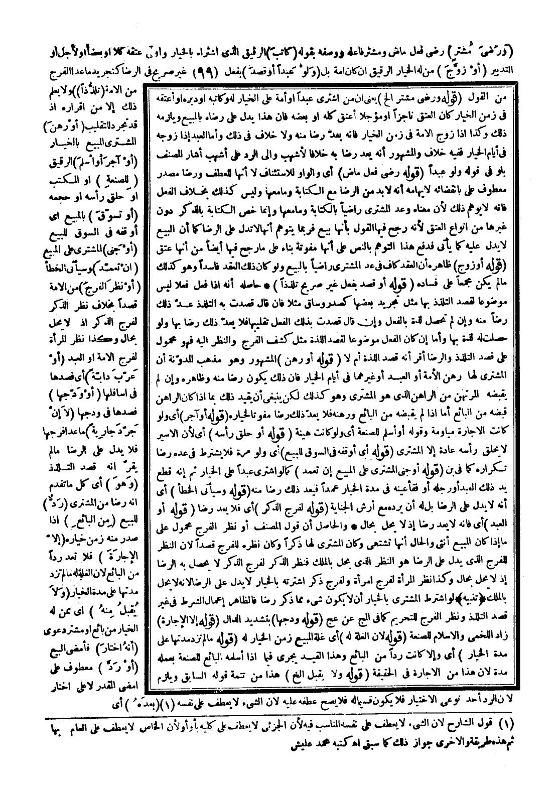 ـــــــــــــــــــــــــــــQمِنْ الْقَوْلِ (قَوْلُهُ وَرِضَا مُشْتَرٍ إلَخْ) يَعْنِي أَنَّ مَنْ اشْتَرَى عَبْدًا، أَوْ أَمَةً عَلَى الْخِيَارِ لَهُ وَكَاتَبَهُ، أَوْ دَبَّرَهُ، أَوْ أَعْتَقَهُ فِي زَمَنِ الْخِيَارِ كَانَ الْعِتْقُ نَاجِزًا، أَوْ مُؤَجَّلًا أَعْتَقَ كُلَّهُ، أَوْ بَعْضَهُ فَإِنَّ هَذَا يَدُلُّ عَلَى رِضَاهُ بِالْمَبِيعِ وَيَلْزَمُهُ ذَلِكَ، وَكَذَا إذَا زَوَّجَ الْأَمَةَ فِي زَمَنِ الْخِيَارِ فَإِنَّهُ يُعَدُّ رِضًا مِنْهُ وَلَا خِلَافَ فِي ذَلِكَ، وَأَمَّا الْعَبْدُ إذَا زَوَّجَهُ فِي أَيَّامِ الْخِيَارِ فَفِيهِ خِلَافٌ وَالْمَشْهُورُ أَنَّهُ يُعَدُّ رِضًا بِهِ خِلَافًا لِأَشْهَبَ وَإِلَى الرَّدِّ عَلَى أَشْهَبَ أَشَارَ الْمُصَنِّفُ بِلَوْ فِي قَوْلِهِ، وَلَوْ عَبْدًا (قَوْلُهُ رَضِيَ فِعْلٌ مَاضٍ) أَيْ وَالْوَاوُ لِلِاسْتِئْنَافِ لَا أَنَّهَا لِلْعَطْفِ وَرِضَا مَصْدَرٌ مَعْطُوفٌ عَلَى بِانْقِضَائِهِ لِإِيهَامِهِ أَنَّهُ لَا بُدَّ مِنْ الرِّضَا مَعَ الْكِتَابَةِ وَمَا مَعَهَا وَلَيْسَ كَذَلِكَ بِخِلَافِ الْفِعْلِ فَإِنَّهُ لَا يُوهِمُ ذَلِكَ؛ لِأَنَّ مَعْنَاهُ وَعُدَّ الْمُشْتَرِي رَاضِيًا بِالْكِتَابَةِ وَمَا مَعَهَا وَإِنَّمَا خَصَّ الْكِتَابَةَ بِالذِّكْرِ دُونَ غَيْرِهَا مِنْ أَنْوَاعِ الْعِتْقِ؛ لِأَنَّهُ رَجَّحَ فِيهَا الْقَوْلَ بِأَنَّهَا بَيْعٌ فَرُبَّمَا يُتَوَهَّمُ أَنَّهَا لَا تَدُلُّ عَلَى الرِّضَا كَمَا أَنَّ الْبَيْعَ لَا يَدُلُّ عَلَيْهِ كَمَا يَأْتِي فَدَفْعُ هَذَا التَّوَهُّمِ بِالنَّصِّ عَلَى أَنَّهَا مُفَوِّتَةٌ بِنَاءً عَلَى مَا رَجَحَ فِيهَا أَيْضًا مِنْ أَنَّهَا عِتْقٌ.