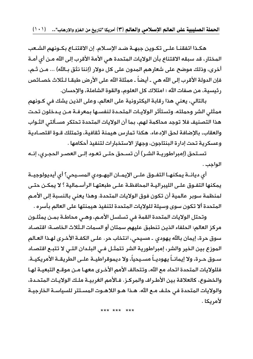 هكذا اتفقنا على تكوين جبهة ضد الإسلام. إن الاقتناع بكونهم الشعب المختار، قد سبقه الاقتناع بأن الولايات المتحدة هي الأمة الأقرب إلى الله من أي أمة أخرى، وذلك موضح على شعارهم المدون على كل دولار (إننا نثق بالله) ... من ثم، فإن الدولة الأقرب إلى الله هي ـ أيضاً ـ ممثلة الله على الأرض طبقا لثلاث خصائص رئيسية، من صفات الله: امتلاك كل العلوم، والقوة الشاملة، والإحسان.
