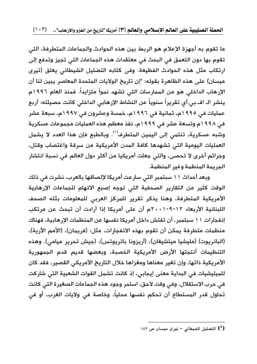 ما تقوم به أجهزة الإعلام هو الربط بين هذه الحوادث والجماعات المتطرفة، التي تقوم بها دون التعمق في البحث في معتقدات هذه الجماعات التي تجيز وتدفع إلى ارتكاب مثل هذه الحوادث الفظيعة. وفي كتابه التضليل الشيطاني يعلق (تيرى ميسان) على هذه الظاهرة بقوله: "إن تاريخ الولايات المتحدة المعاصر يبين لنا أن الإرهاب الداخلي هو من الممارسات التي تشهد نمواً متزايداً. فمنذ العام 1996م ينشر الـ اف. بي. آي تقريراً سنوياً عن النشاط الإرهابي الداخلي كانت حصيلته: أربع عمليات في 1995م، ثمانية في 1996م، خمسة وعشرون في 1997م، سبعة عشر في 1998م وتسعة عشر في 1999م، نفذ معظم هذه العمليات مجموعات عسكرية وشبه عسكرية، تنتمي إلى اليمين المتطرف (¬1). وبالطبع فإن هذا العدد لا يشمل العمليات اليومية التي تشهدها كافة المدن الأمريكية من سرقة واغتصاب وقتل، وجرائم أخرى لا تحصى، والتي جعلت أمريكيا من أكثر دول العالم في نسبة انتشار الجريمة المنظمة وغير المنظمة.