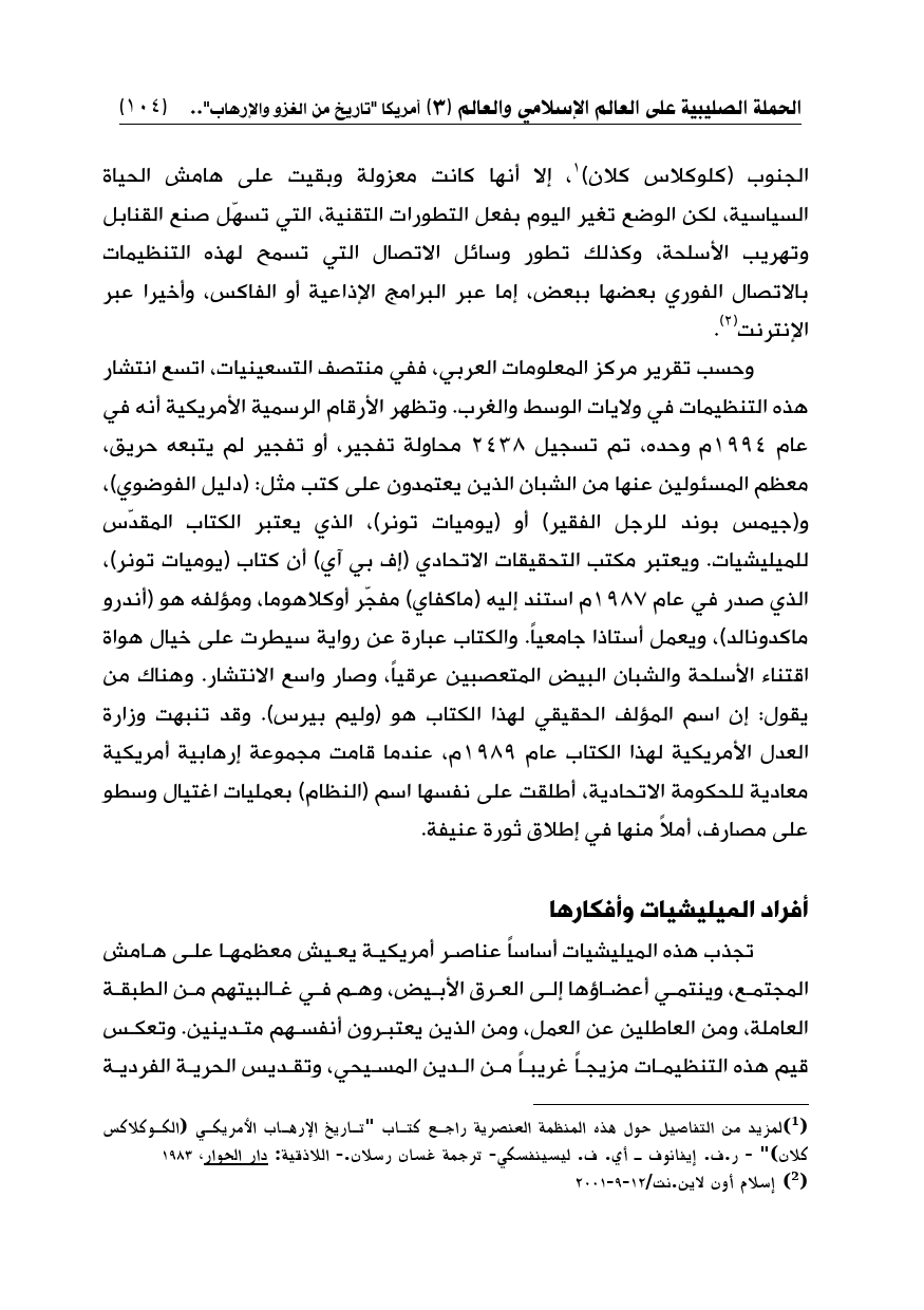 (¬1) لمزيد من التفاصيل حول هذه المنظمة العنصرية راجع كتاب "تاريخ الإرهاب الأمريكي (الكوكلاكس كلان) " - ر. ف. إيفانوف ـ أي. ف. ليسينفسكي- ترجمة غسان رسلان.- اللاذقية: دار الحوار، 1983