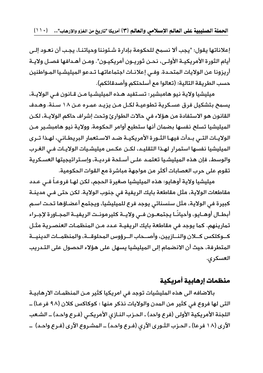 ميليشيا ولاية أوهايو: هذه الميليشيا صغيرة الحجم، لكن لها فروعاً في عدد مقاطعات الولاية، مثل مقاطعة بايك الريفية في جنوب الولاية. لكن حتى في مدينة كبيرة في الولاية، مثل سنسناتي يوجد فرع للميليشيا، ويجتمع أعضاؤها تحت اسم أبطال أوهايو، وأحيانًا يجتمعون في ولاية كليرمونت الريفية المجاورة لإجراء تمارينهم. كما يوجد في مقاطعة بايك الريفية عدد من المنظمات العنصرية مثل كوكلكس كلان والنازيين، وأصحاب الرؤوس المحلوقة، والمنظمات الدينية المتطرفة، حيث أن الانضمام إلى الميليشيا يسهل على هؤلاء الحصول على التدريب العسكري.