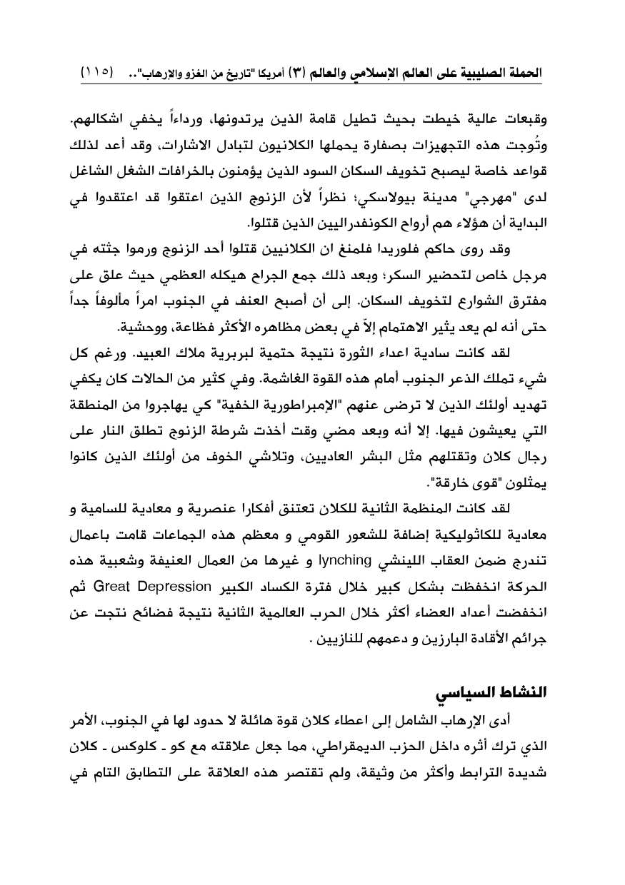وقد روى حاكم فلوريدا فلمنغ ان الكلانيين قتلوا أحد الزنوج ورموا جثته في مرجل خاص لتحضير السكر؛ وبعد ذلك جمع الجراح هيكله العظمي حيث علق على مفترق الشوارع لتخويف السكان. إلى أن أصبح العنف في الجنوب امراً مألوفاً جداً حتى أنه لم يعد يثير الاهتمام إلاّ في بعض مظاهره الأكثر فظاعة، ووحشية.