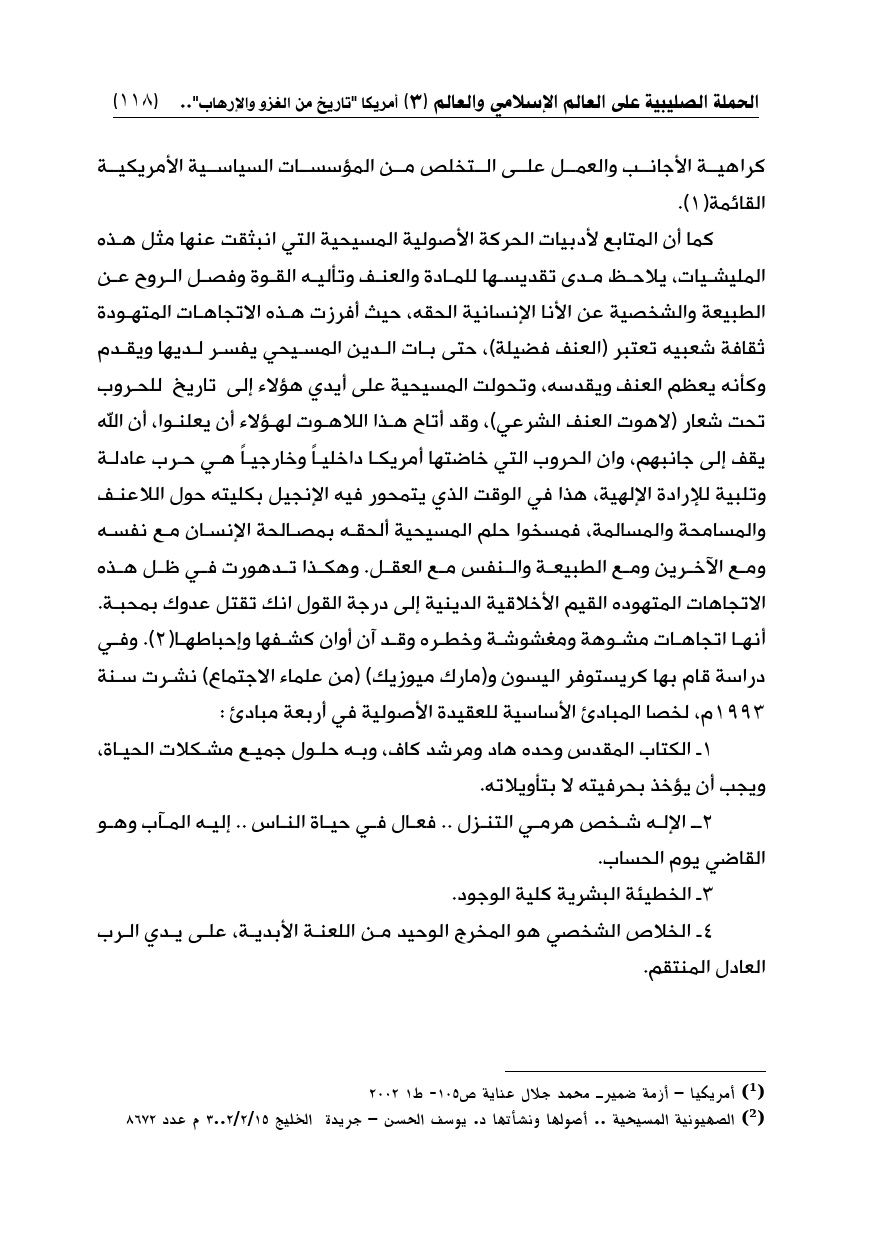 كما أن المتابع لأدبيات الحركة الأصولية المسيحية التي انبثقت عنها مثل هذه المليشيات، يلاحظ مدى تقديسها للمادة والعنف وتأليه القوة وفصل الروح عن الطبيعة والشخصية عن الأنا الإنسانية الحقه، حيث أفرزت هذه الاتجاهات المتهودة ثقافة شعبيه تعتبر (العنف فضيلة)، حتى بات الدين المسيحي يفسر لديها ويقدم وكأنه يعظم العنف ويقدسه، وتحولت المسيحية على أيدي هؤلاء إلى تاريخ للحروب تحت شعار (لاهوت العنف الشرعي)، وقد أتاح هذا اللاهوت لهؤلاء أن يعلنوا، أن الله يقف إلى جانبهم، وان الحروب التي خاضتها أمريكا داخلياً وخارجياً هي حرب عادلة وتلبية للإرادة الإلهية، هذا في الوقت الذي يتمحور فيه الإنجيل بكليته حول اللاعنف والمسامحة والمسالمة، فمسخوا حلم المسيحية ألحقه بمصالحة الإنسان مع نفسه ومع الآخرين ومع الطبيعة والنفس مع العقل. وهكذا تدهورت في ظل هذه الاتجاهات المتهوده القيم الأخلاقية الدينية إلى درجة القول انك تقتل عدوك بمحبة. أنها اتجاهات مشوهة ومغشوشة وخطره وقد آن أوان كشفها وإحباطها (¬2). وفي دراسة قام بها كريستوفر اليسون و (مارك ميوزيك) (من علماء الاجتماع) نشرت سنة 1993م، لخصا المبادئ الأساسية للعقيدة الأصولية في أربعة مبادئ: