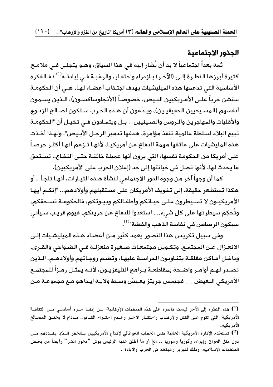 (¬1) هذه النظرة إلى الآخر ليست قاصرة على هذه المنظمات الإرهابية، بل إنها جزء أساسي من الثقافة الأمريكية، التي تقوم على القتل والإرهاب واحتقار الآخر وعدم احترام القانون مادام لا يحقق المصالح الأمريكية.
